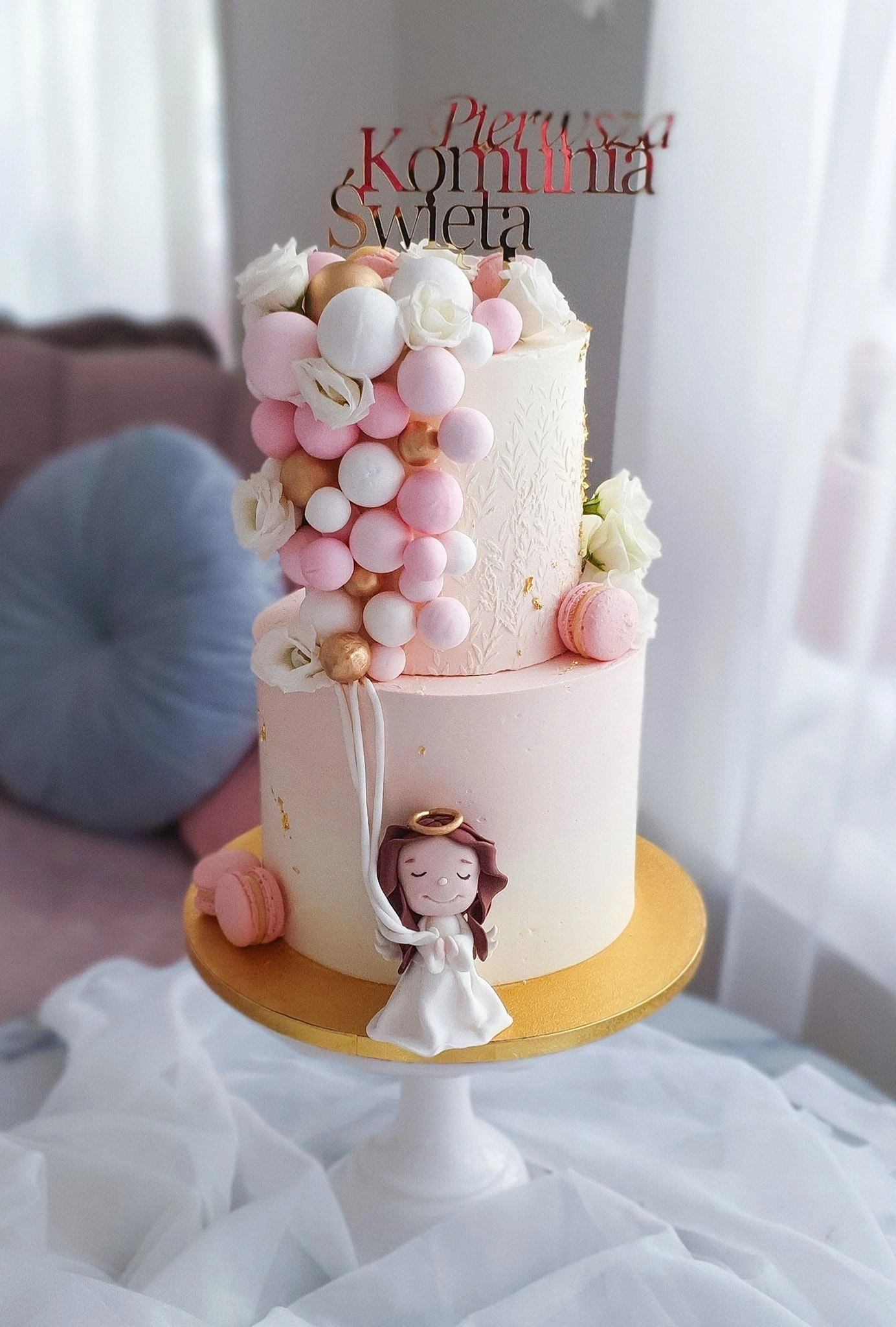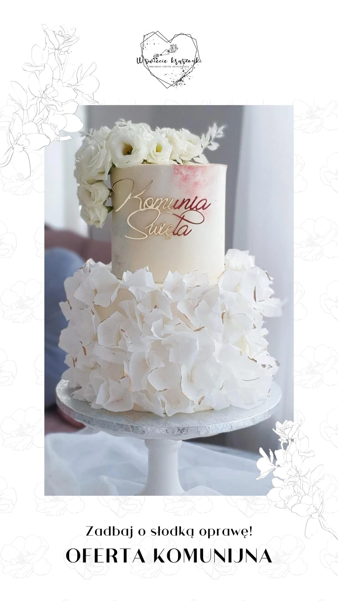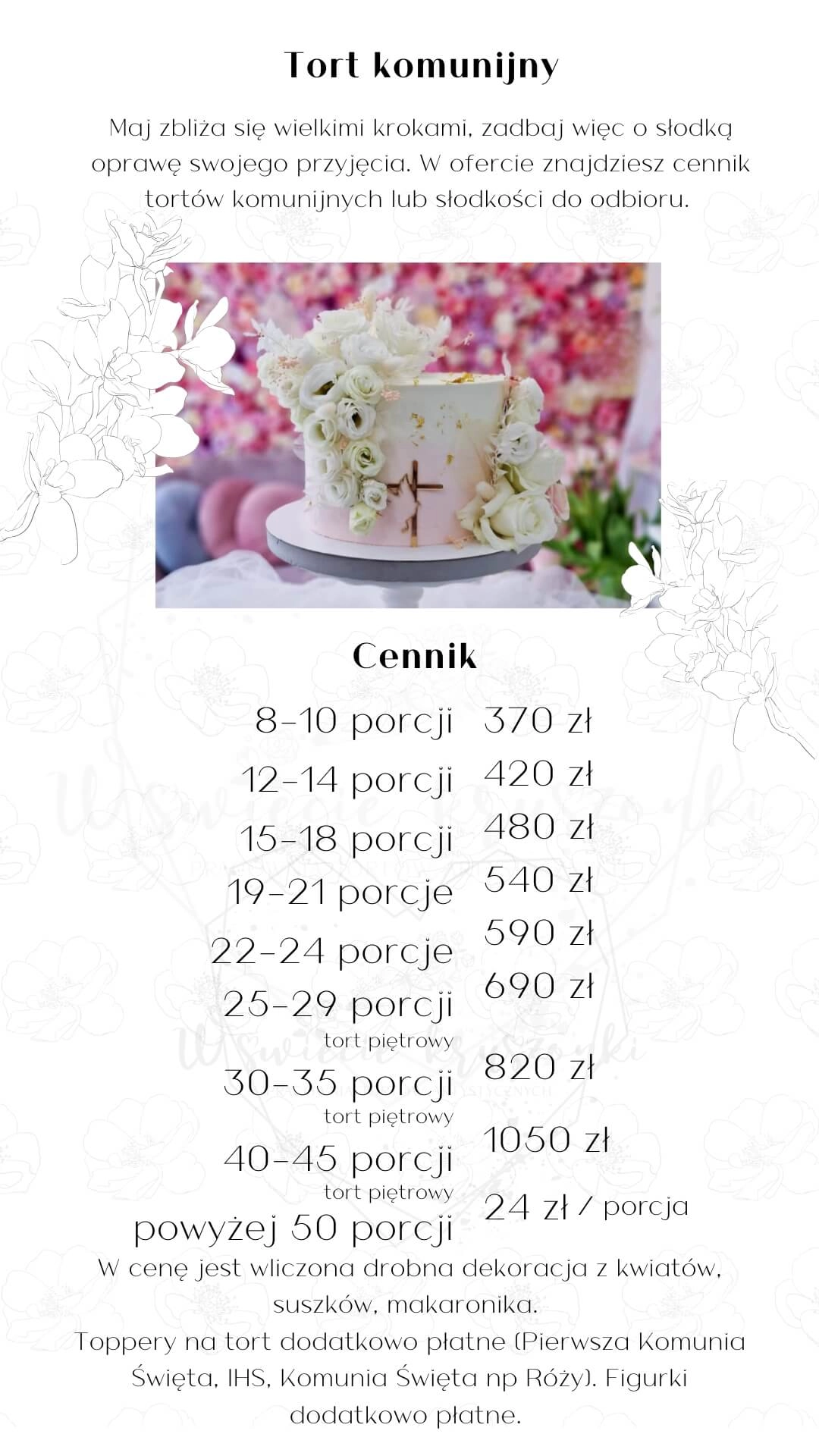 W cenę jest wliczona drobna dekoracja z kwiatów, suszków, makaronika. Toppery na tort dodatkowo płatne (Pierwsza Komunia Święta, IHS, Komunia Święta np Róży). Figurki dodatkowo płatne.