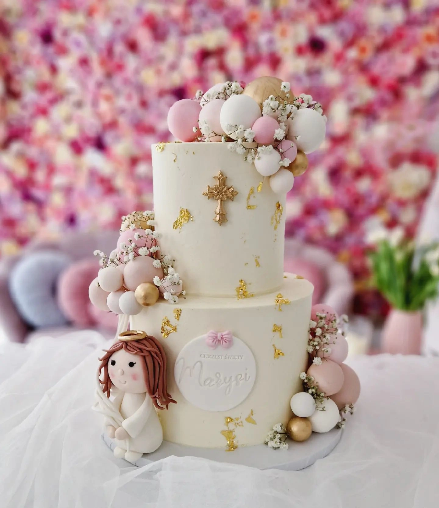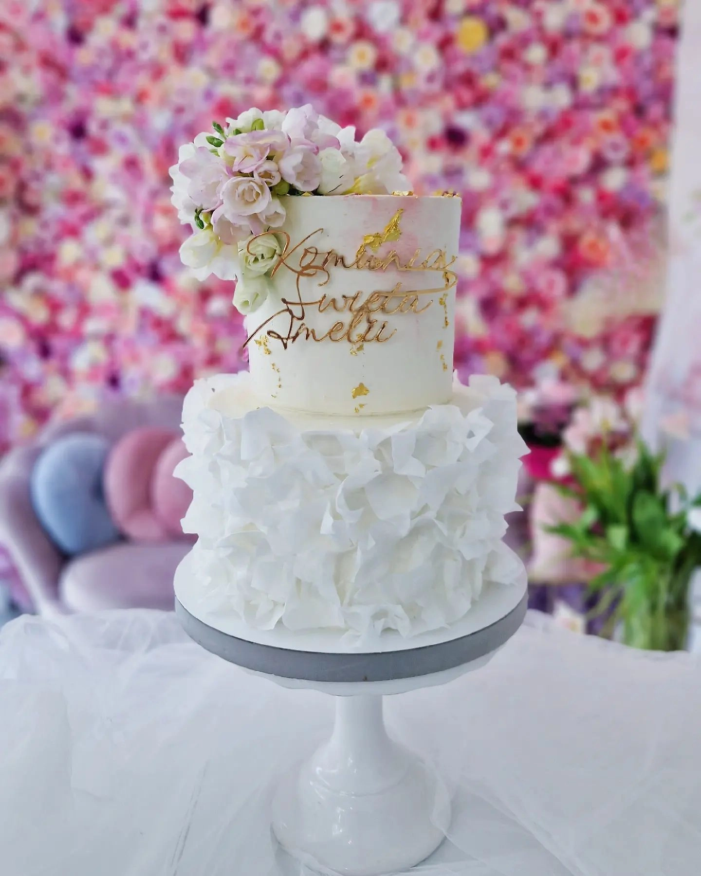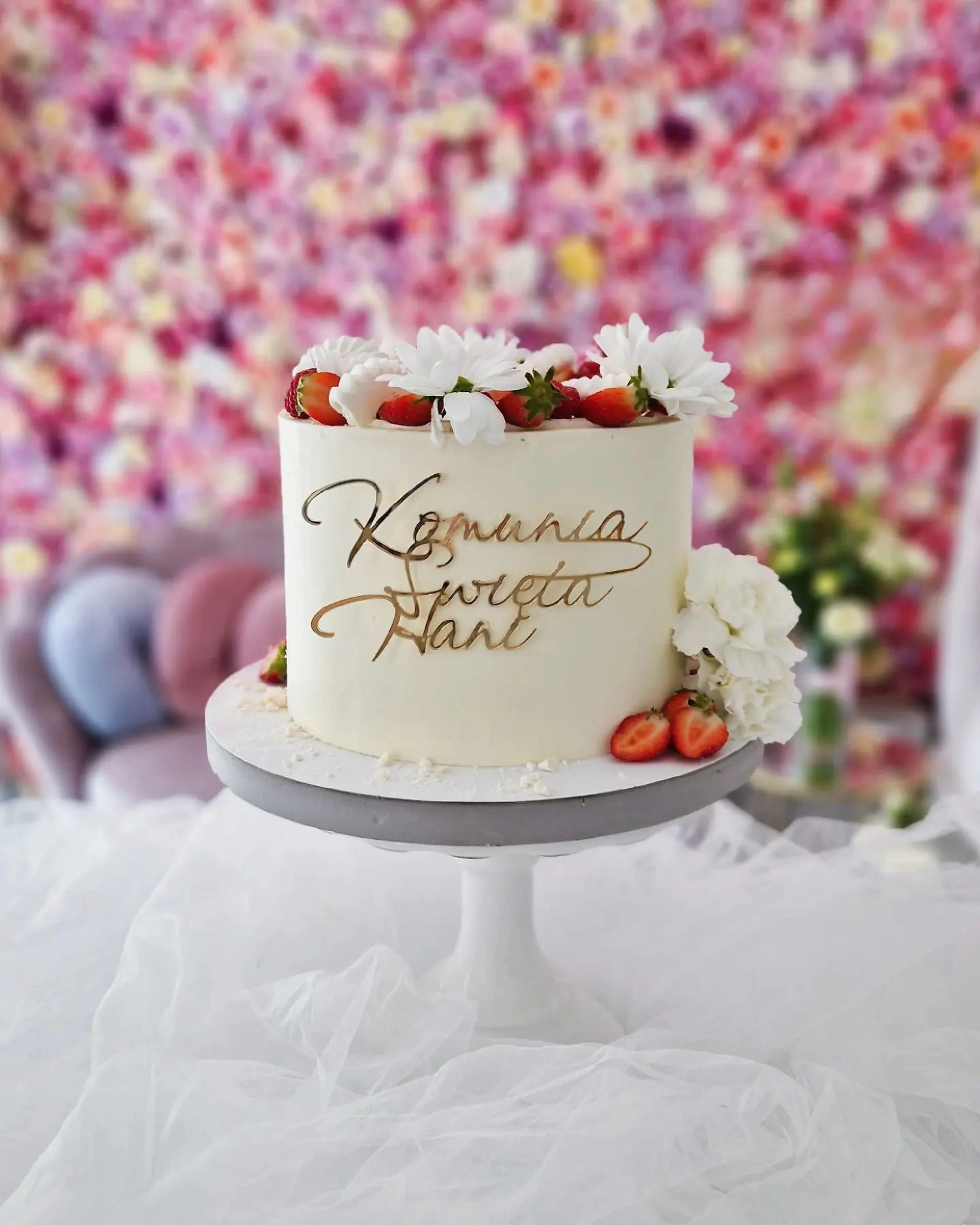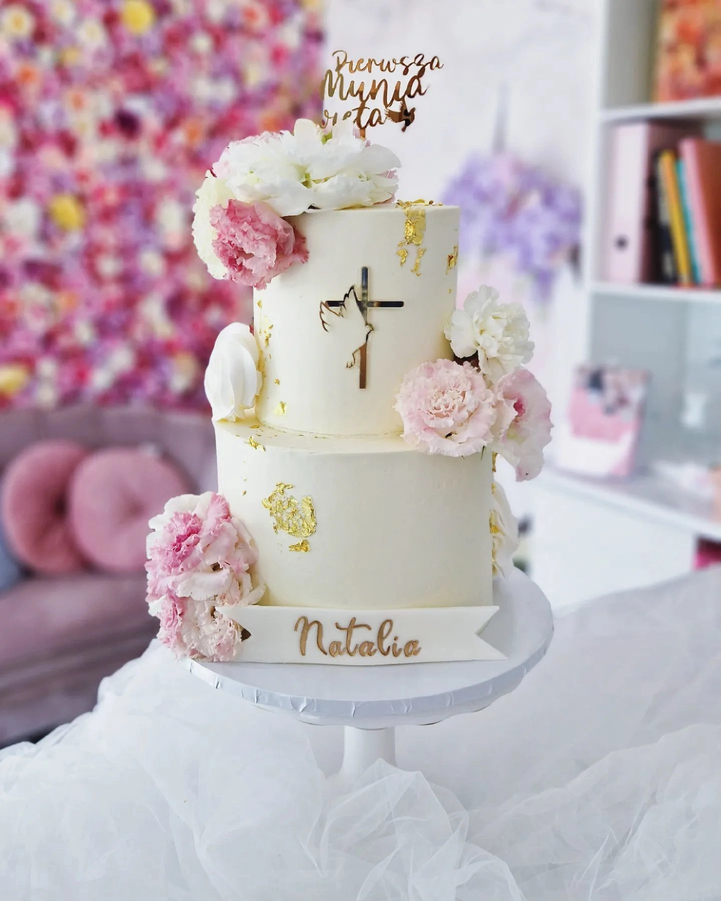 W cenę jest wliczona drobna dekoracja z kwiatów, suszków, makaronika. Toppery na tort dodatkowo płatne (Pierwsza Komunia Święta, IHS, Komunia Święta np Róży). Figurki dodatkowo płatne.