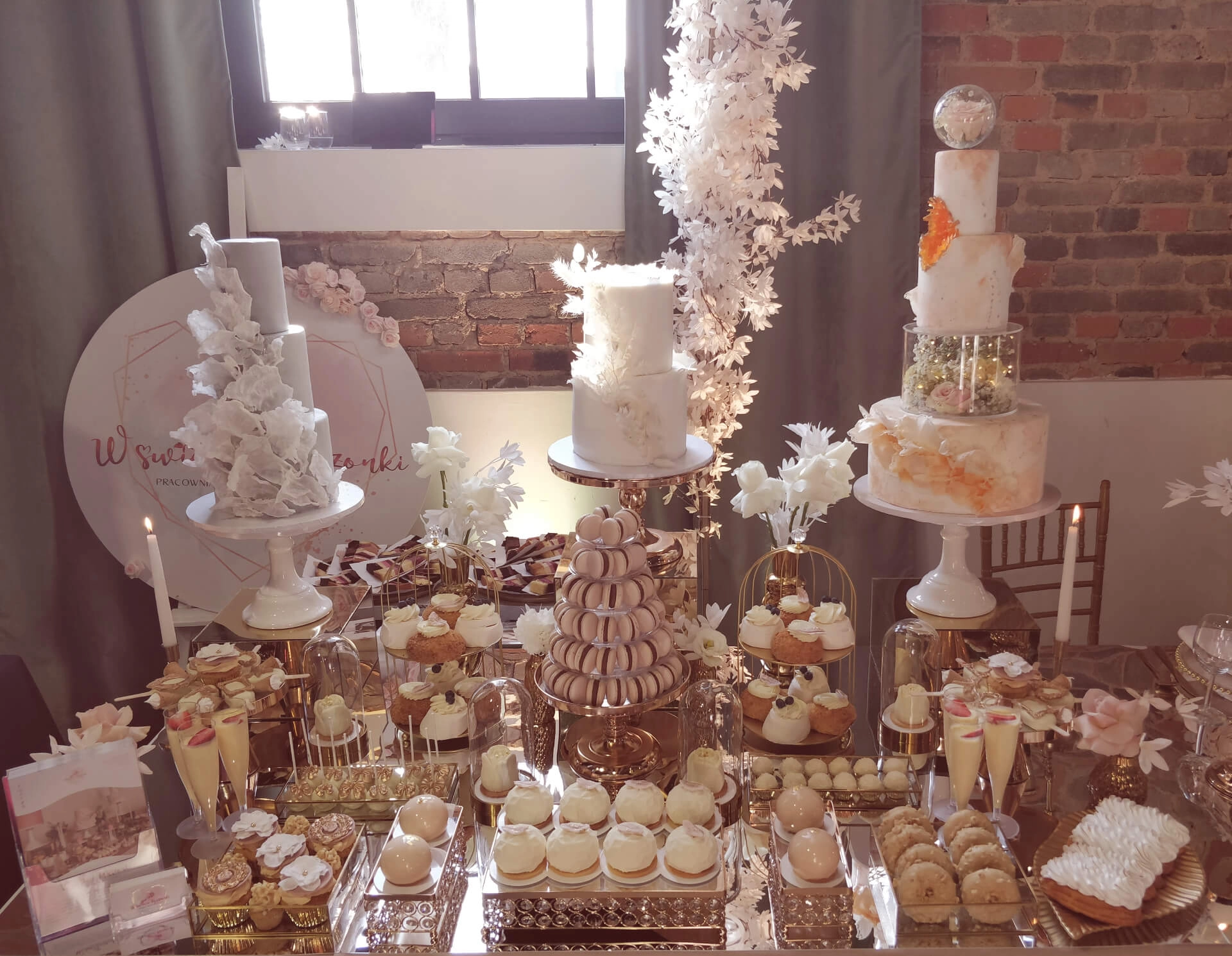 Założeniem było, żeby w taki niekonwencjonalny sposób zaprezentować całość usług jakie możecie mieć na swoim weselu! Tak więc stoiska wystawowe cukierni zostały w pewien sposób połączone z dekoratorami, żeby pokazać w pełni możliwości ujednolicenia dekoracji - tak żeby całość była ze sobą spójna.