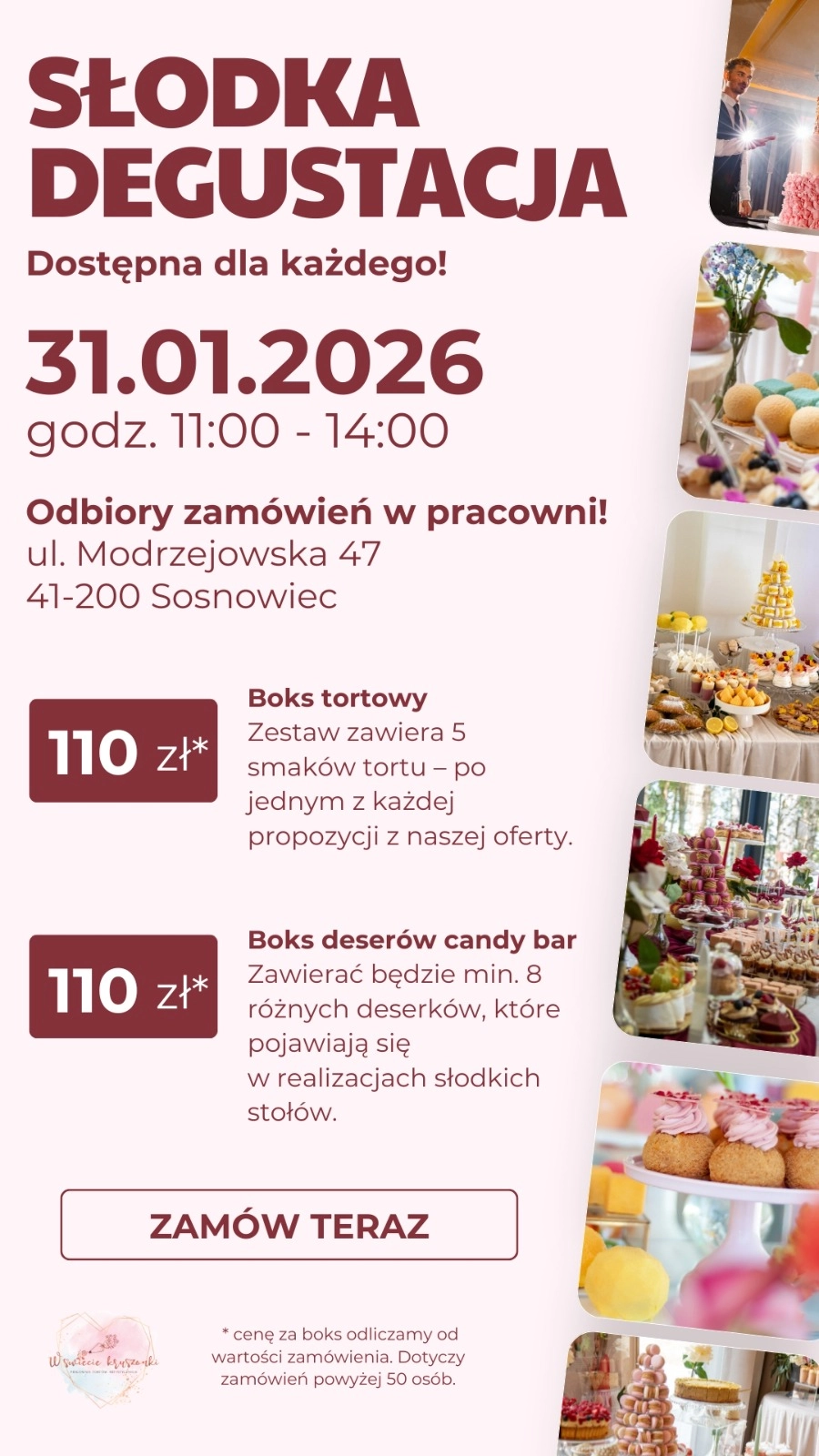 Jeśli po degustacji zdecydujecie się zamówić u nas tort lub słodki stół na przyjęcie powyżej 50 osób, wartość zamówionych boksów zostanie w całości odliczona od końcowej kwoty realizacji.