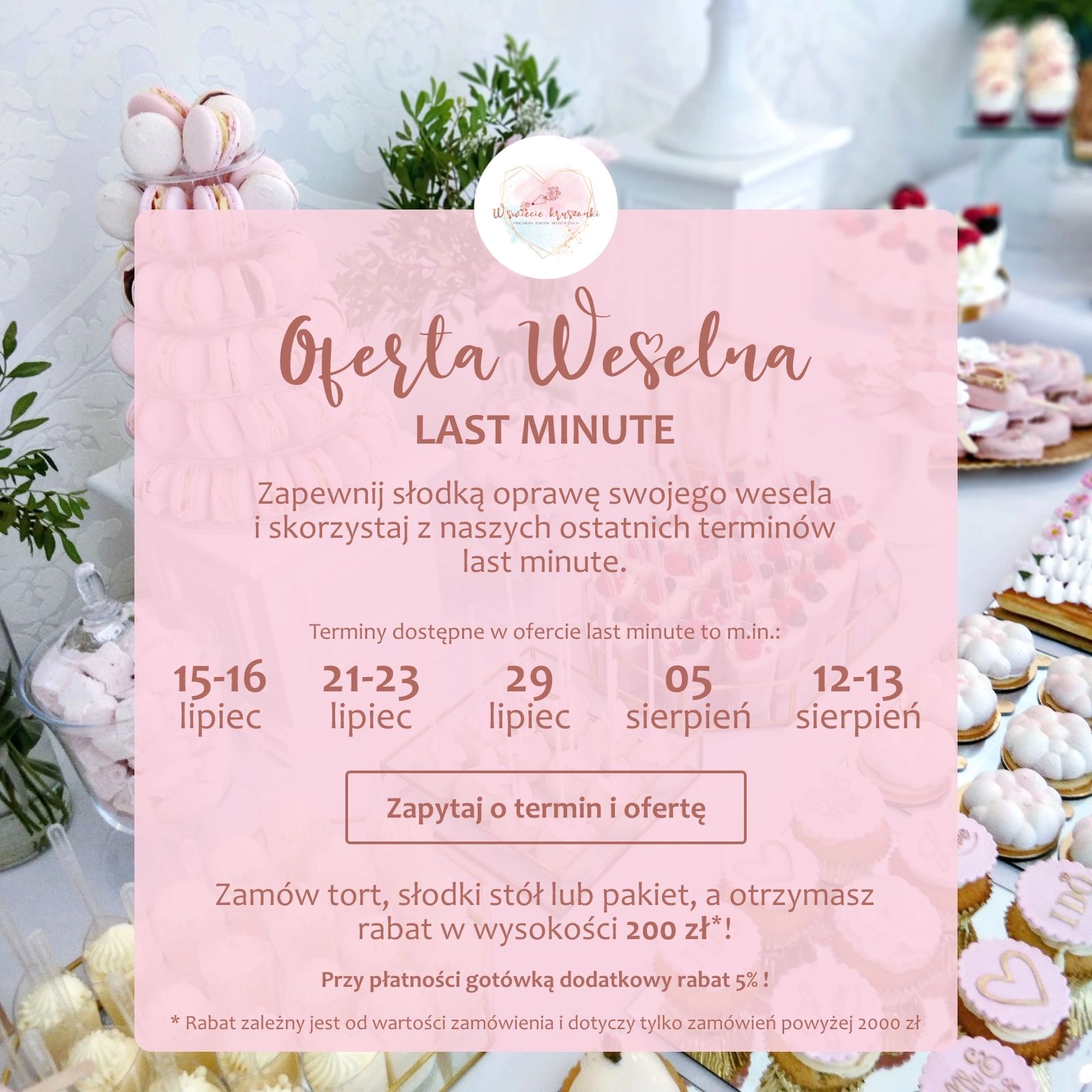 Jeśli organizujecie swoje przyjęcie weselne w innym terminie, pytajcie o jego dostępność! Być może uda nam się zrealizować dla Was słodką oprawę. Z chęcią osłodzimy dzień tak ważny dla Was i waszych gości. 🍰