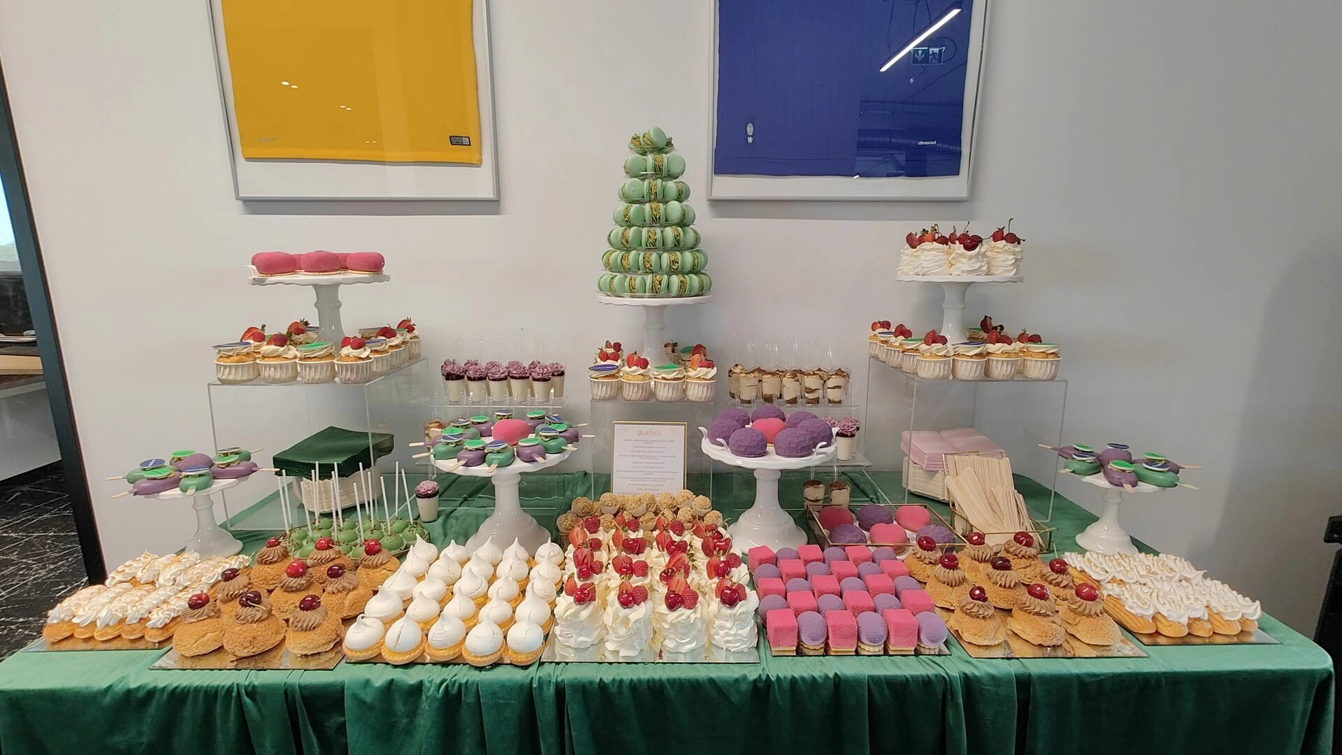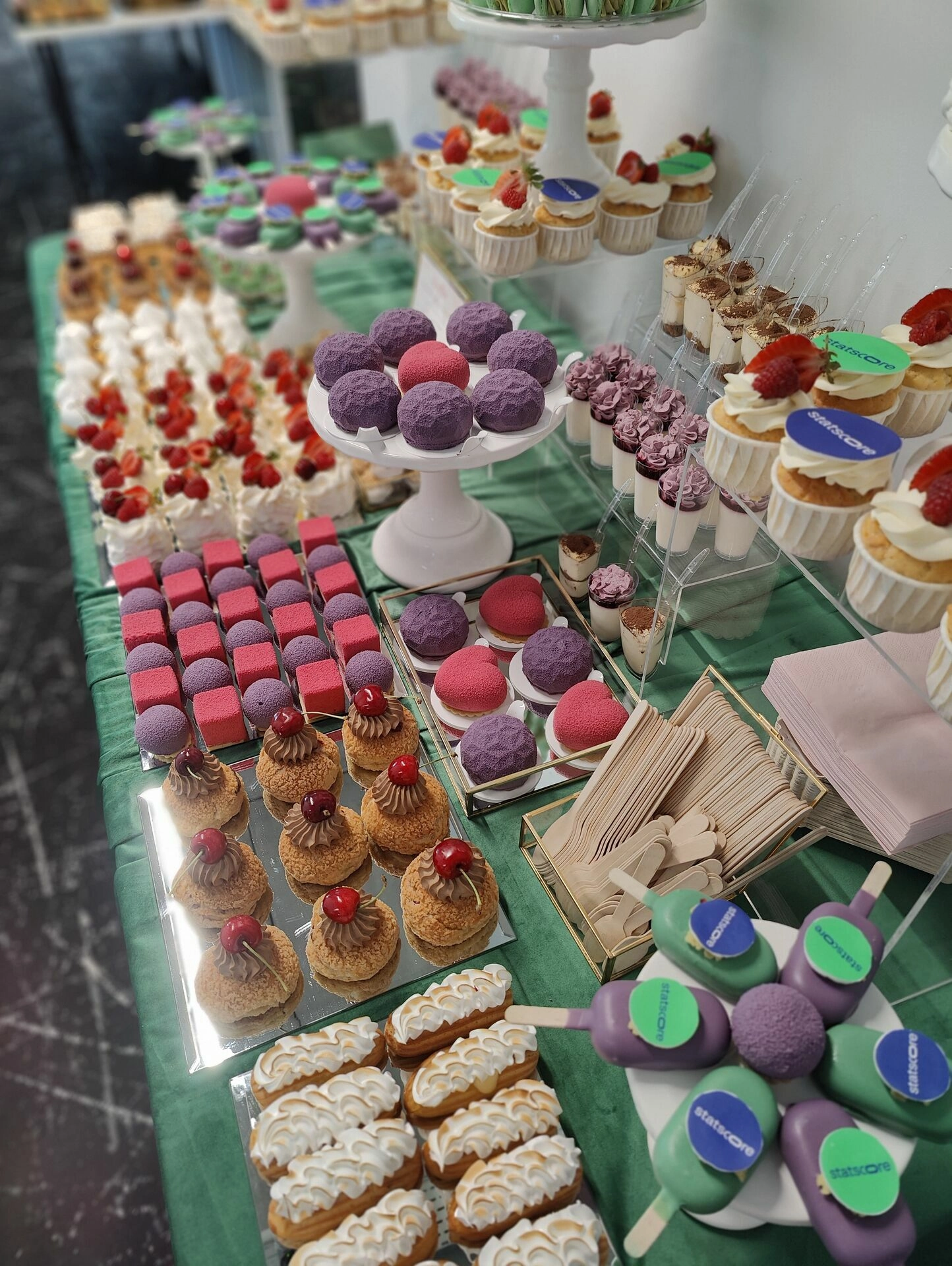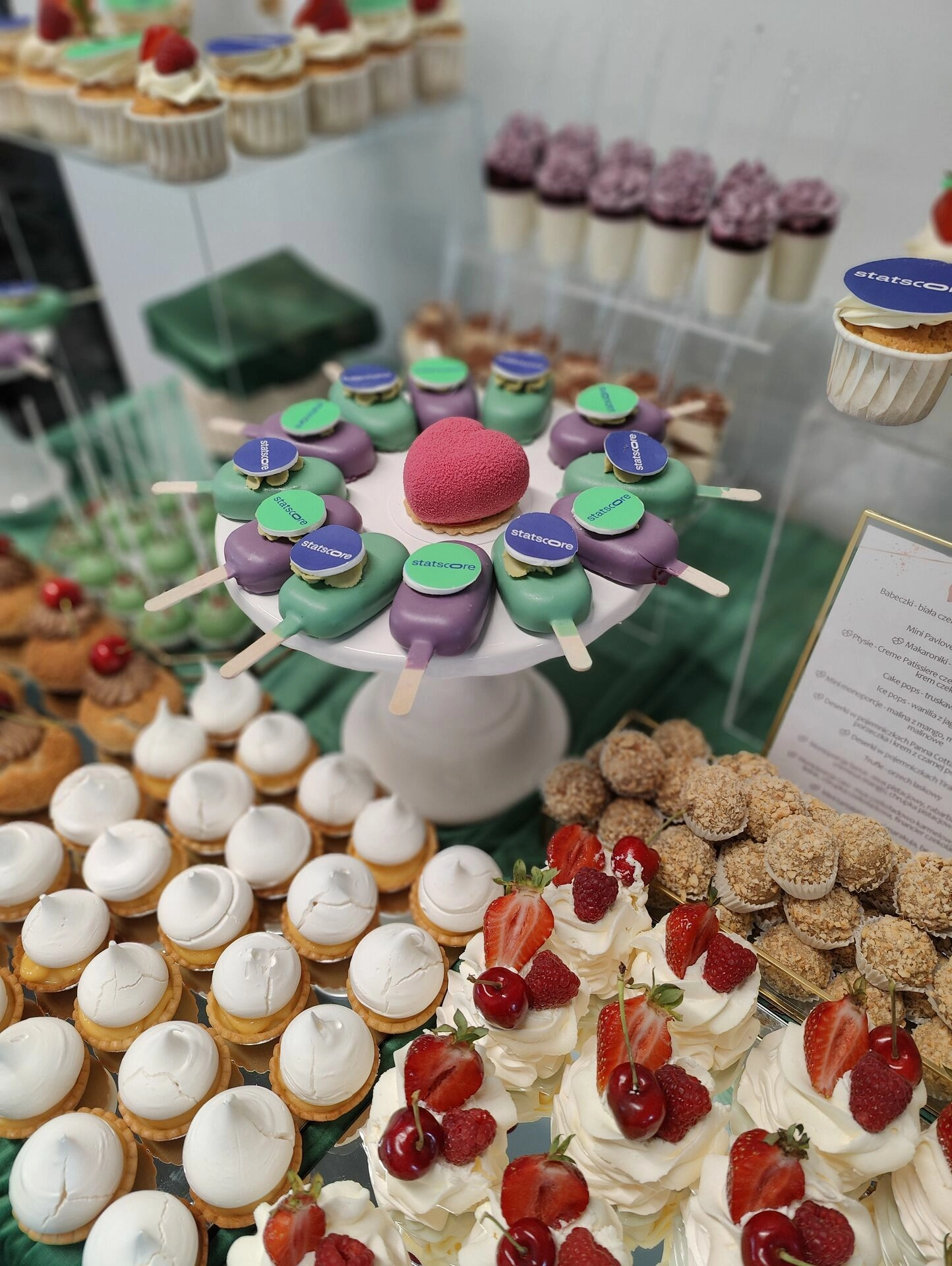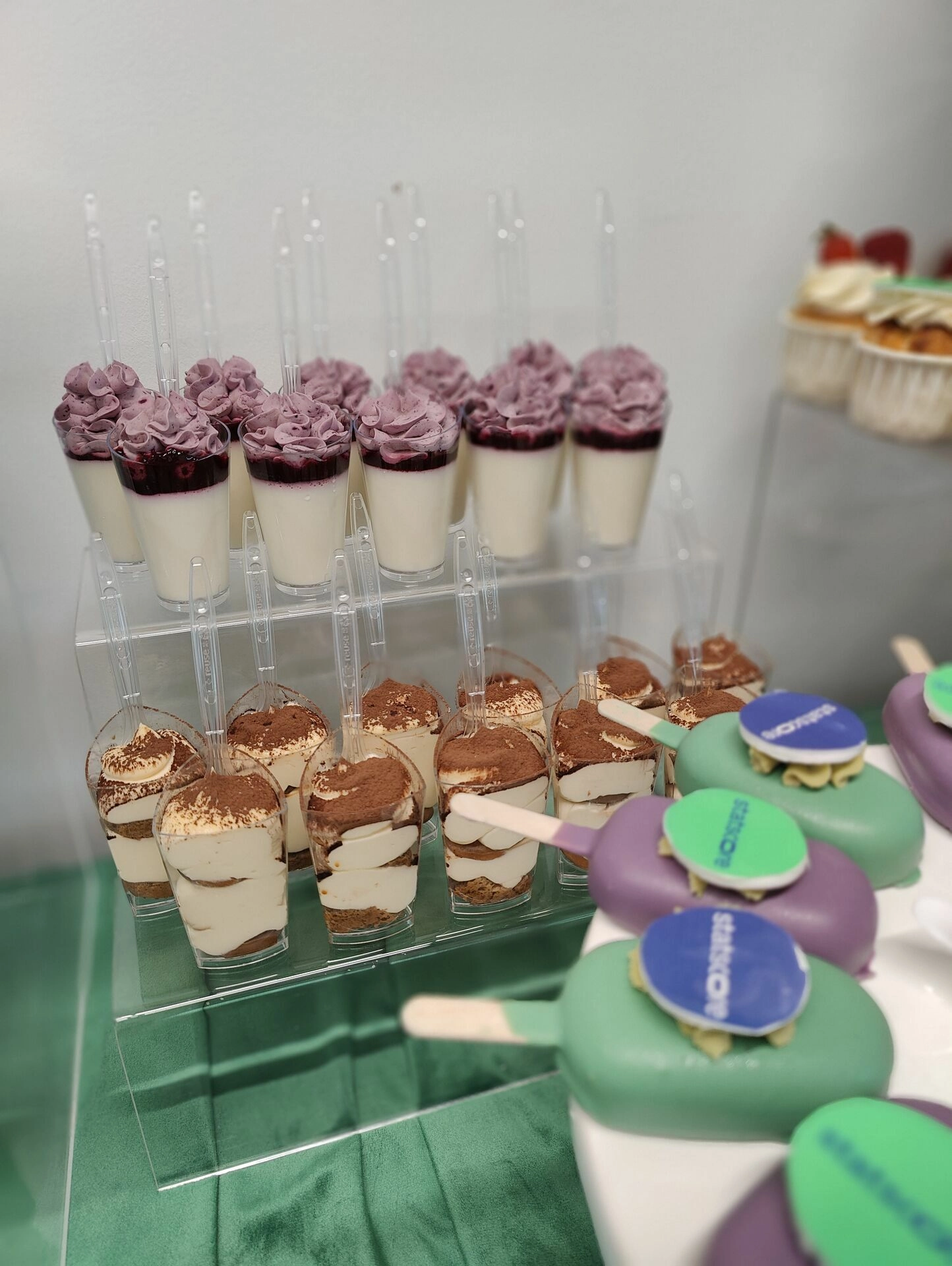 Słodki bufet został skomponowany tak, aby każdy znalazł coś dla siebie – od klasycznych smaków w nowoczesnej odsłonie, po odważne połączenia smakowe. Na stole znalazły się m.in. mini bezy z owocami, delikatne ptysie z kremami premium, efektowne monoporcje w intensywnych kolorach, musy w eleganckich kieliszkach, a także kreatywne cake pops i ice pops, które łączyły zabawny wygląd z wyrafinowanym smakiem. Kolorystyka – zieleń, fiolet, biel i akcenty różu – została dobrana tak, aby współgrać z brandingiem i wystrojem nowego biura, tworząc spójną, nowoczesną kompozycję.