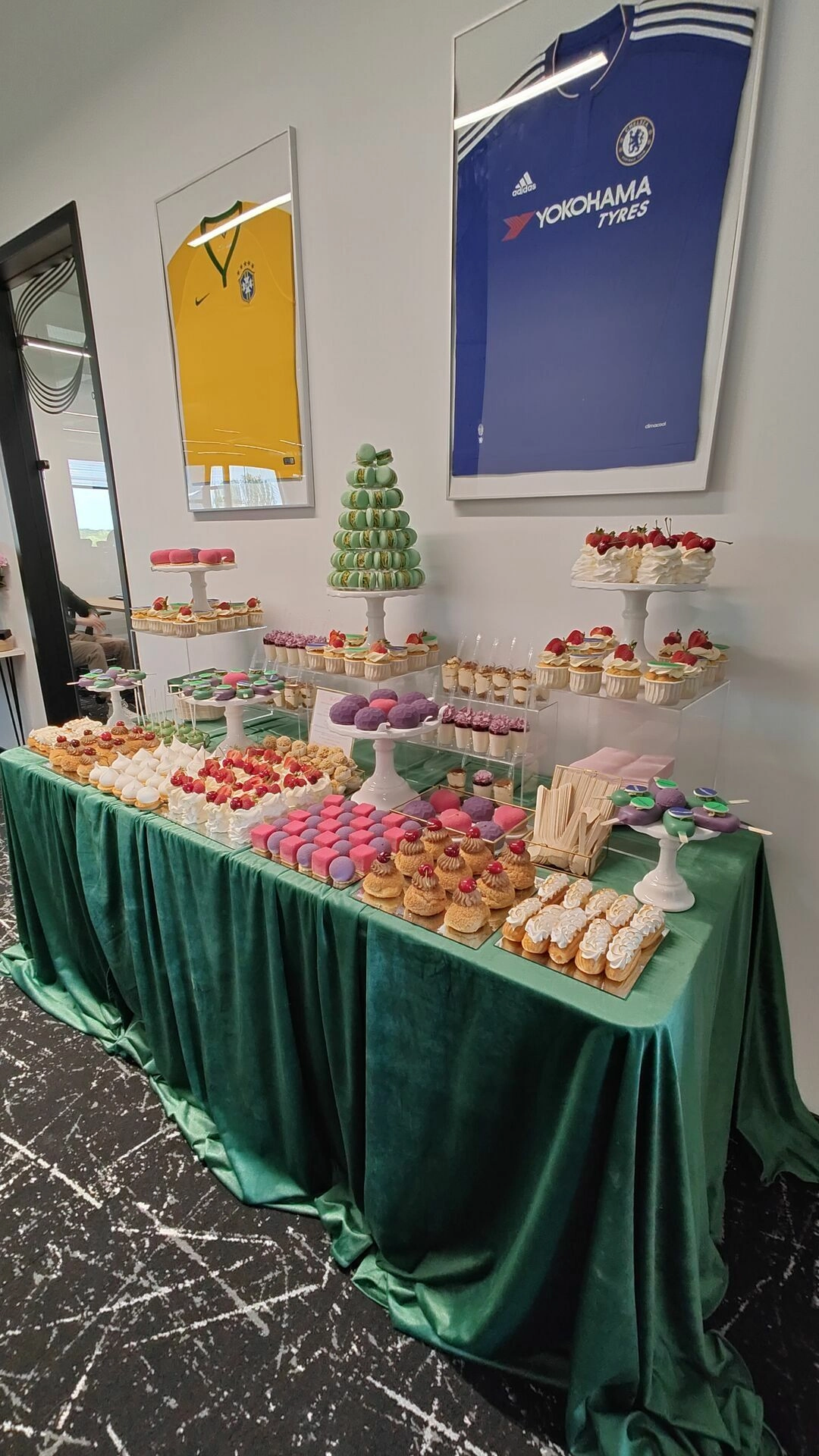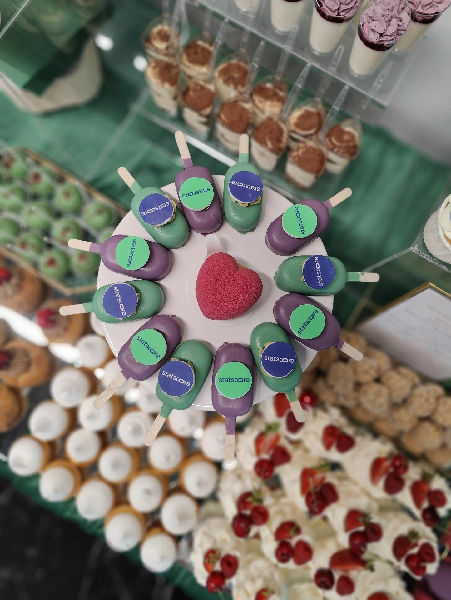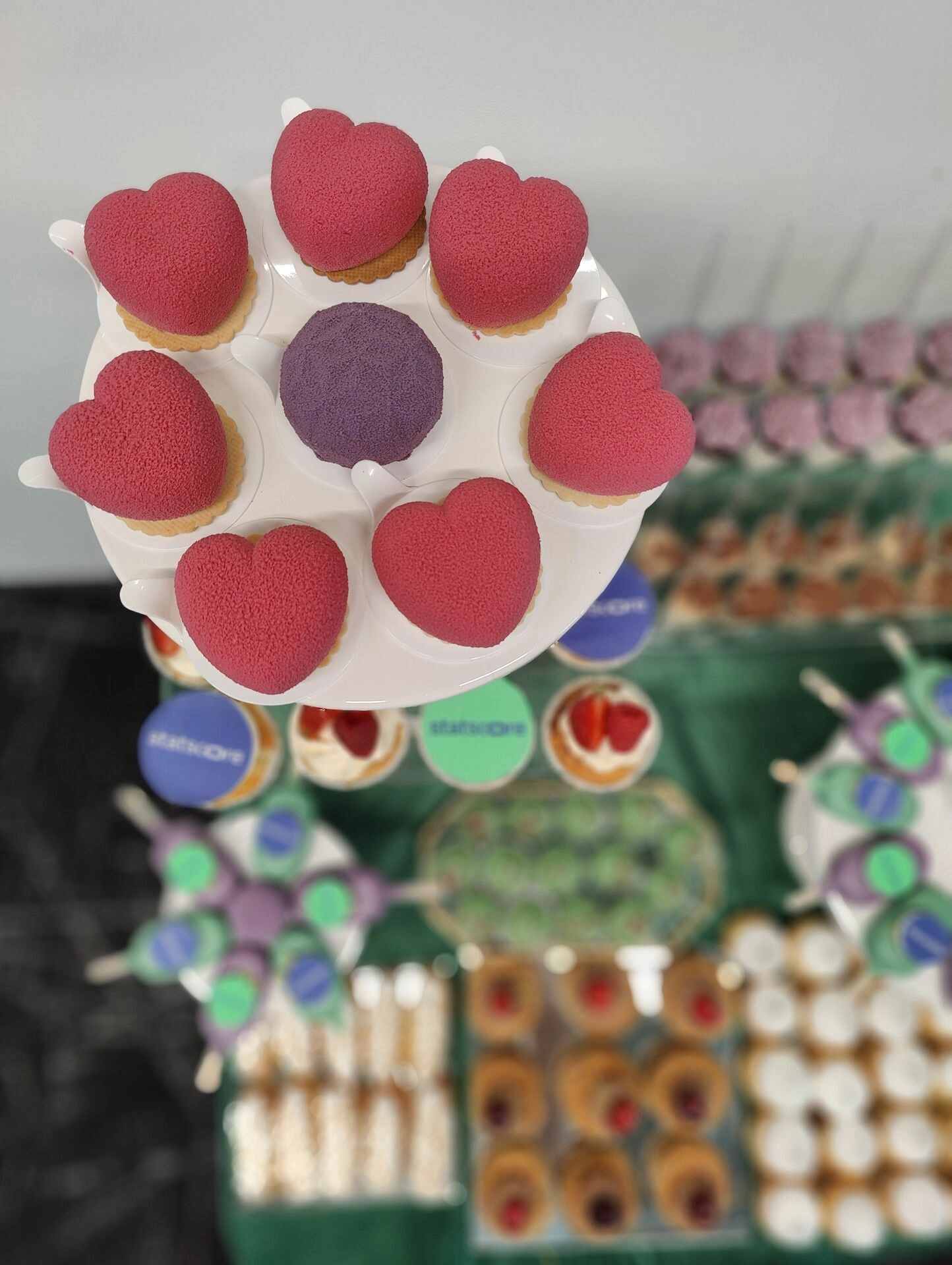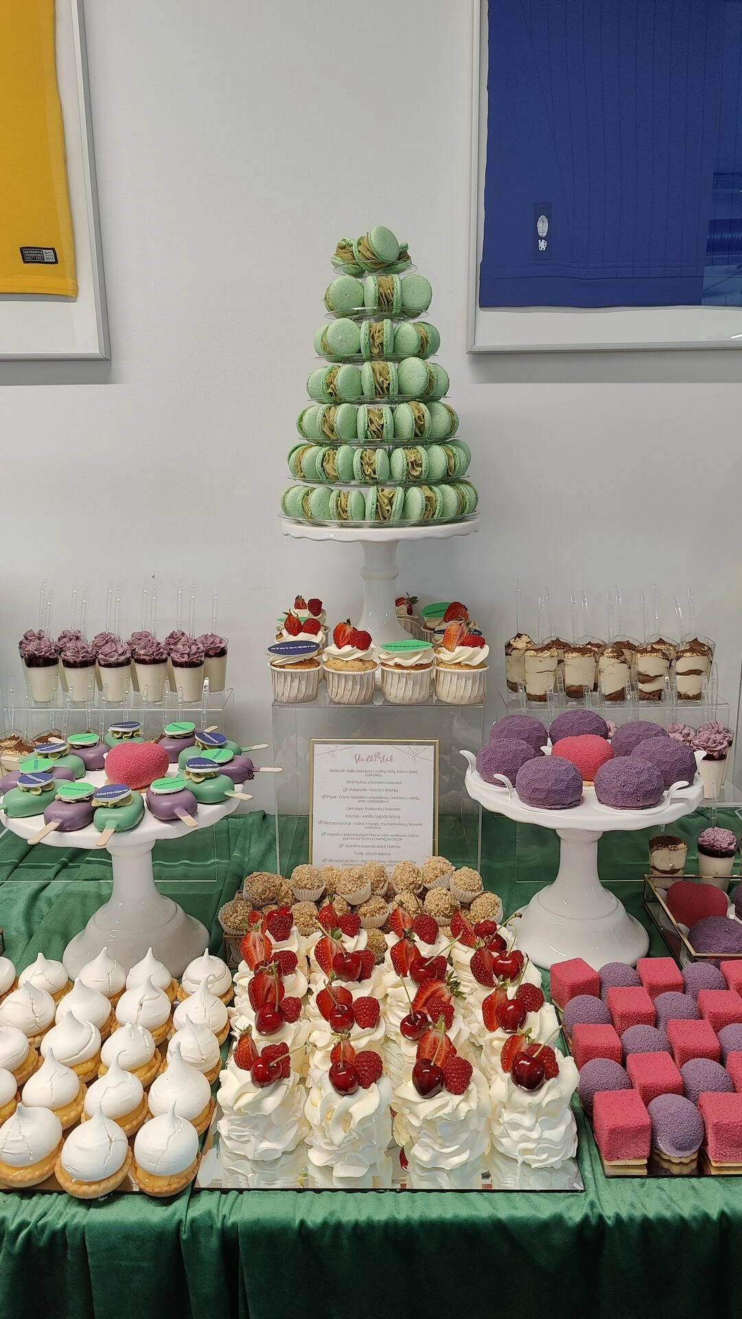 Słodki bufet został skomponowany tak, aby każdy znalazł coś dla siebie – od klasycznych smaków w nowoczesnej odsłonie, po odważne połączenia smakowe. Na stole znalazły się m.in. mini bezy z owocami, delikatne ptysie z kremami premium, efektowne monoporcje w intensywnych kolorach, musy w eleganckich kieliszkach, a także kreatywne cake pops i ice pops, które łączyły zabawny wygląd z wyrafinowanym smakiem. Kolorystyka – zieleń, fiolet, biel i akcenty różu – została dobrana tak, aby współgrać z brandingiem i wystrojem nowego biura, tworząc spójną, nowoczesną kompozycję.