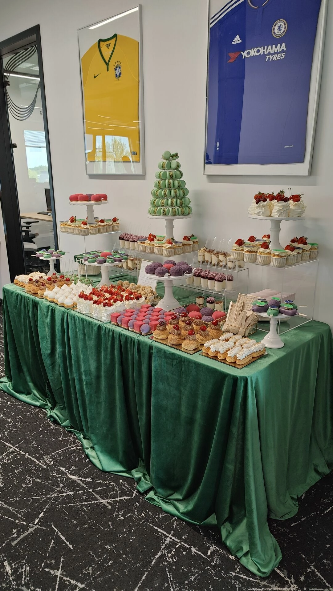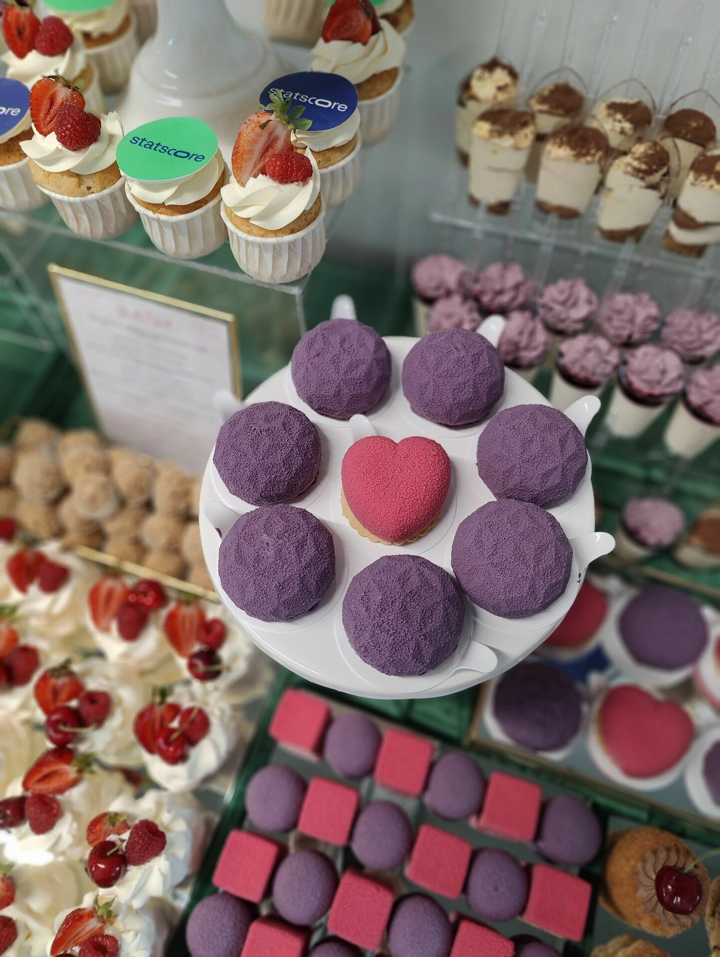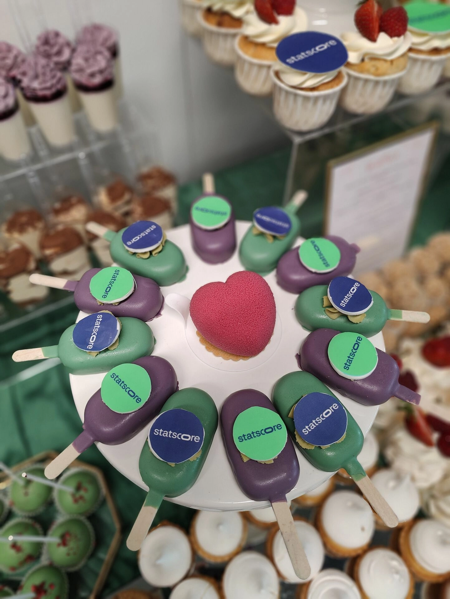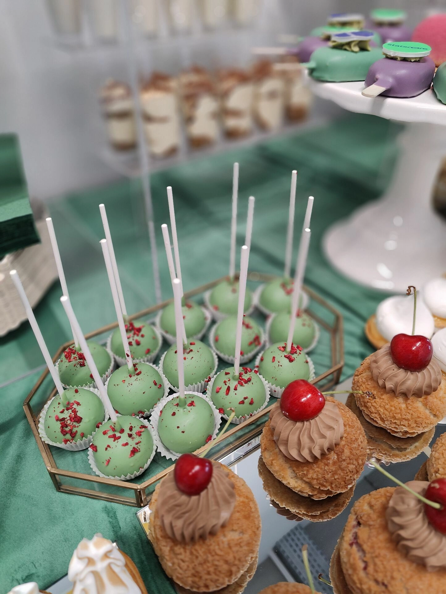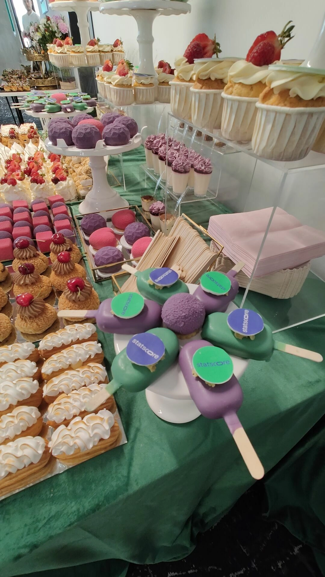 Słodki bufet został skomponowany tak, aby każdy znalazł coś dla siebie – od klasycznych smaków w nowoczesnej odsłonie, po odważne połączenia smakowe. Na stole znalazły się m.in. mini bezy z owocami, delikatne ptysie z kremami premium, efektowne monoporcje w intensywnych kolorach, musy w eleganckich kieliszkach, a także kreatywne cake pops i ice pops, które łączyły zabawny wygląd z wyrafinowanym smakiem. Kolorystyka – zieleń, fiolet, biel i akcenty różu – została dobrana tak, aby współgrać z brandingiem i wystrojem nowego biura, tworząc spójną, nowoczesną kompozycję.