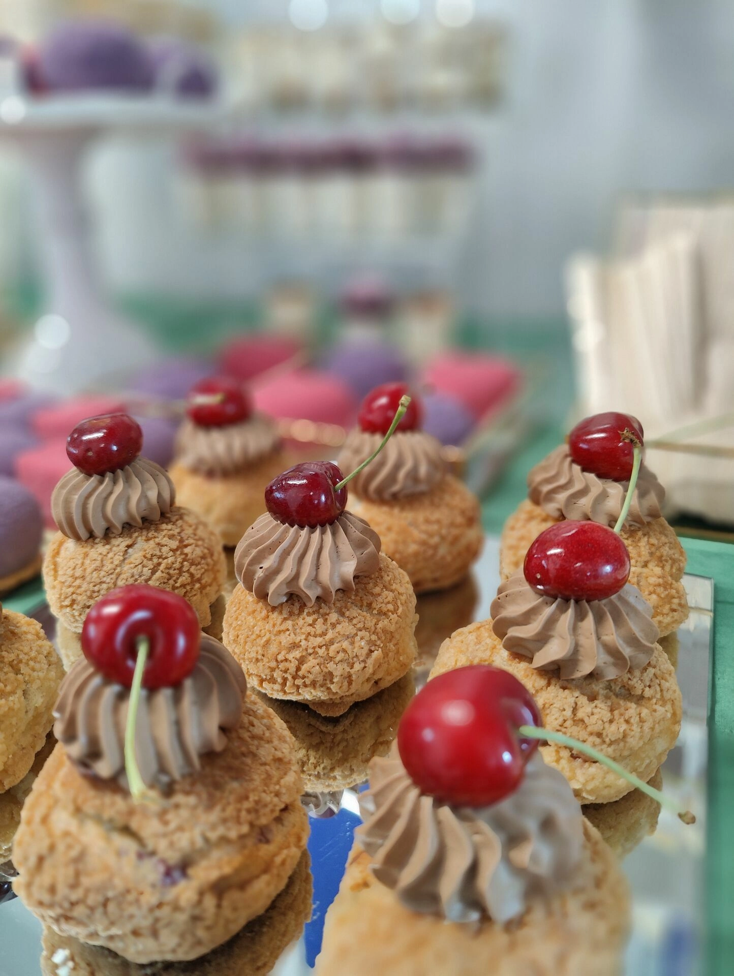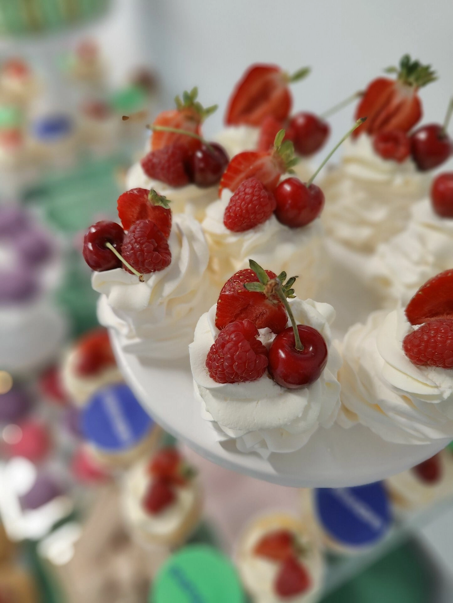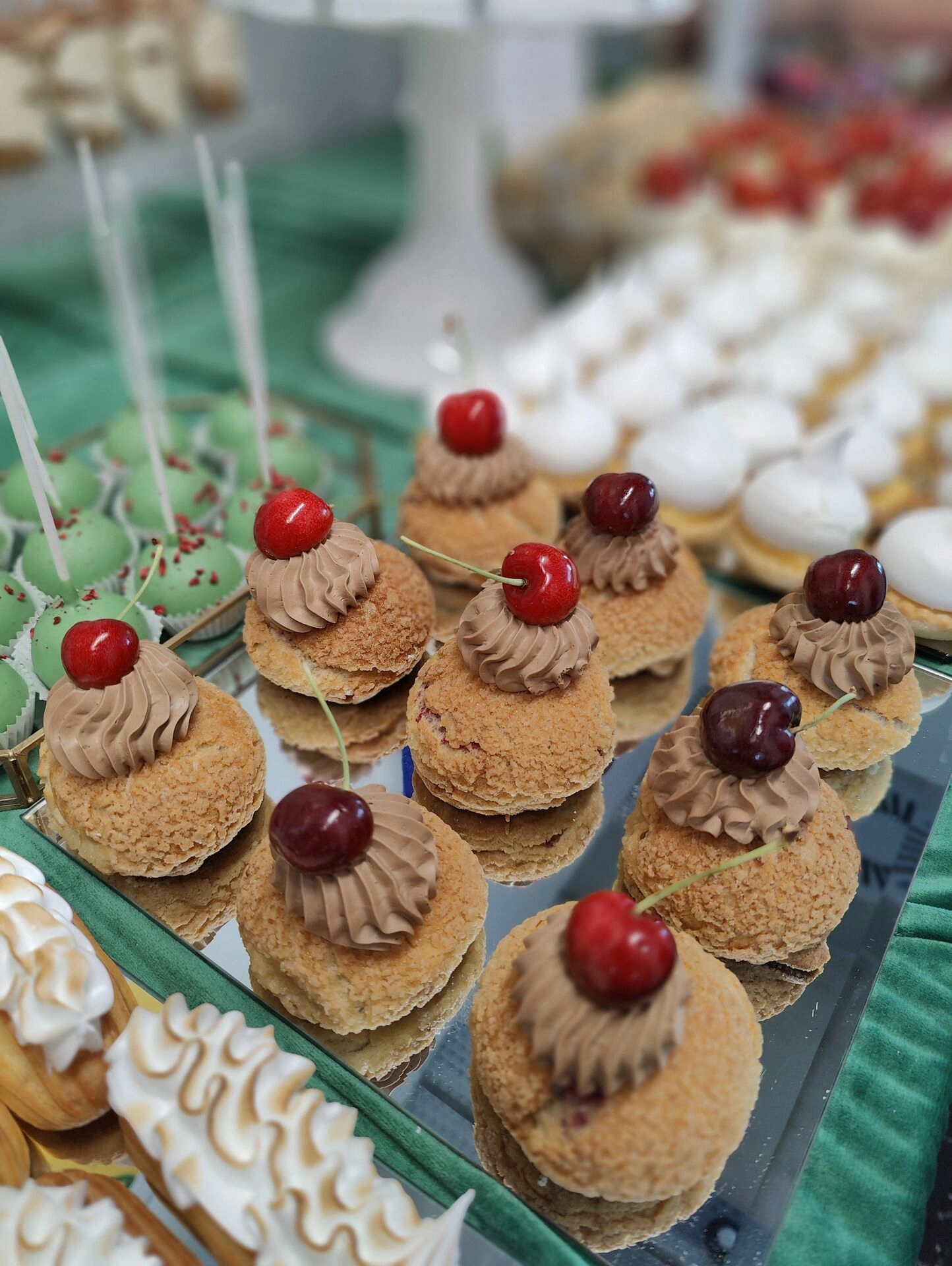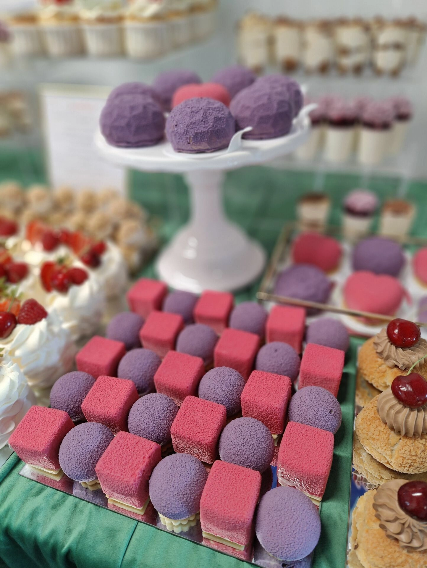 Słodki bufet został skomponowany tak, aby każdy znalazł coś dla siebie – od klasycznych smaków w nowoczesnej odsłonie, po odważne połączenia smakowe. Na stole znalazły się m.in. mini bezy z owocami, delikatne ptysie z kremami premium, efektowne monoporcje w intensywnych kolorach, musy w eleganckich kieliszkach, a także kreatywne cake pops i ice pops, które łączyły zabawny wygląd z wyrafinowanym smakiem. Kolorystyka – zieleń, fiolet, biel i akcenty różu – została dobrana tak, aby współgrać z brandingiem i wystrojem nowego biura, tworząc spójną, nowoczesną kompozycję.