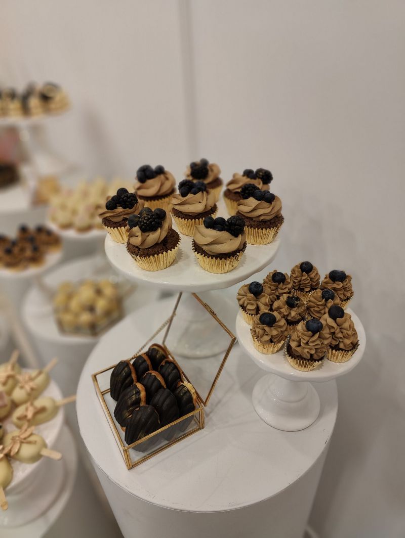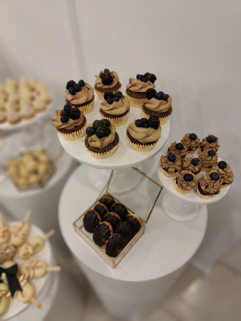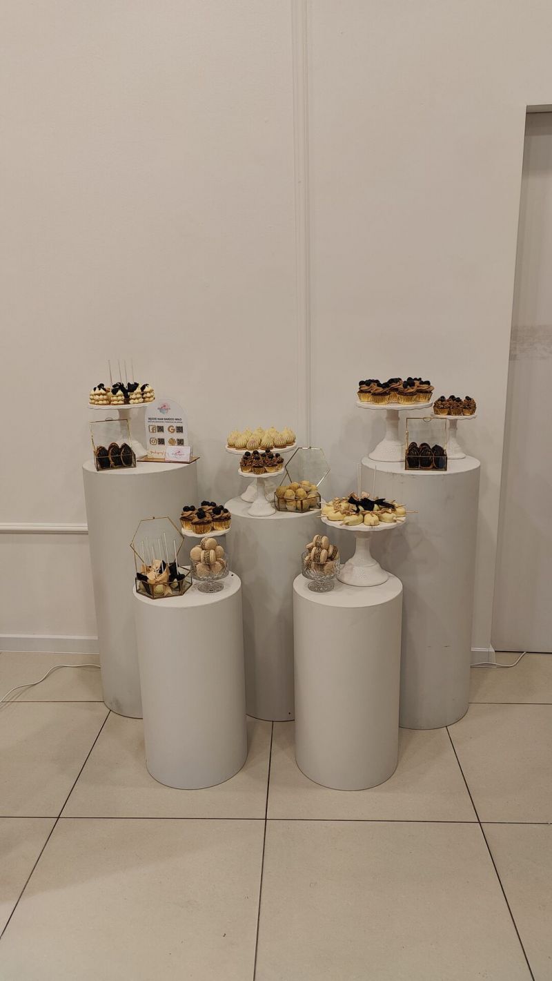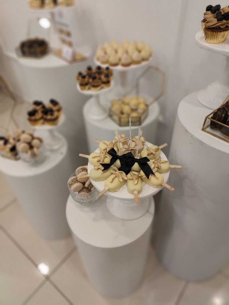 Na białych cylindrycznych postumentach znalazły się wykwintne desery w małej formie – dopracowane w każdym detalu. Wśród nich: delikatne mini bezy z kremem i owocami, babeczki, makaroniki , eleganckie cake pops z kokardami w kolorach złota i czerni. Każdy deser został wykonany z najwyższej jakości składników, a całość prezentowała się lekko, świeżo i luksusowo.