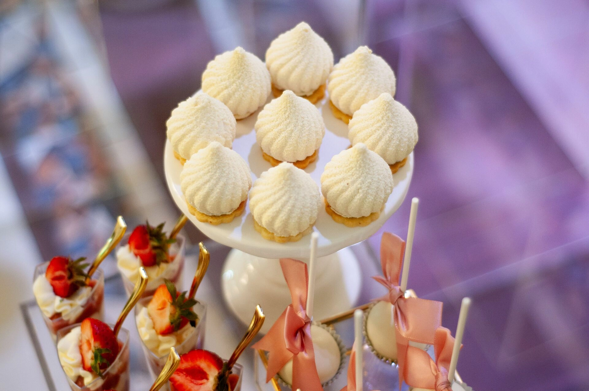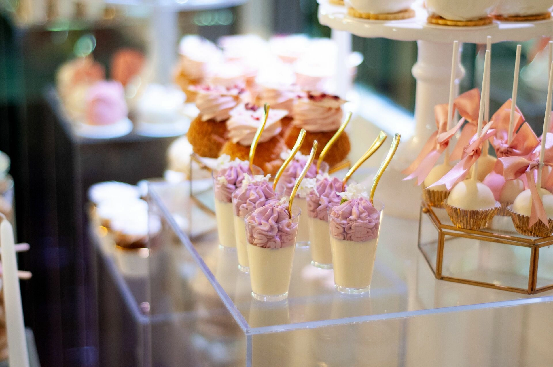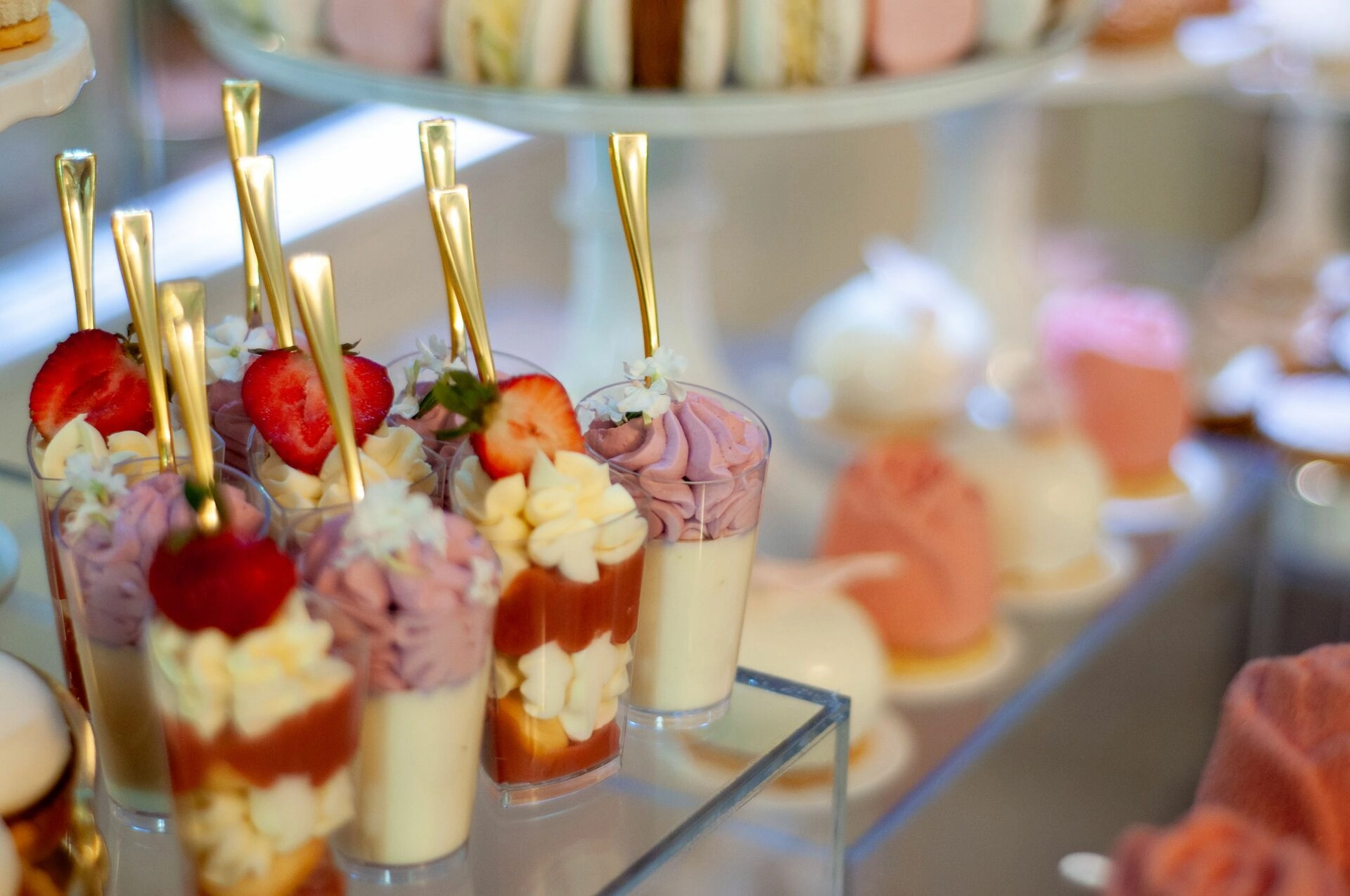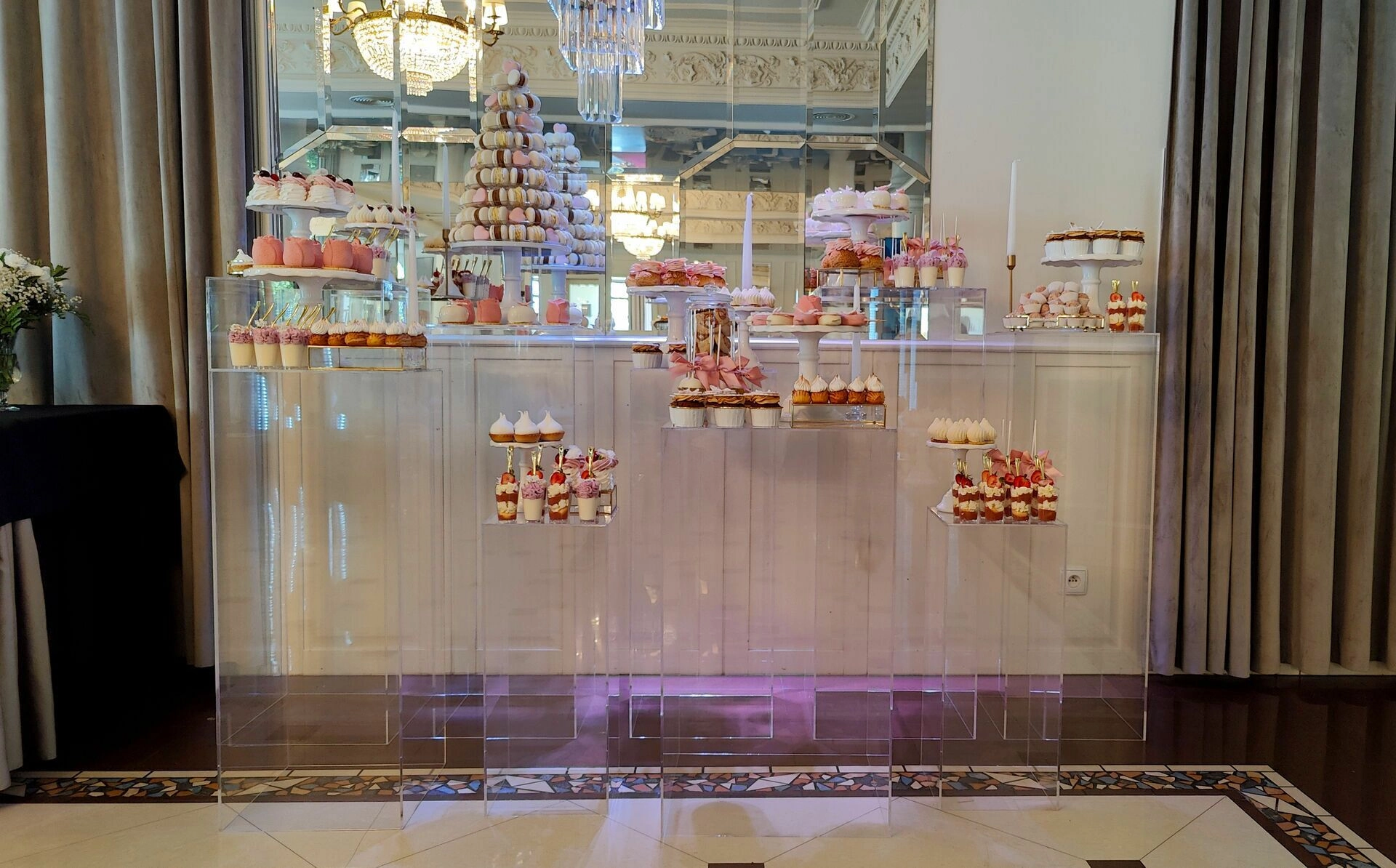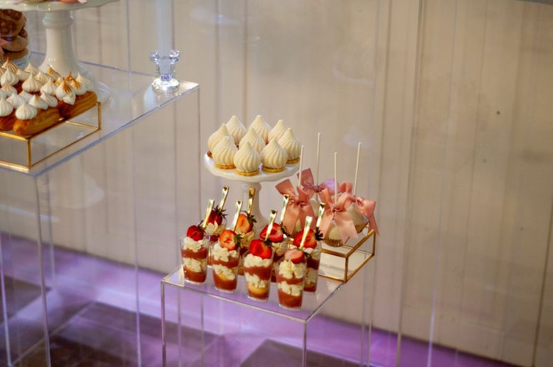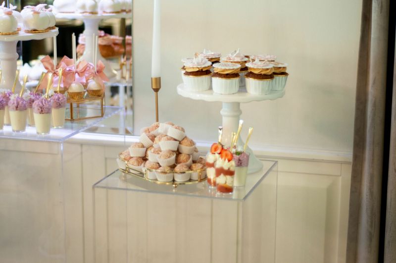 Stół został starannie zaprojektowany, aby zachwycać i inspirować. Każdy detal, od wykwintnych monoporcji, przez finezyjnie zdobione babeczki, aż po subtelne makaroniki, został wykonany z najwyższą precyzją i pasją. Przezroczyste postumenty, na których umieszczono słodkości, tworzą efekt lewitacji, co nadaje całości magicznego i nowatorskiego charakteru. Dzięki temu nasze słodkie stoły nie tylko zaspokajają podniebienia, ale również cieszą oczy, stając się niezapomnianą atrakcją każdego przyjęcia.