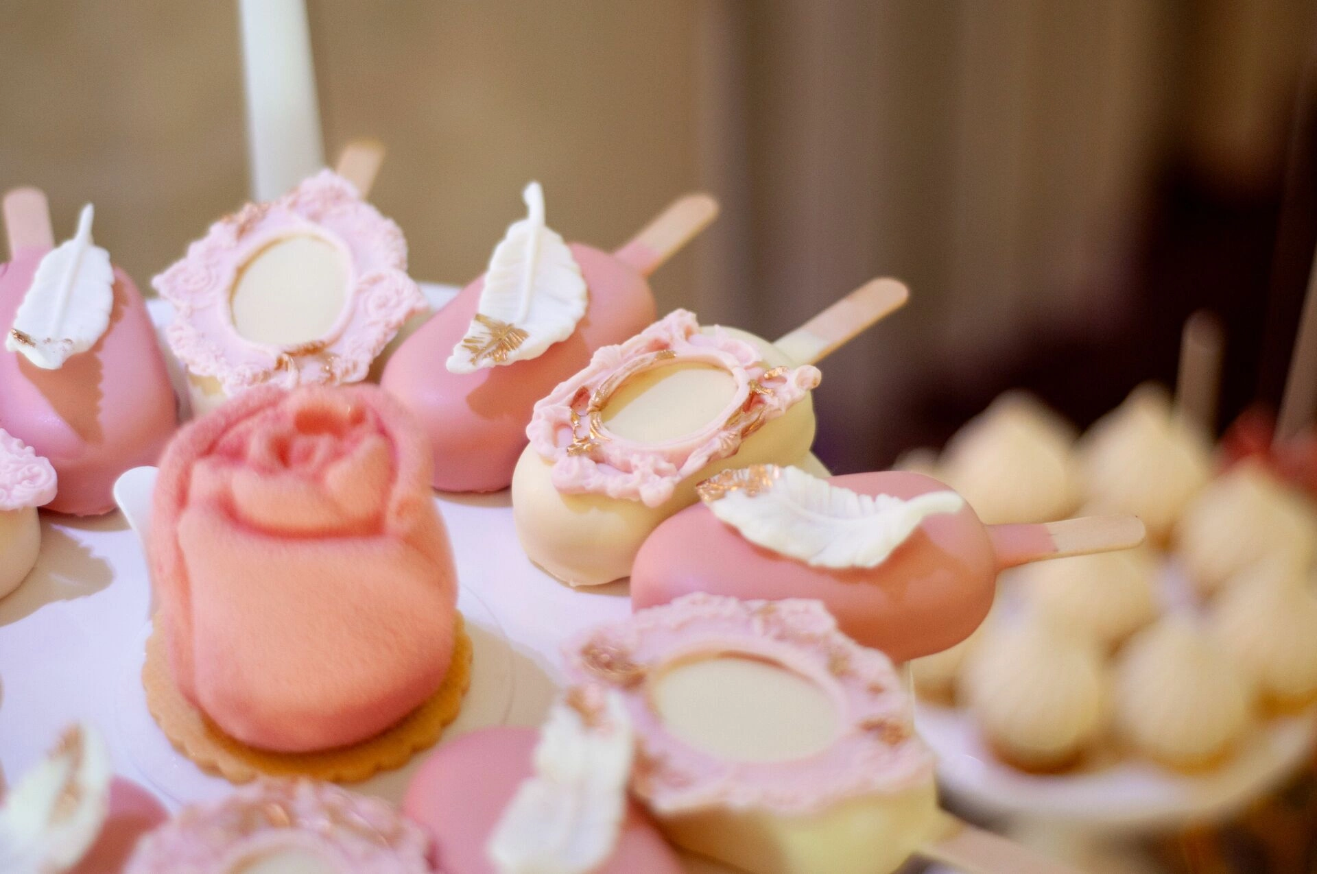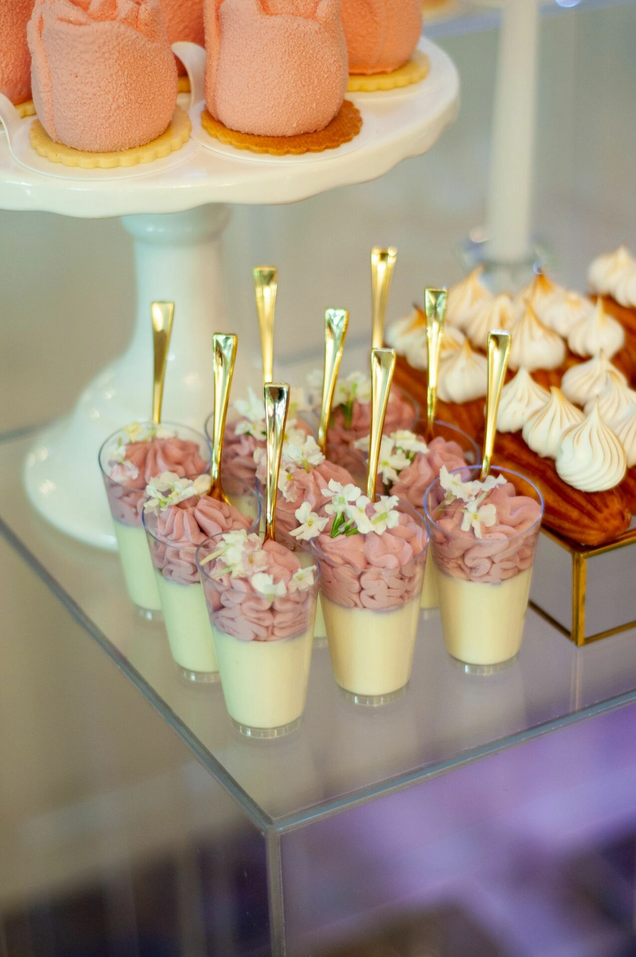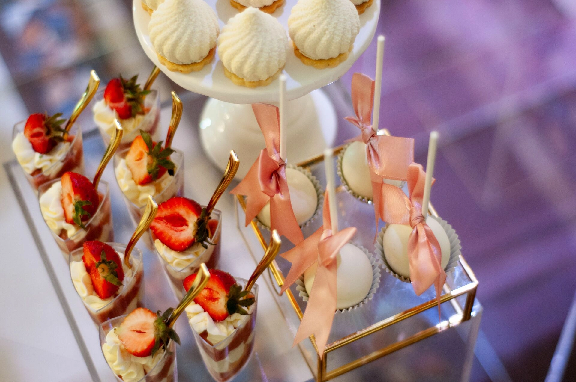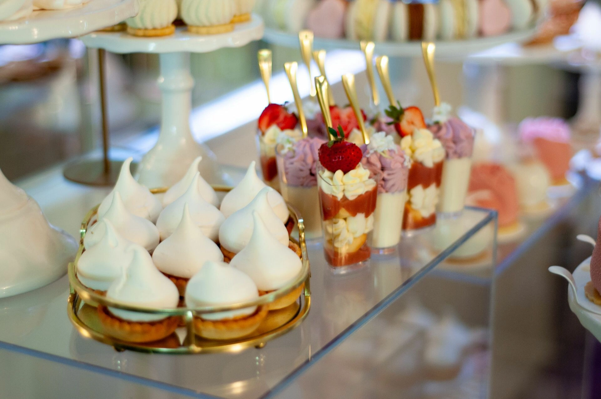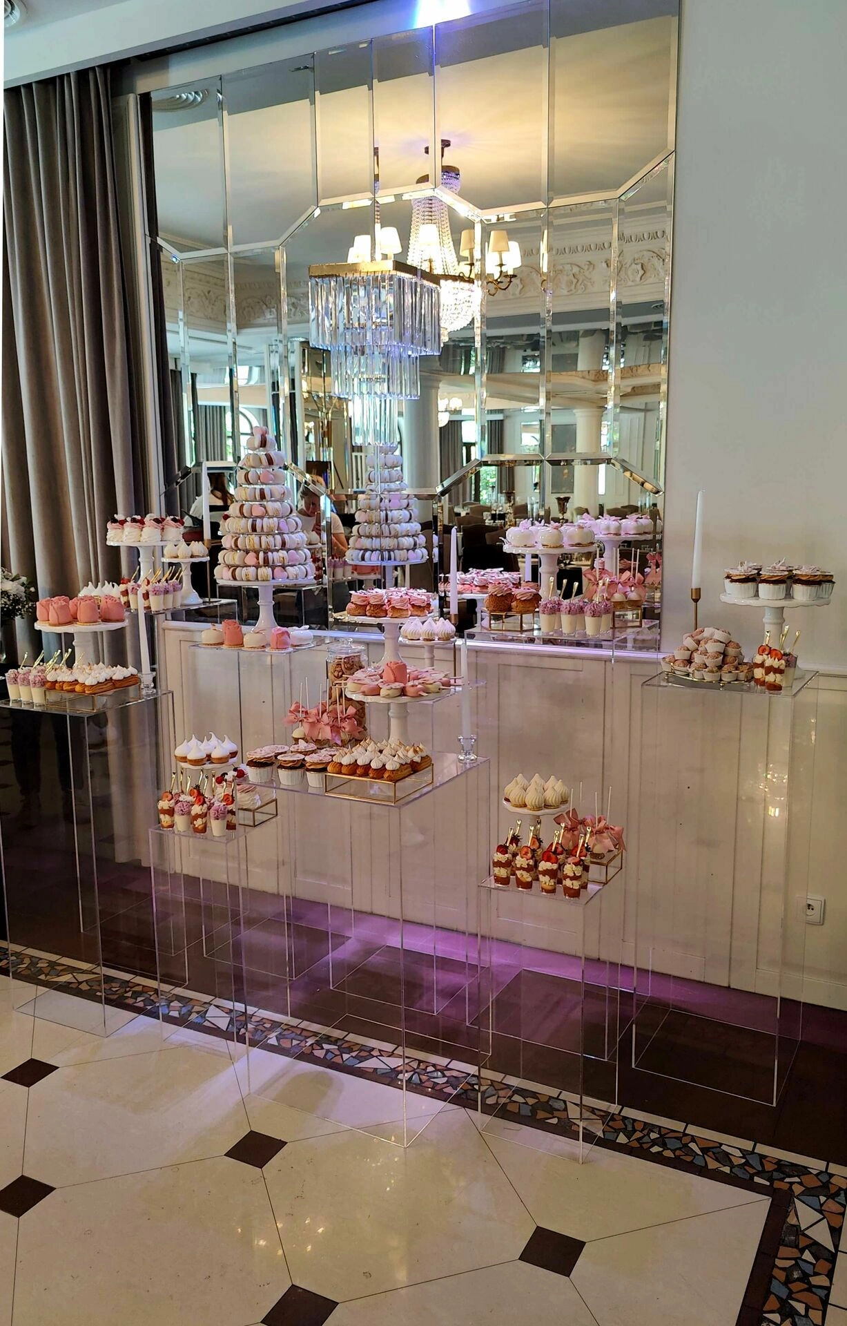 Stół został starannie zaprojektowany, aby zachwycać i inspirować. Każdy detal, od wykwintnych monoporcji, przez finezyjnie zdobione babeczki, aż po subtelne makaroniki, został wykonany z najwyższą precyzją i pasją. Przezroczyste postumenty, na których umieszczono słodkości, tworzą efekt lewitacji, co nadaje całości magicznego i nowatorskiego charakteru. Dzięki temu nasze słodkie stoły nie tylko zaspokajają podniebienia, ale również cieszą oczy, stając się niezapomnianą atrakcją każdego przyjęcia.