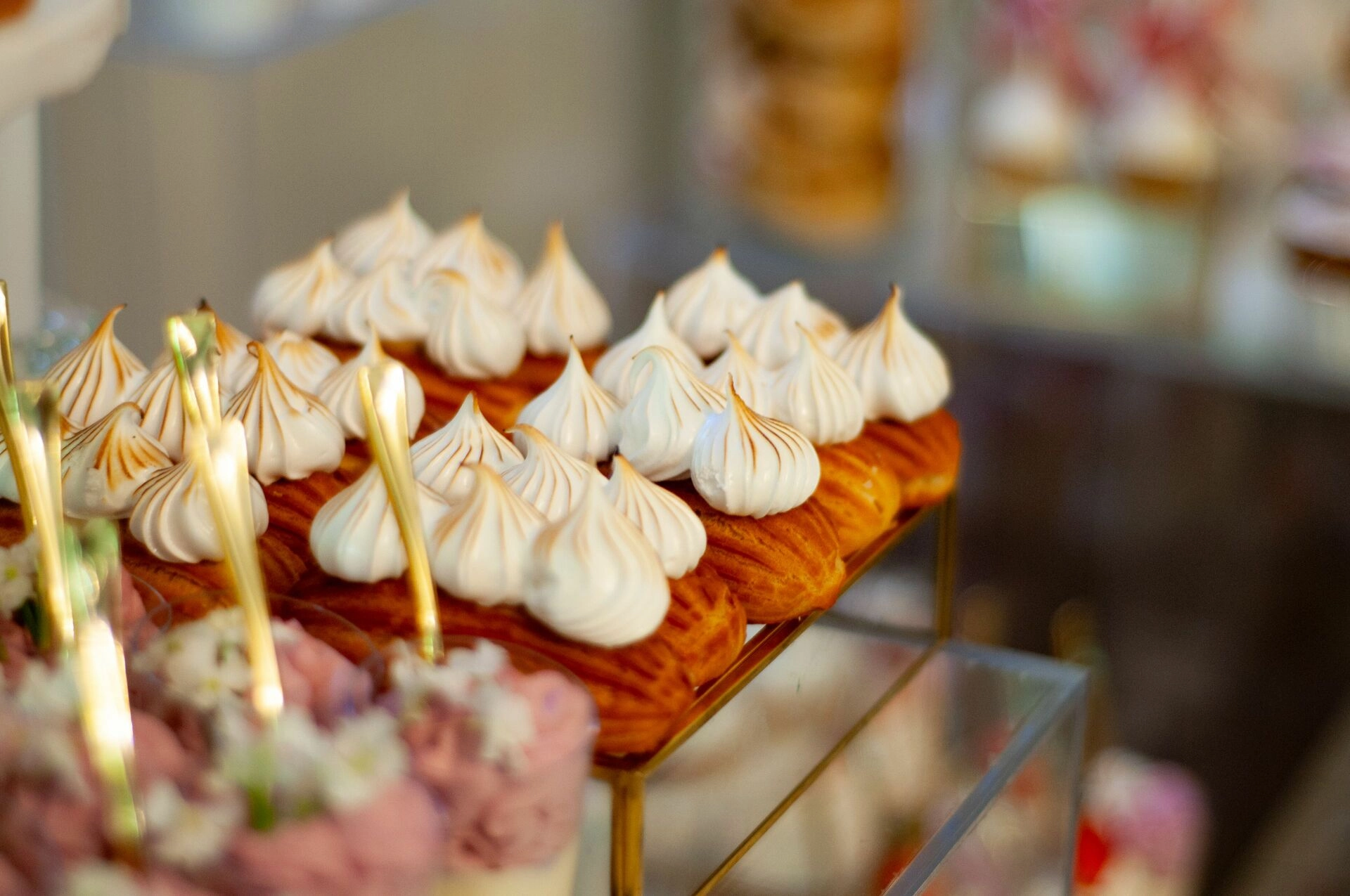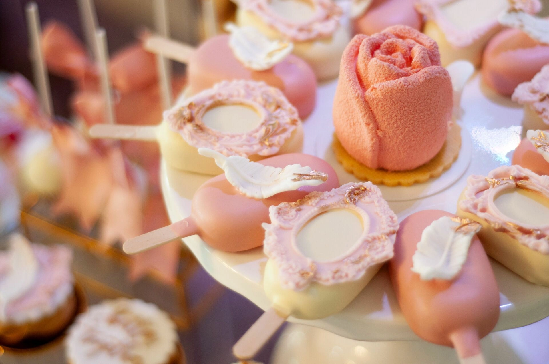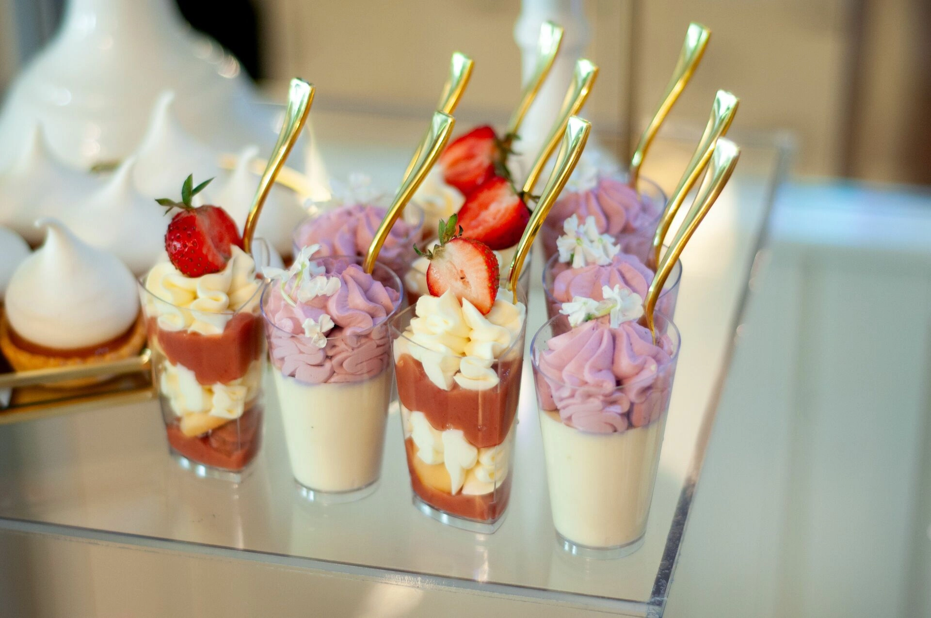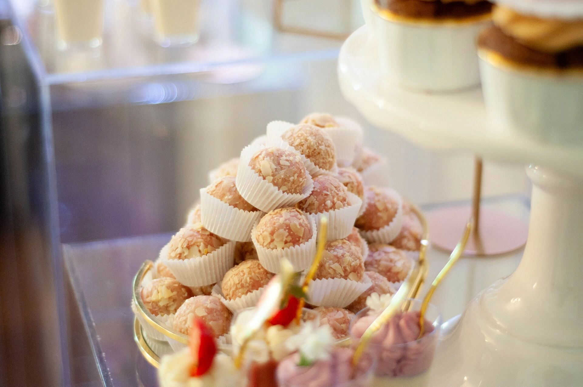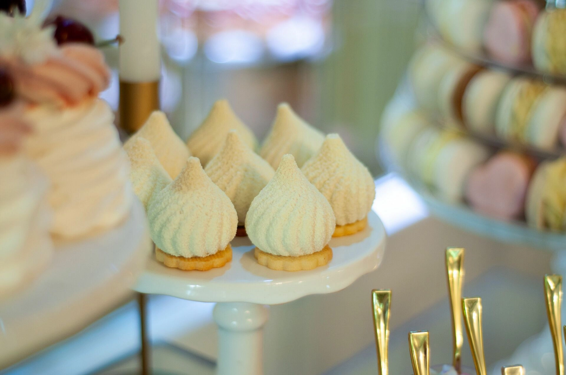 Stół został starannie zaprojektowany, aby zachwycać i inspirować. Każdy detal, od wykwintnych monoporcji, przez finezyjnie zdobione babeczki, aż po subtelne makaroniki, został wykonany z najwyższą precyzją i pasją. Przezroczyste postumenty, na których umieszczono słodkości, tworzą efekt lewitacji, co nadaje całości magicznego i nowatorskiego charakteru. Dzięki temu nasze słodkie stoły nie tylko zaspokajają podniebienia, ale również cieszą oczy, stając się niezapomnianą atrakcją każdego przyjęcia.