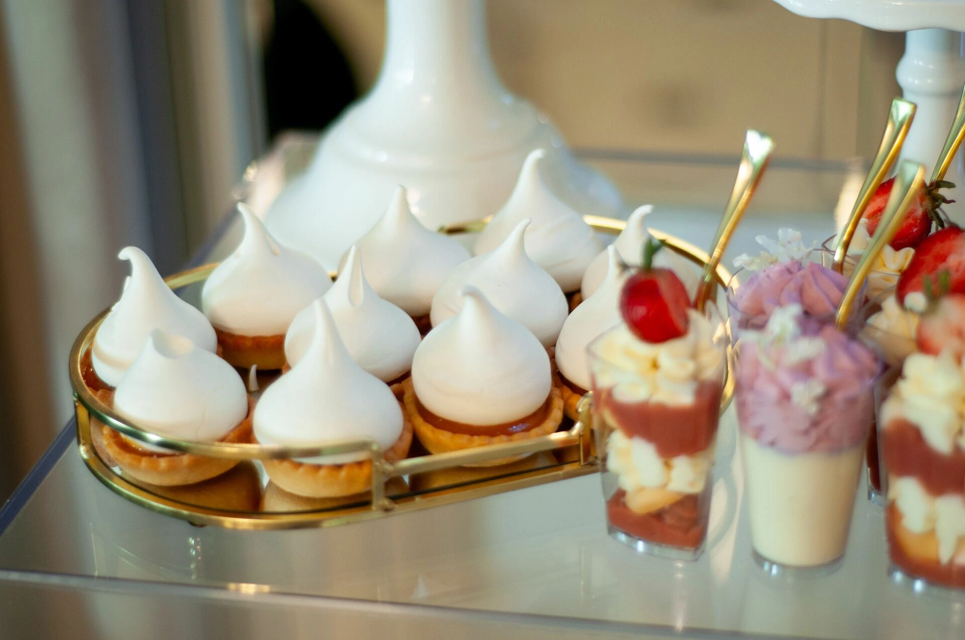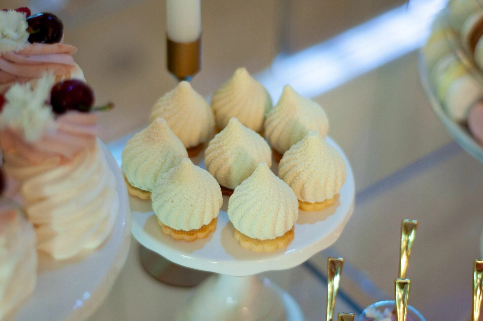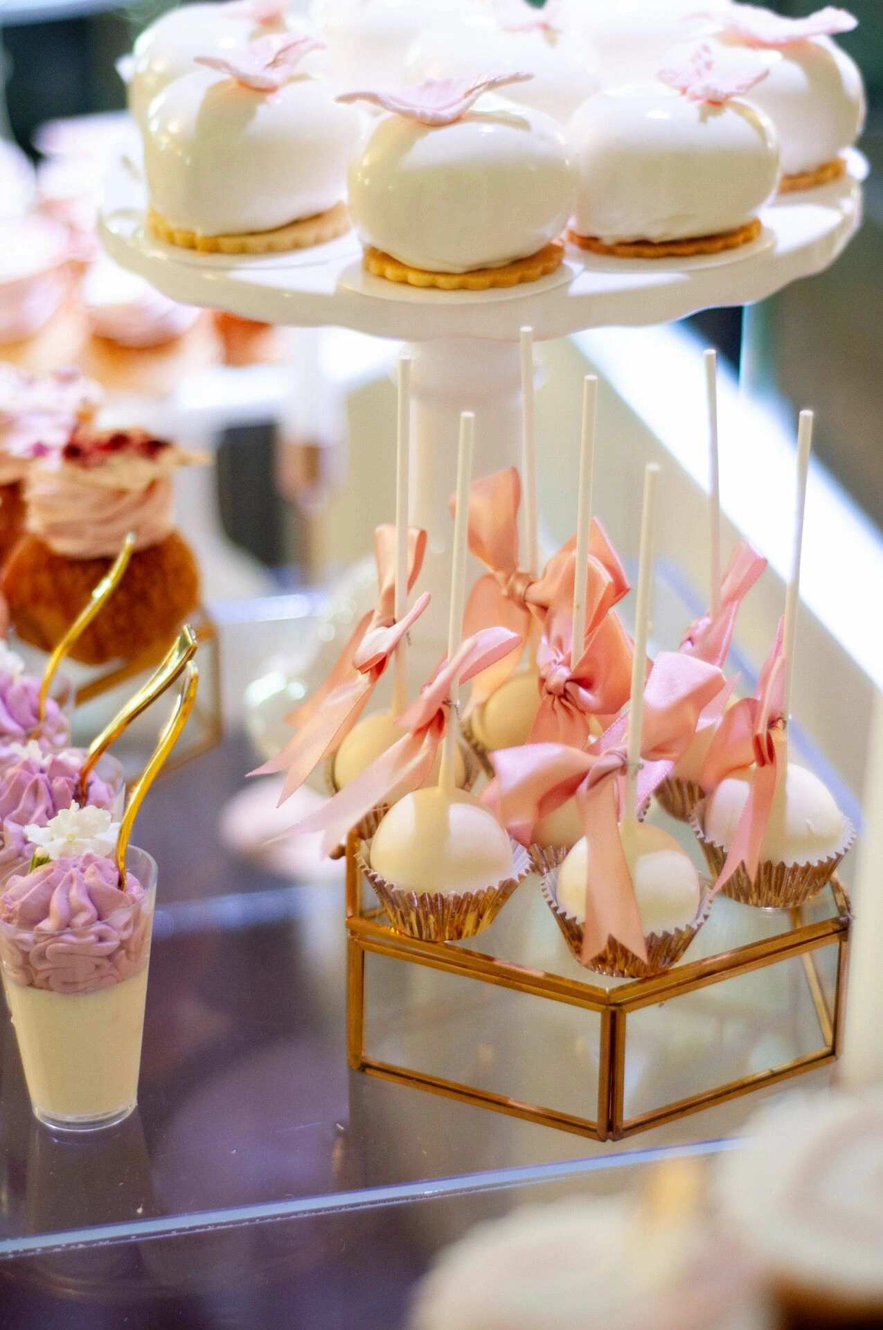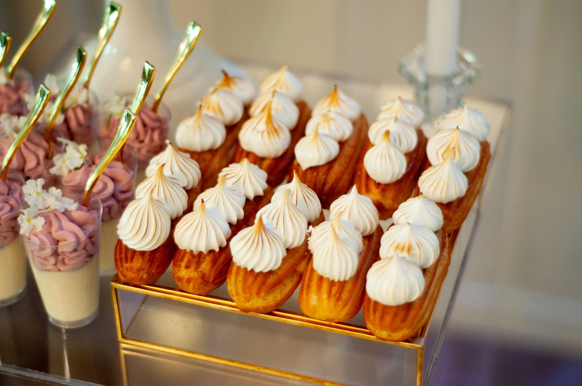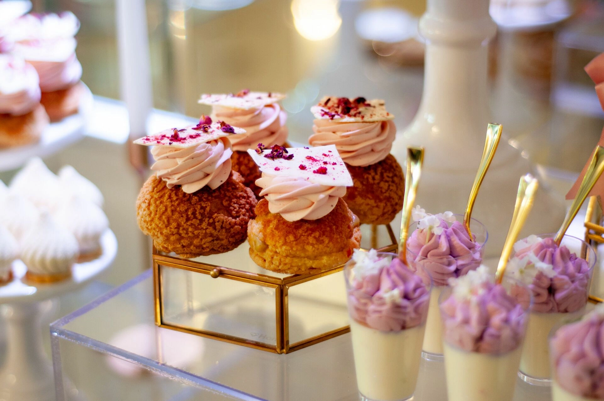 Stół został starannie zaprojektowany, aby zachwycać i inspirować. Każdy detal, od wykwintnych monoporcji, przez finezyjnie zdobione babeczki, aż po subtelne makaroniki, został wykonany z najwyższą precyzją i pasją. Przezroczyste postumenty, na których umieszczono słodkości, tworzą efekt lewitacji, co nadaje całości magicznego i nowatorskiego charakteru. Dzięki temu nasze słodkie stoły nie tylko zaspokajają podniebienia, ale również cieszą oczy, stając się niezapomnianą atrakcją każdego przyjęcia.