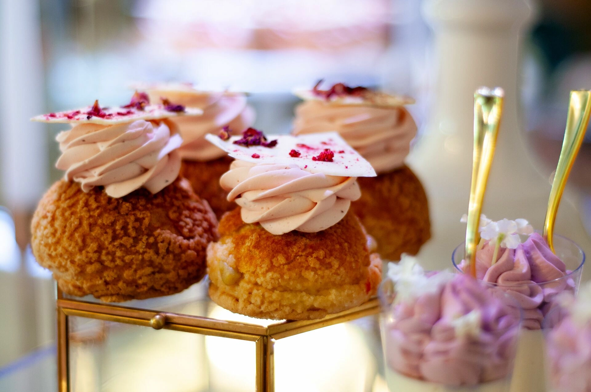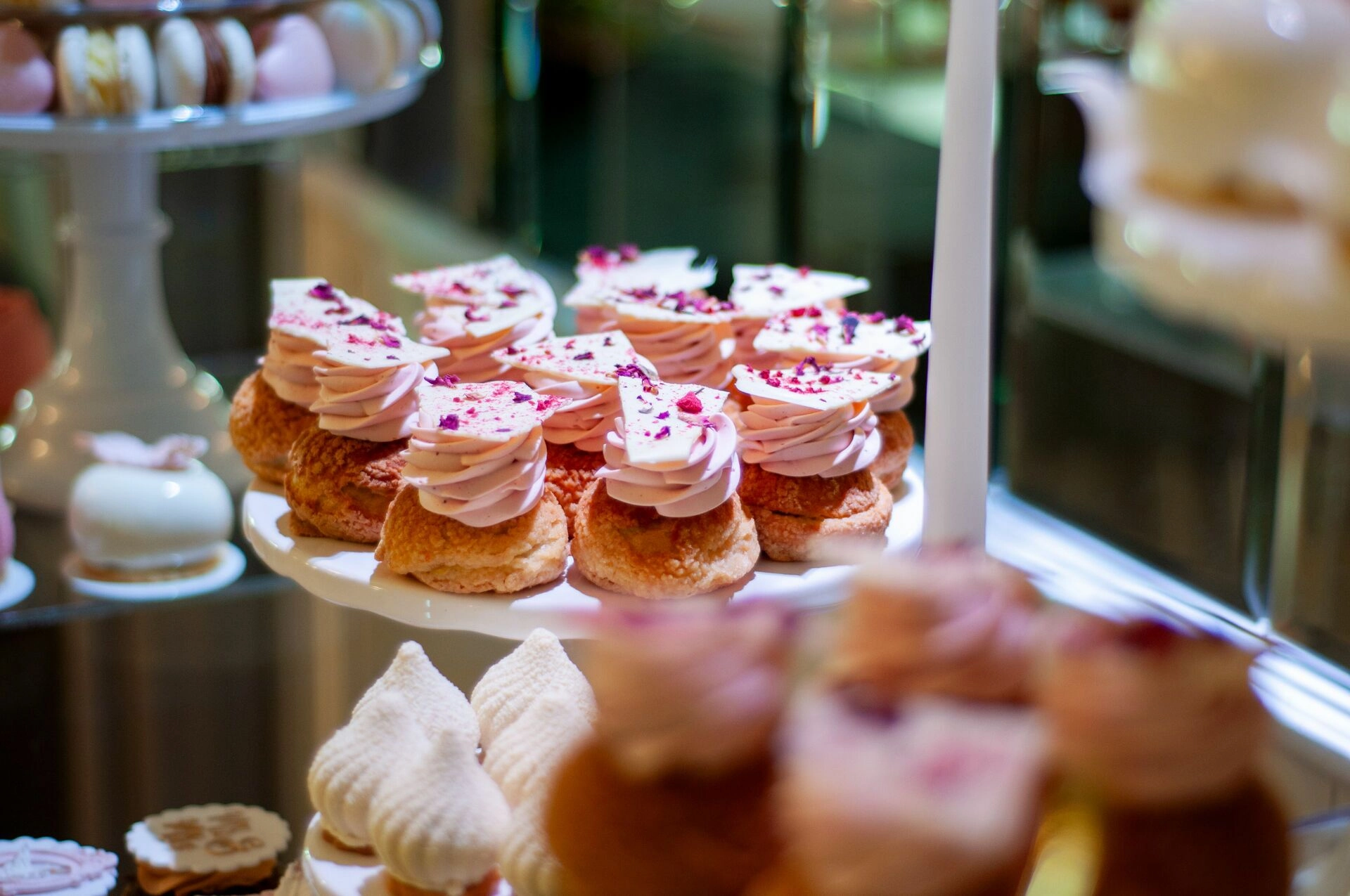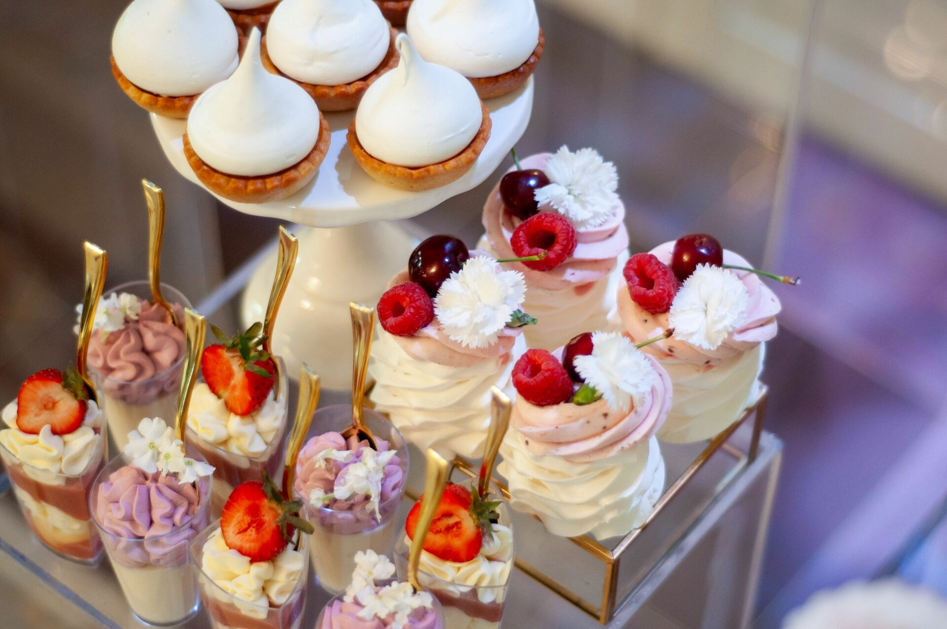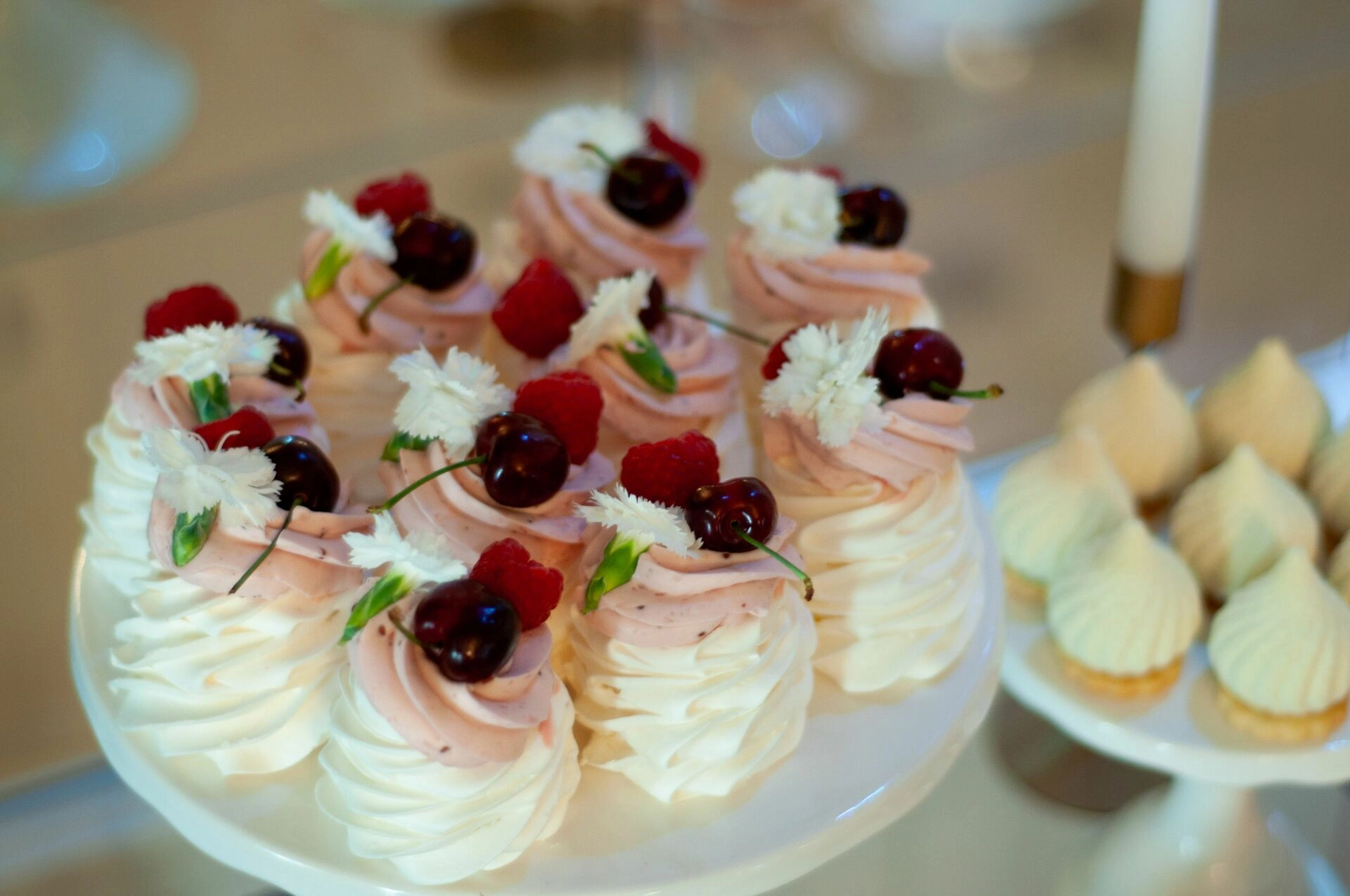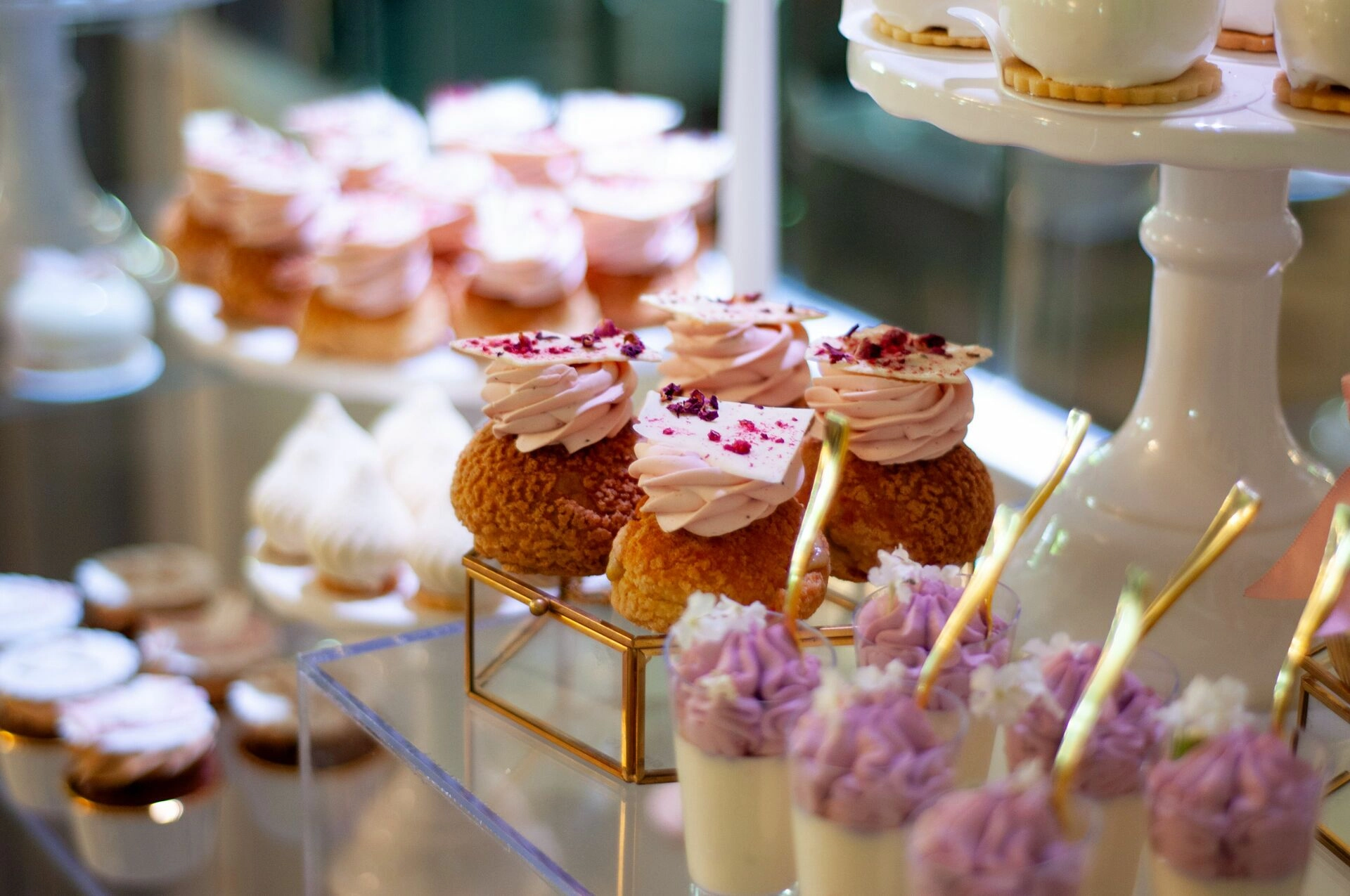 Stół został starannie zaprojektowany, aby zachwycać i inspirować. Każdy detal, od wykwintnych monoporcji, przez finezyjnie zdobione babeczki, aż po subtelne makaroniki, został wykonany z najwyższą precyzją i pasją. Przezroczyste postumenty, na których umieszczono słodkości, tworzą efekt lewitacji, co nadaje całości magicznego i nowatorskiego charakteru. Dzięki temu nasze słodkie stoły nie tylko zaspokajają podniebienia, ale również cieszą oczy, stając się niezapomnianą atrakcją każdego przyjęcia.