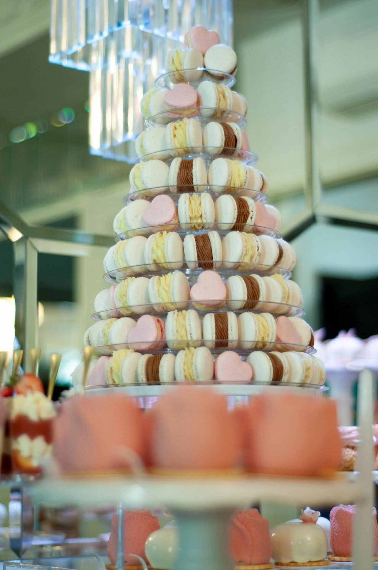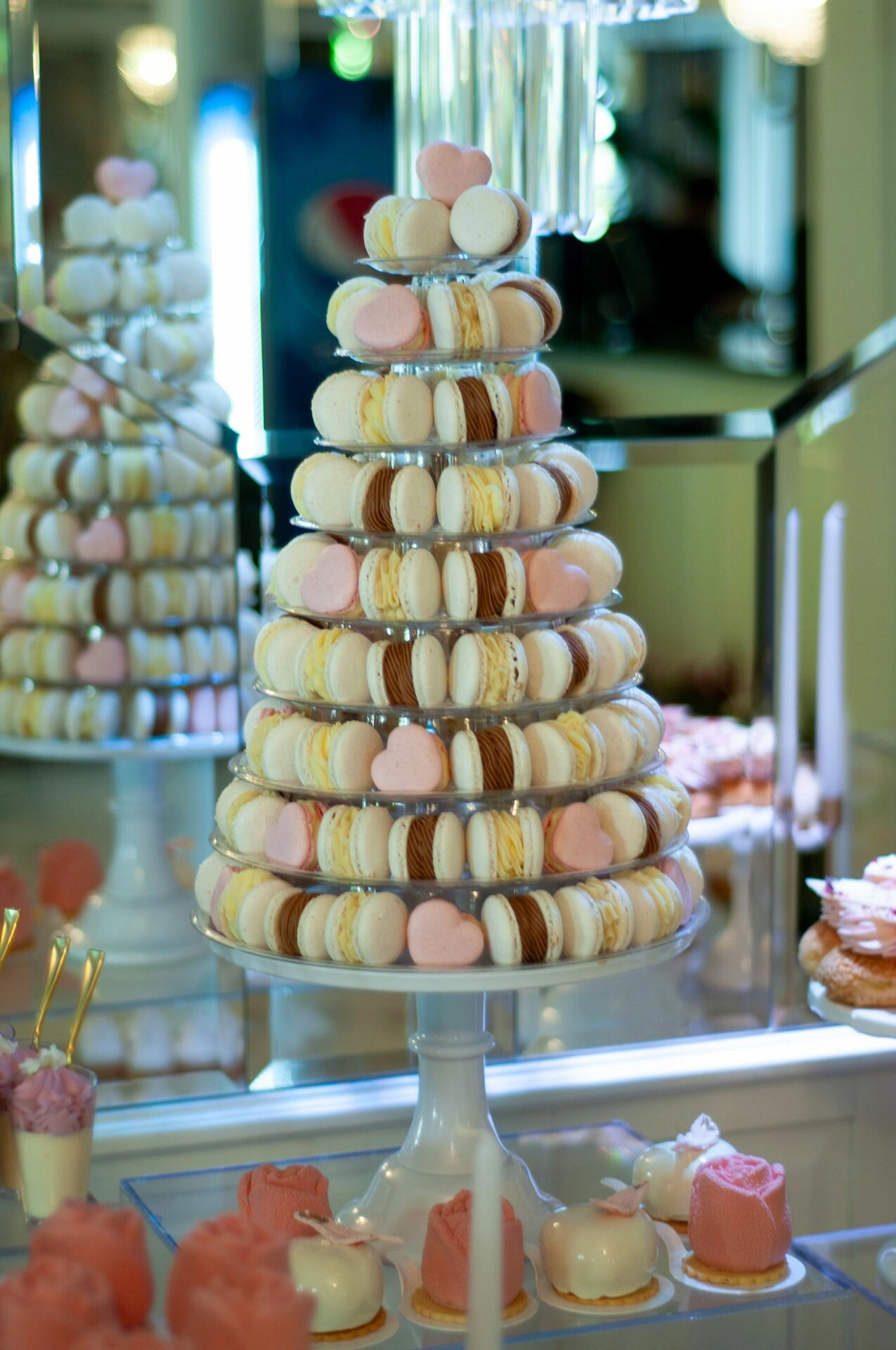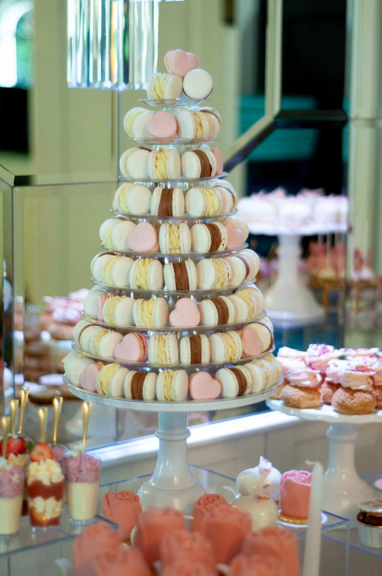 W centralnej części stołu znajduje się imponujący stand z makaronikami, który przyciąga wzrok swoją majestatyczną formą. Wokół niego rozmieszczono różnorodne słodkości, które harmonijnie komponują się kolorystycznie i tematycznie. Każdy element słodkiego stołu został starannie dobrany, aby tworzyć spójną i elegancką całość.