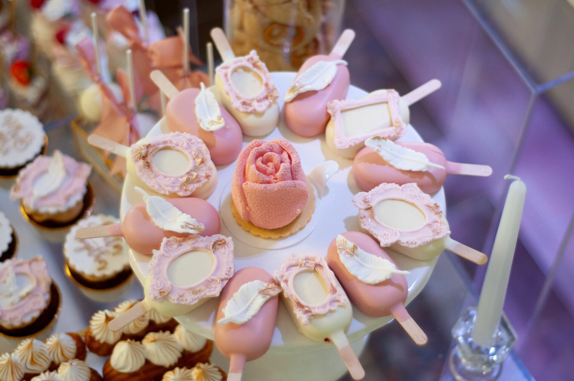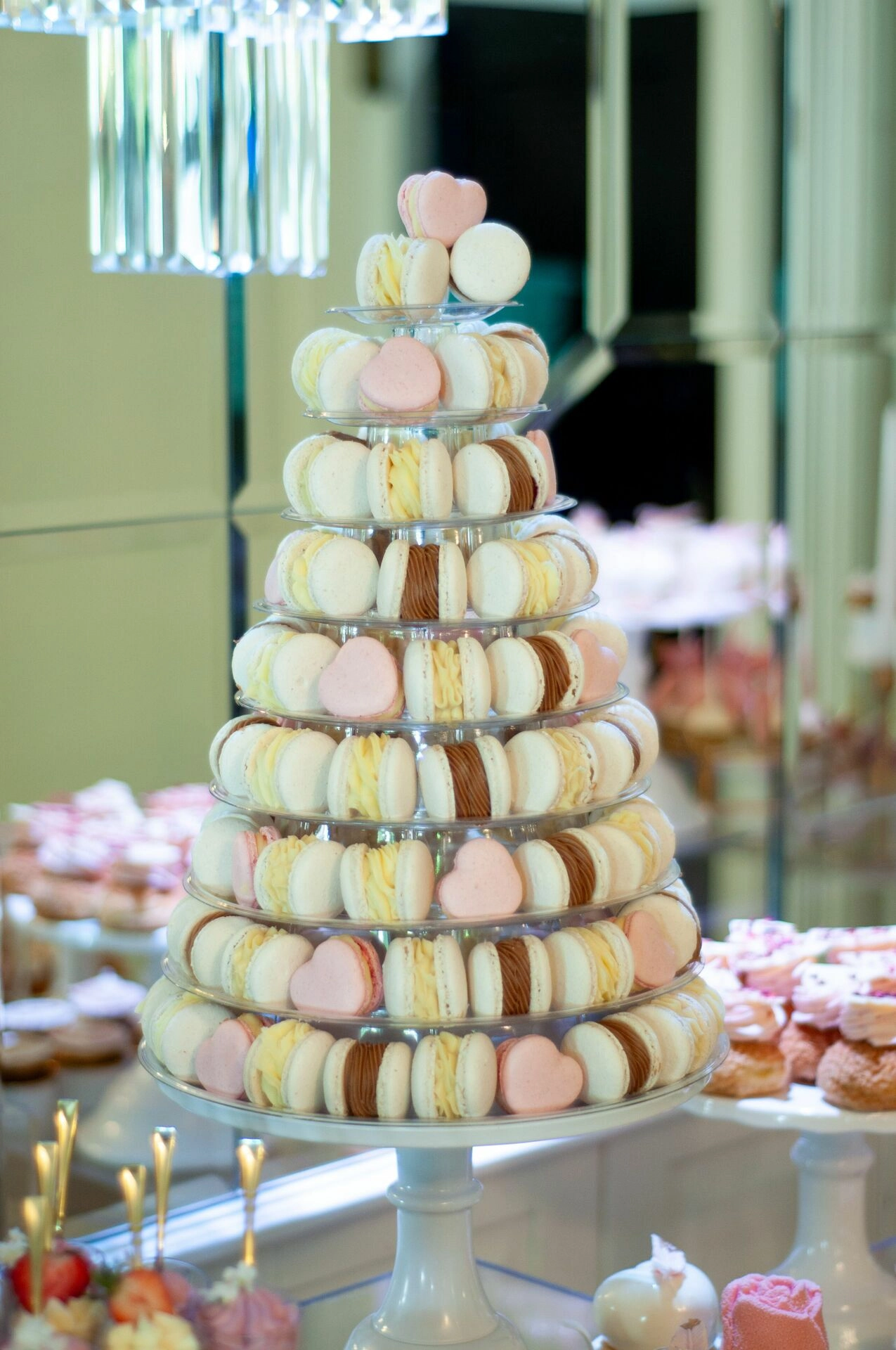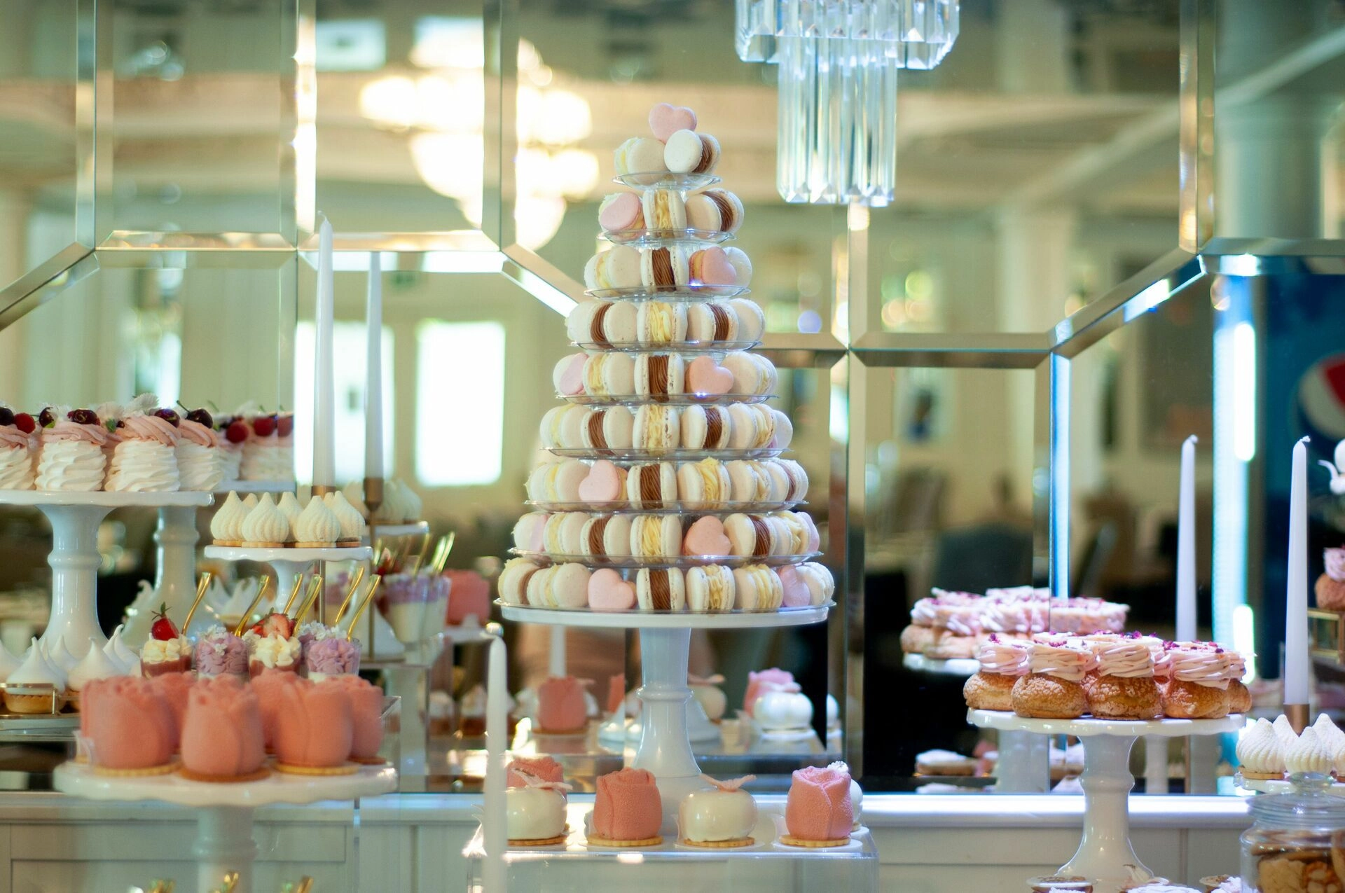 W centralnej części stołu znajduje się imponujący stand z makaronikami, który przyciąga wzrok swoją majestatyczną formą. Wokół niego rozmieszczono różnorodne słodkości, które harmonijnie komponują się kolorystycznie i tematycznie. Każdy element słodkiego stołu został starannie dobrany, aby tworzyć spójną i elegancką całość.
