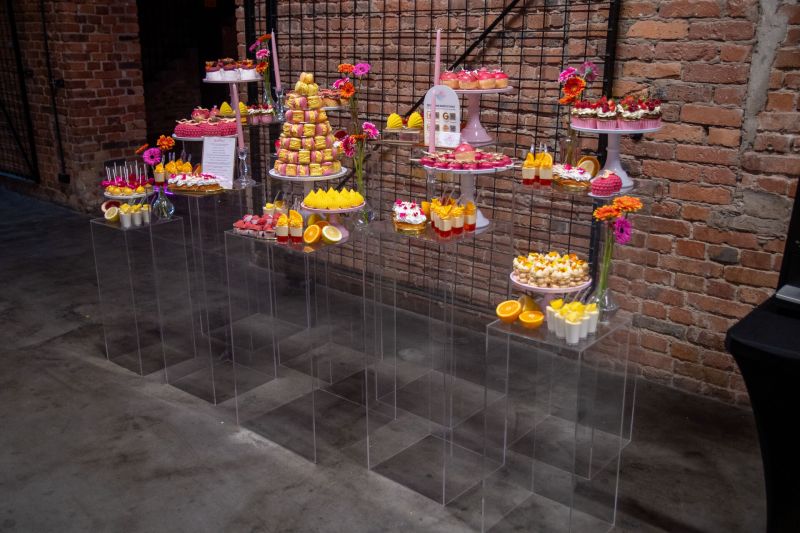 Słodki stół Śląsk – tak można określić naszą koncepcję, która łączy estetykę i smak w jednym. Desery zaprezentowano na przezroczystych, akrylowych postumentach – dzięki nim całość wygląda lekko i elegancko, a jednocześnie pozwala wyeksponować każdy detal. To świetne rozwiązanie zarówno na firmowe gale, jak i na wesela w stylu nowoczesnym. 💎