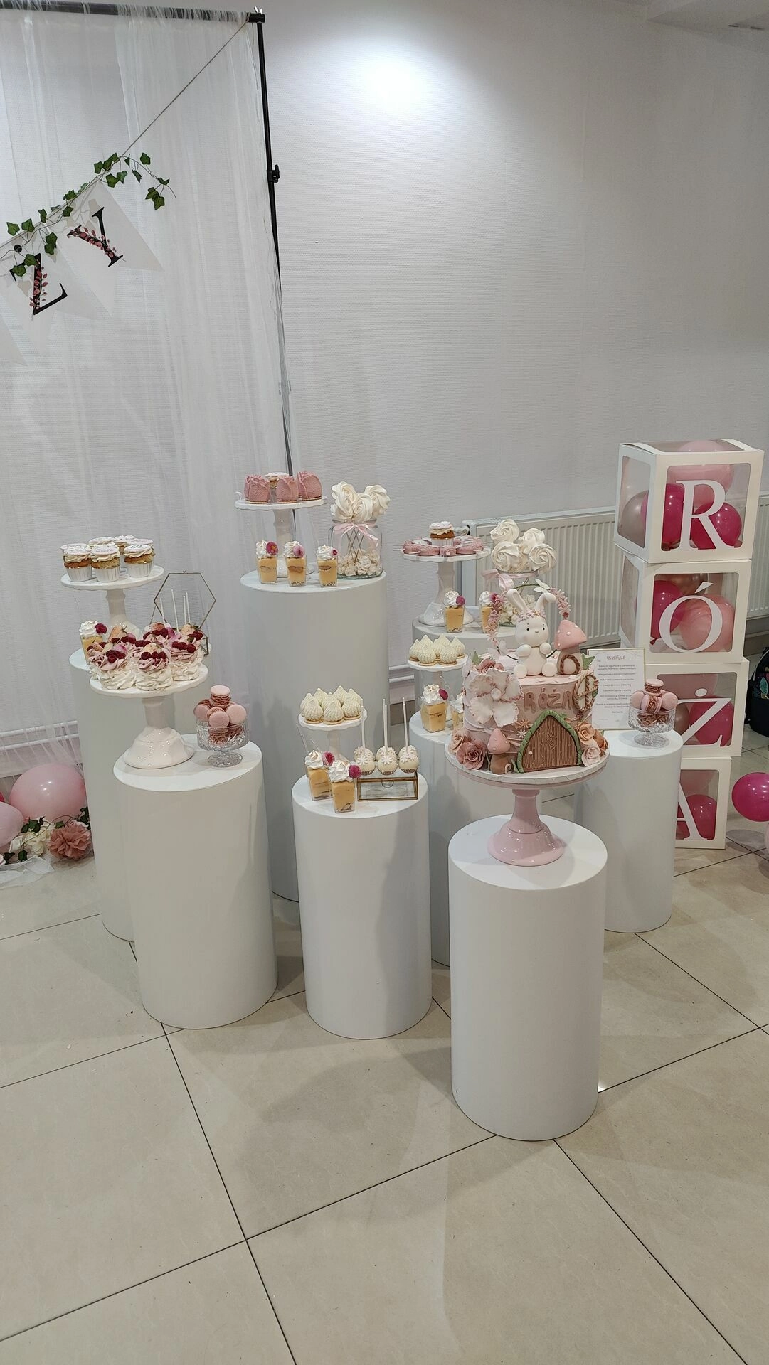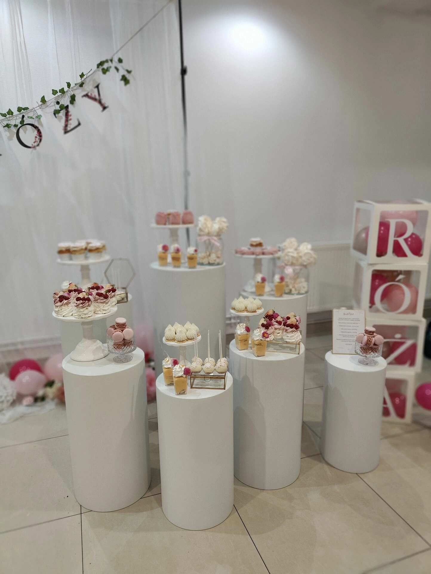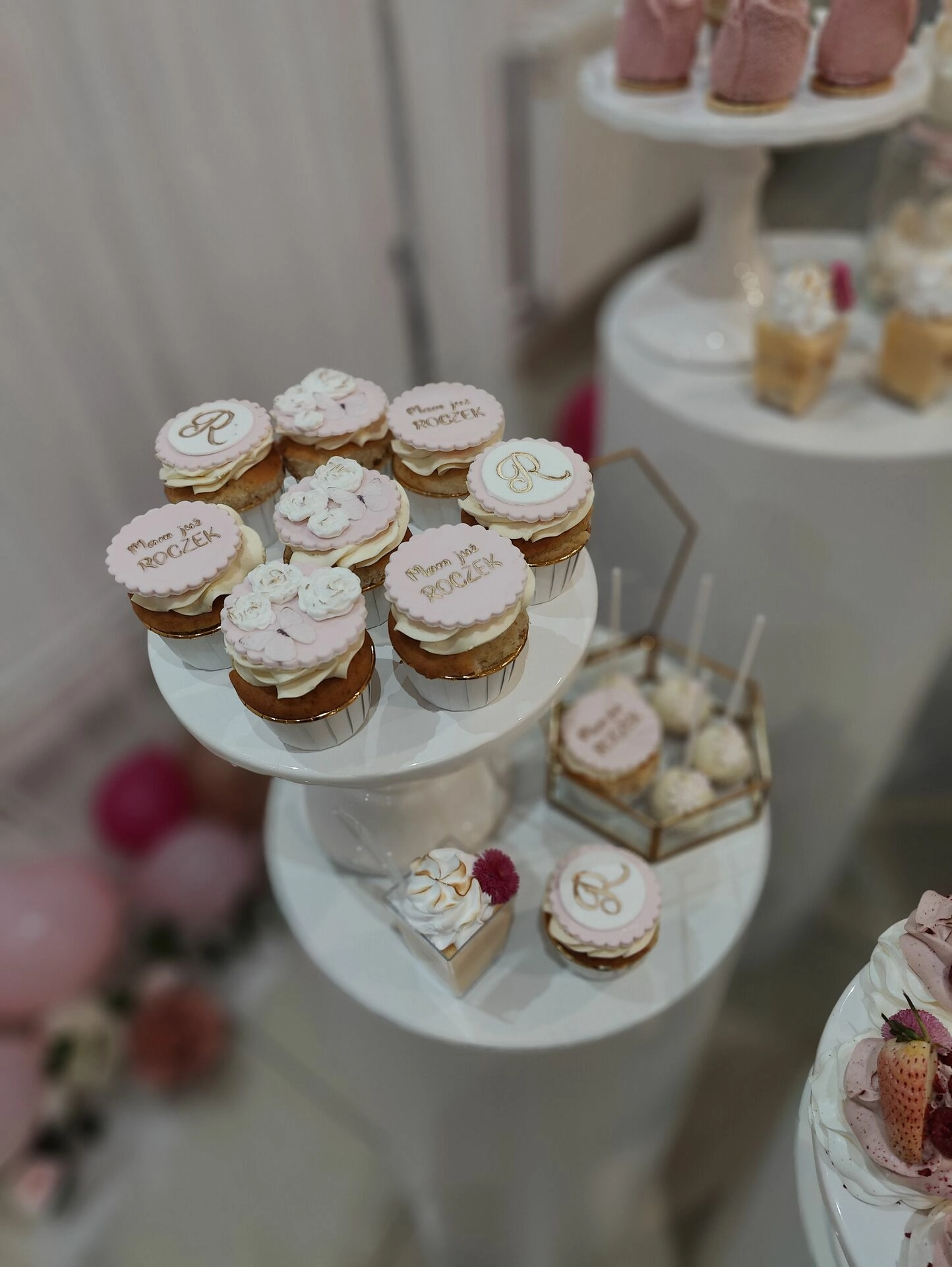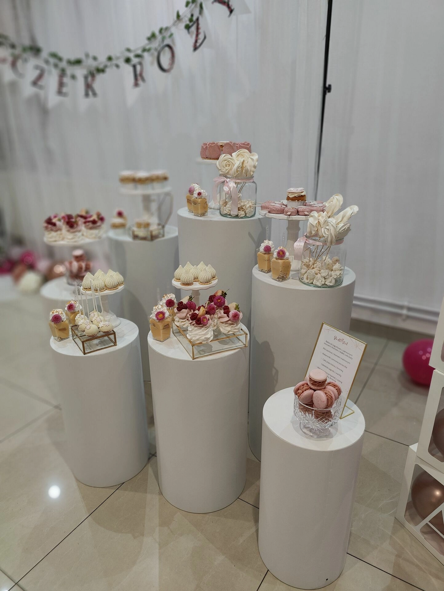 Na eleganckich, białych postumentach znalazły się ręcznie przygotowane desery na roczek, m.in.: mini beziki z owocami, babeczki z kremem i owocami, cake pops, makaroniki w odcieniach różu, mini tartaletki i lekkie deserki warstwowe w pojemniczkach. Każdy element stołu został dopracowany wizualnie – idealnie komponując się z różowo-złotym wystrojem sali i balonową dekoracją w kształcie cyfry „1”.