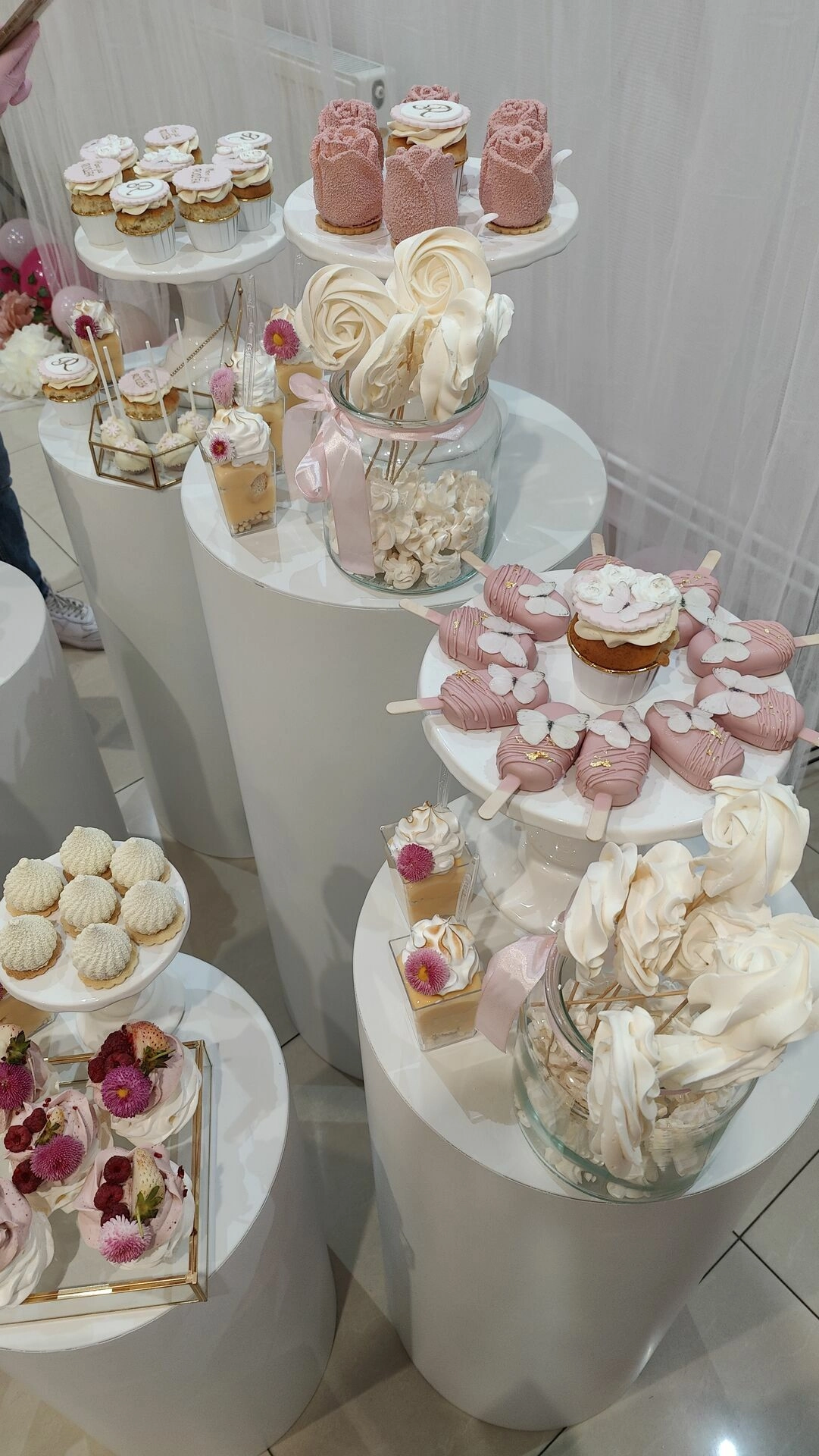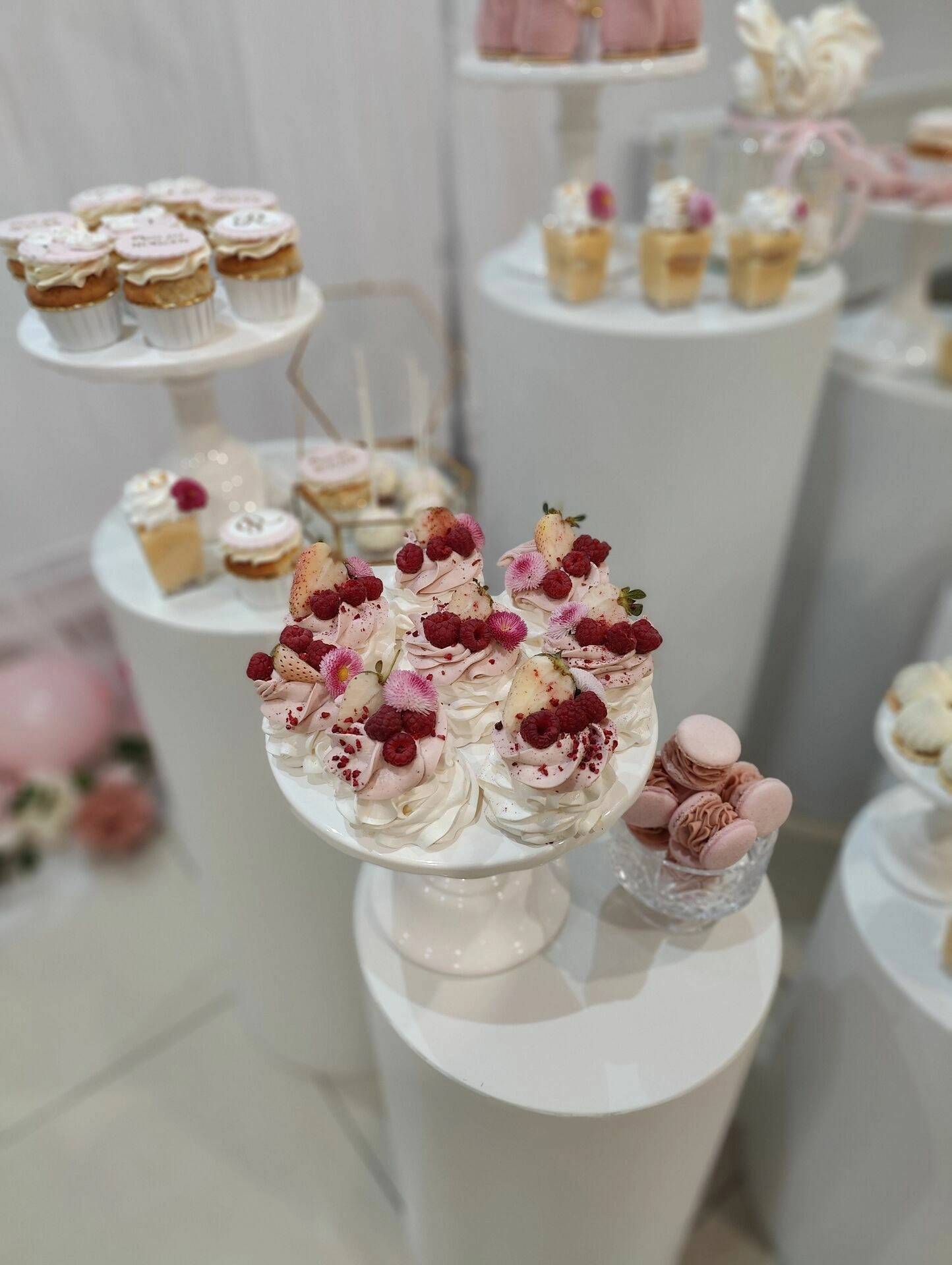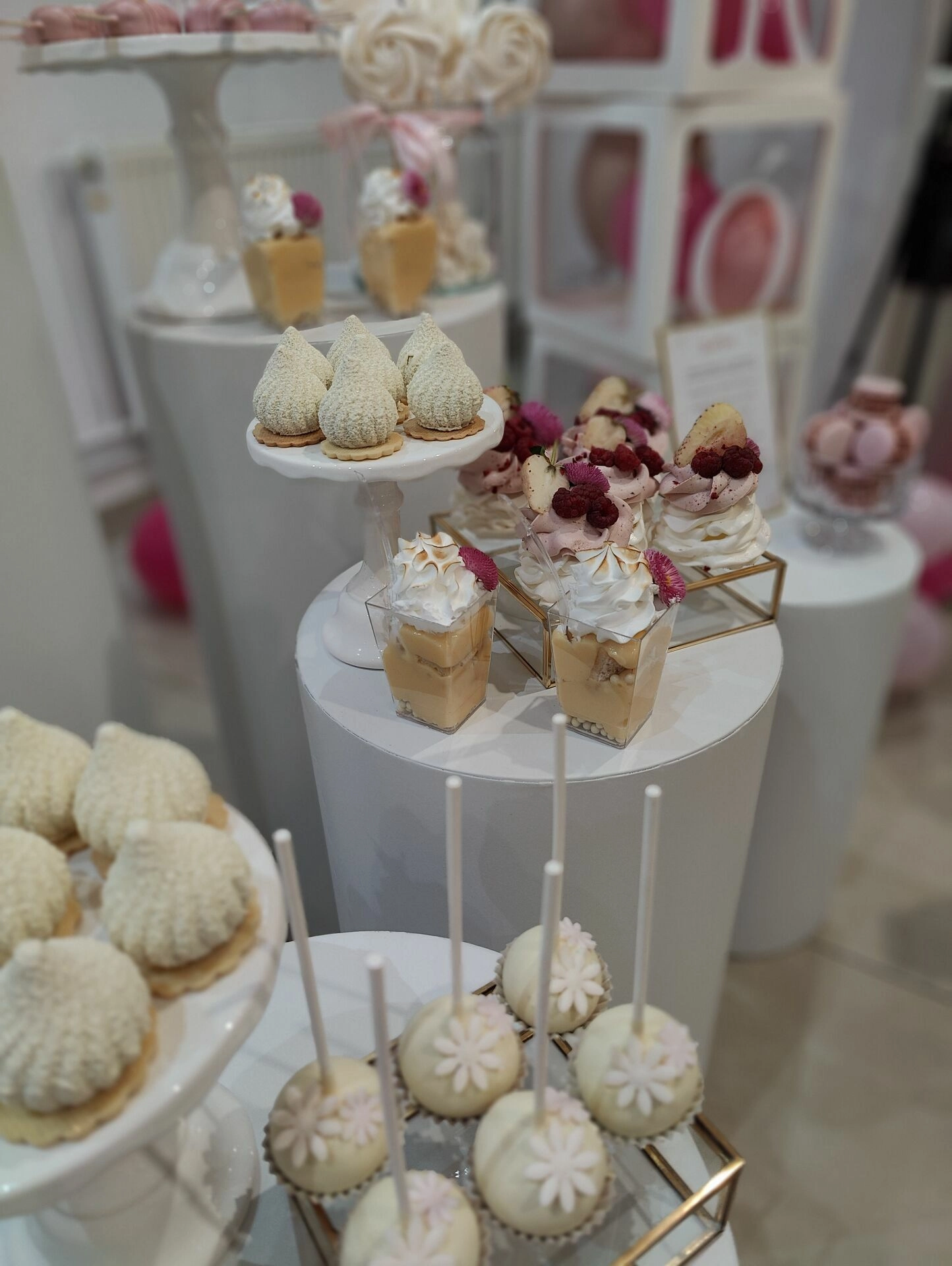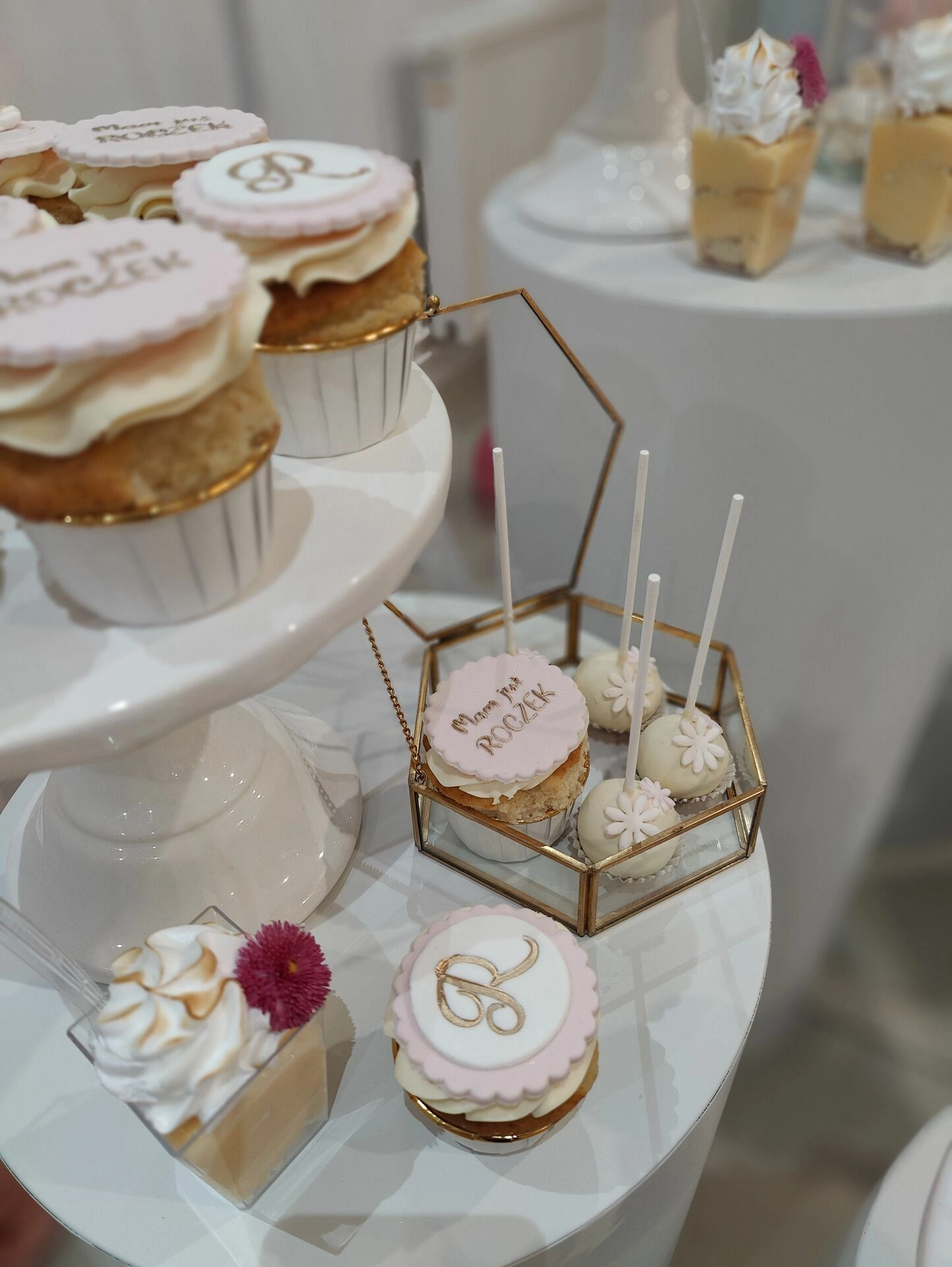 Na eleganckich, białych postumentach znalazły się ręcznie przygotowane desery na roczek, m.in.: mini beziki z owocami, babeczki z kremem i owocami, cake pops, makaroniki w odcieniach różu, mini tartaletki i lekkie deserki warstwowe w pojemniczkach. Każdy element stołu został dopracowany wizualnie – idealnie komponując się z różowo-złotym wystrojem sali i balonową dekoracją w kształcie cyfry „1”.
