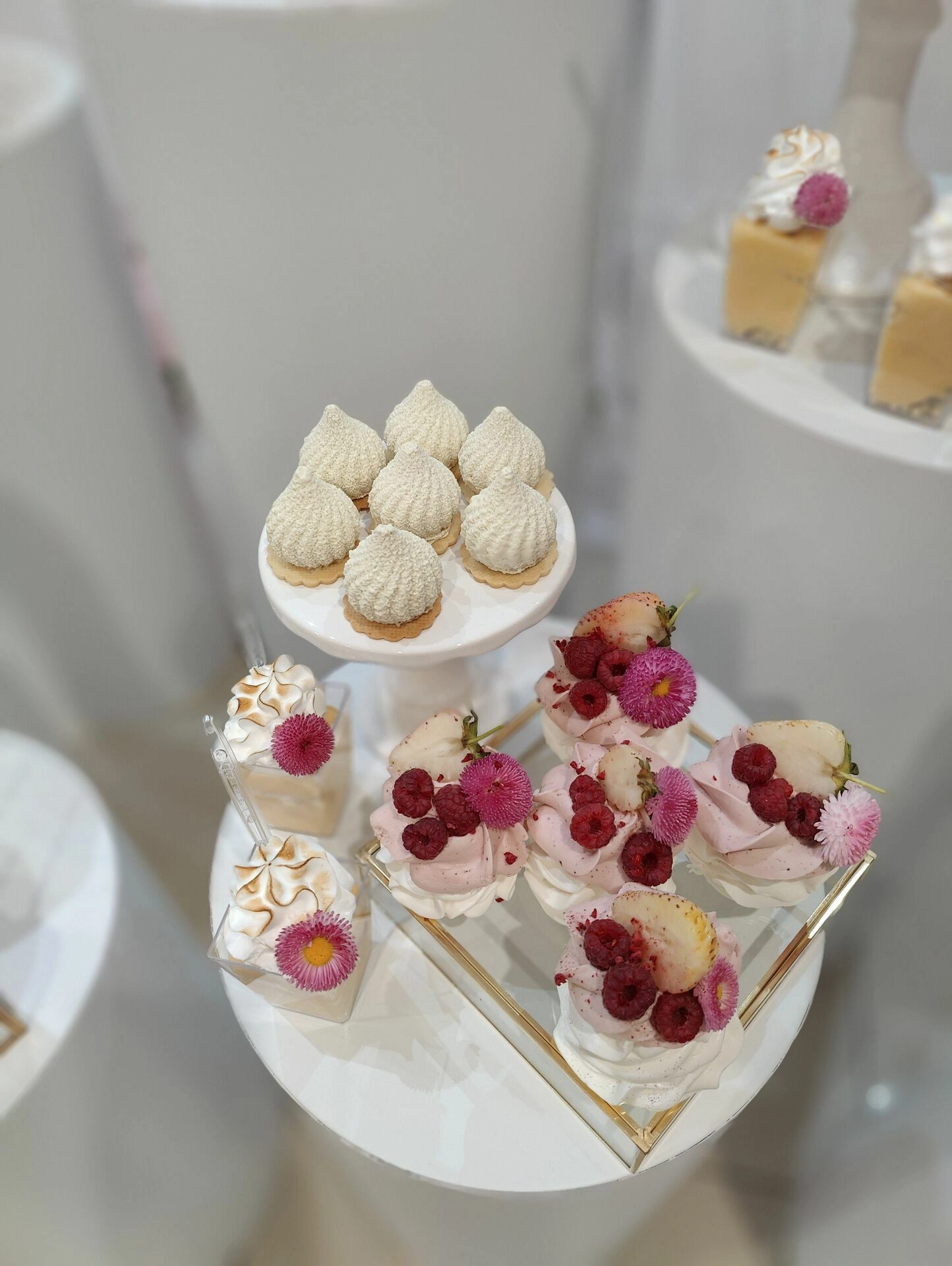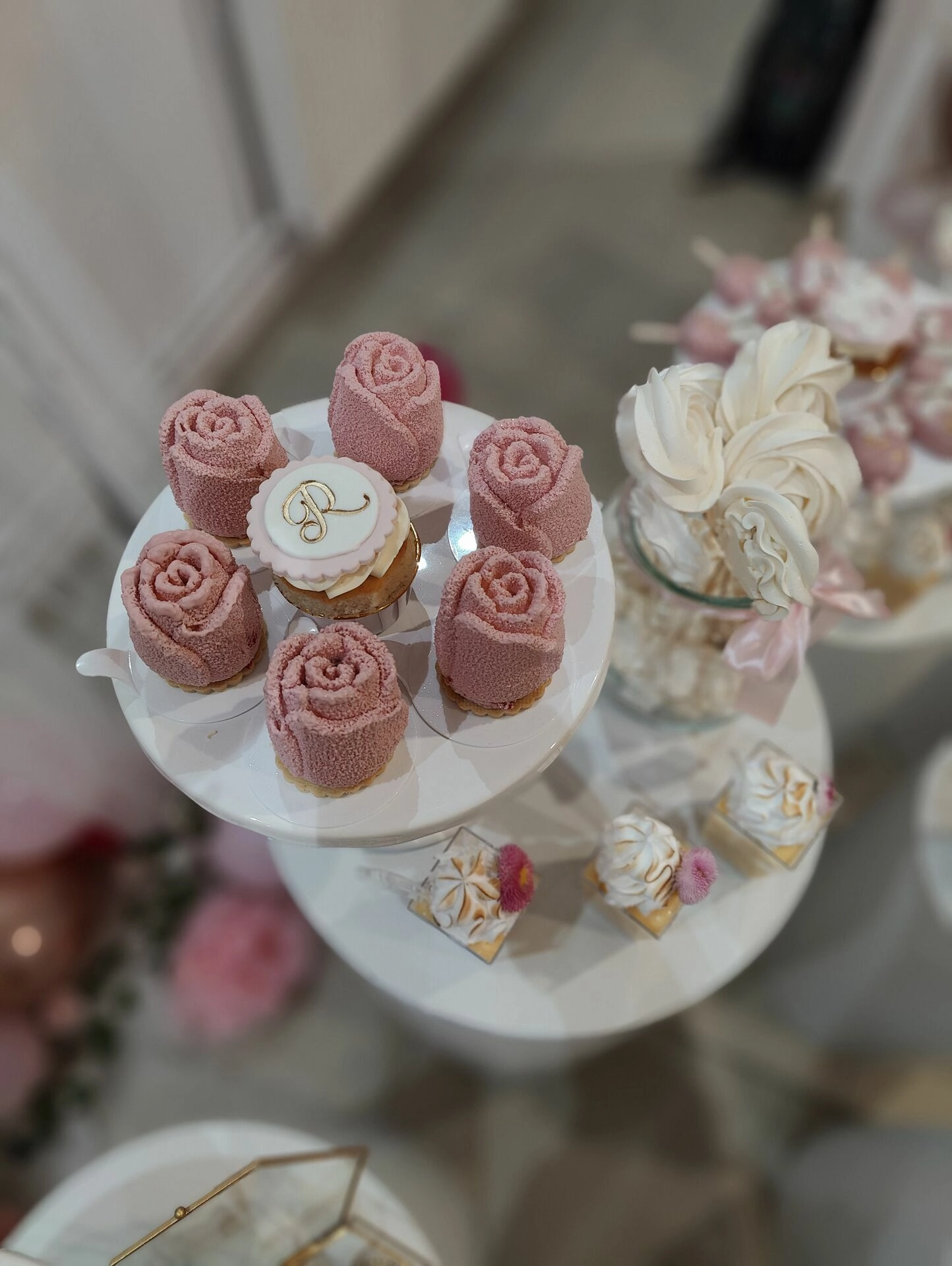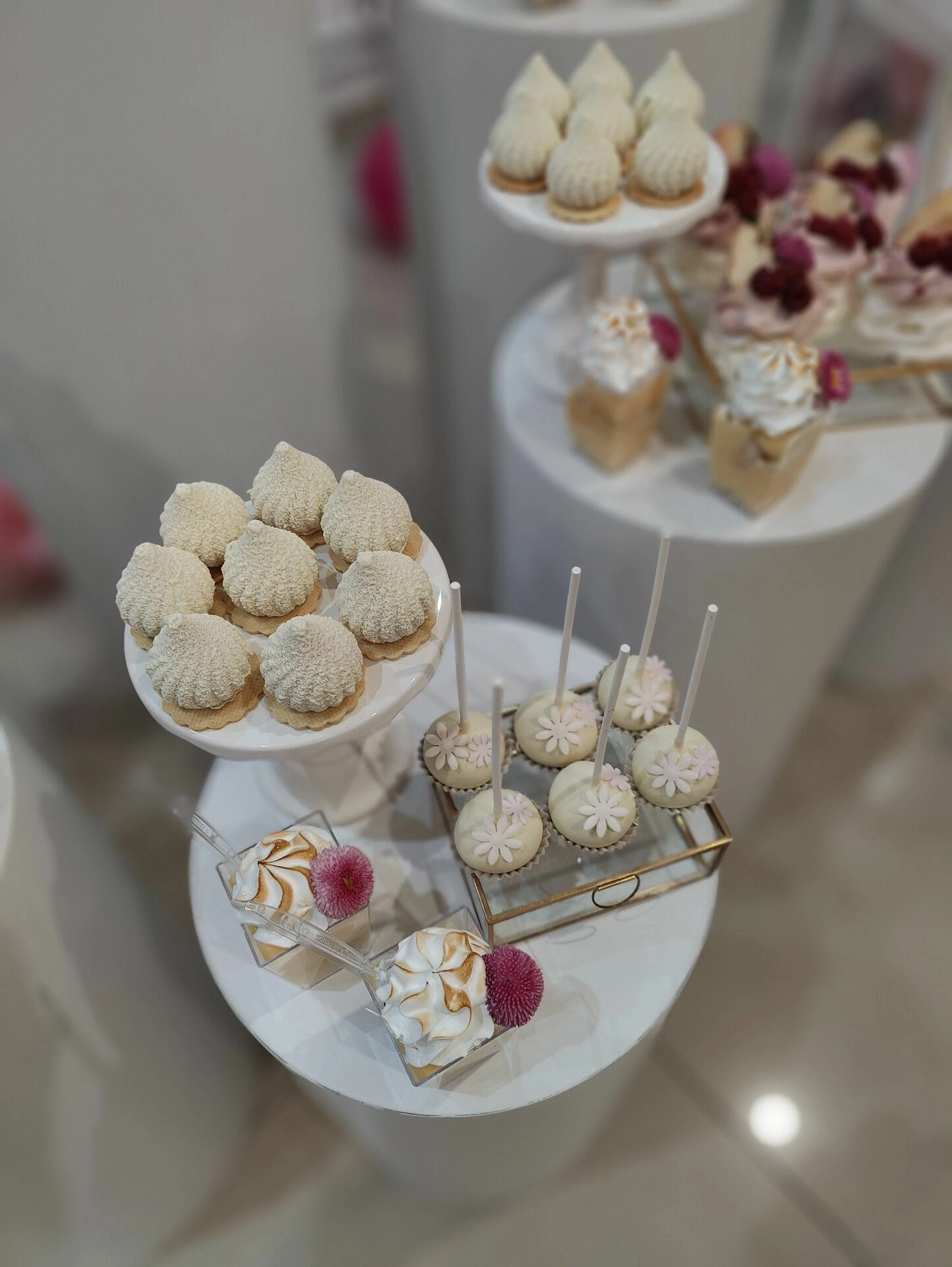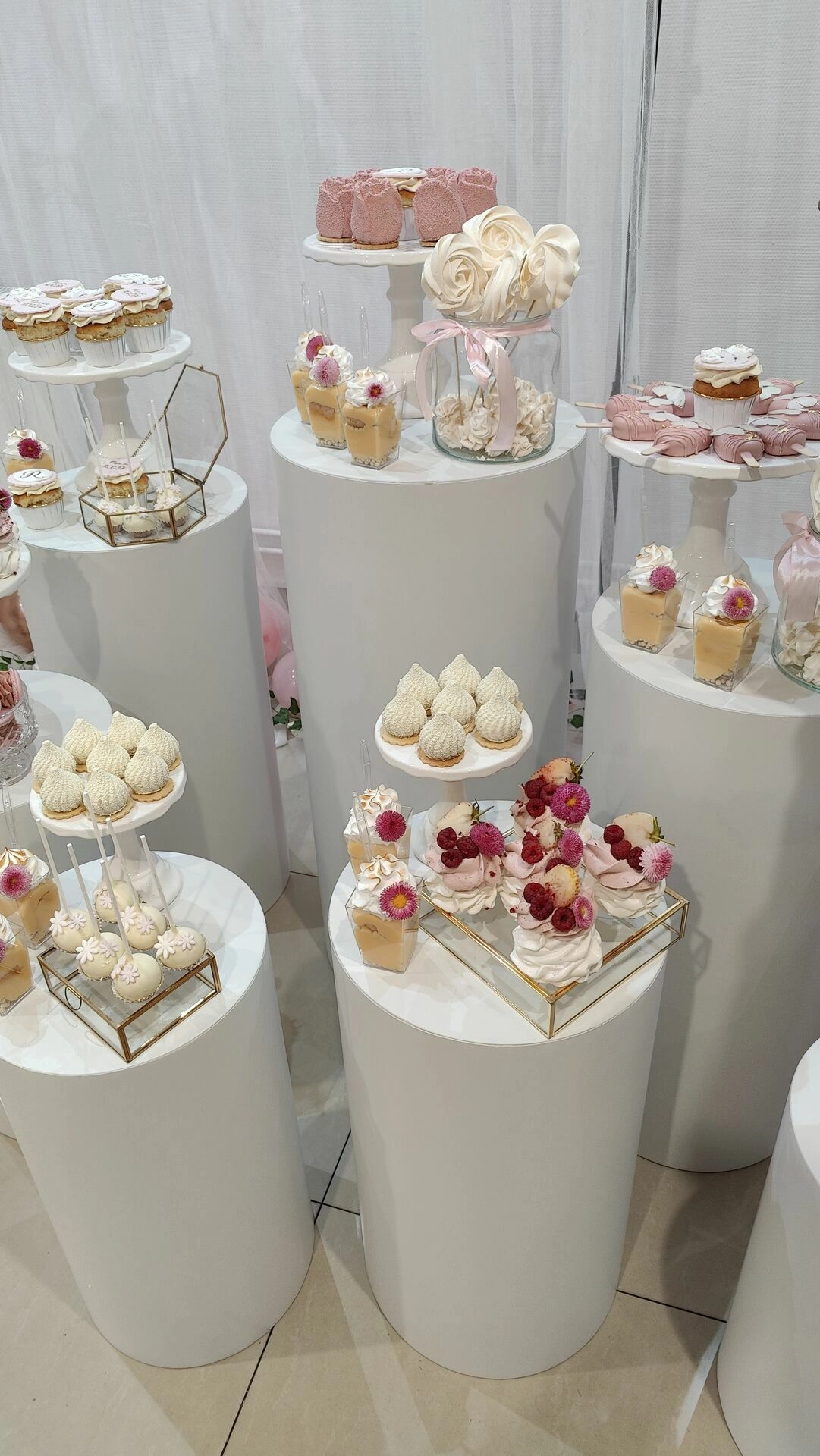 Na eleganckich, białych postumentach znalazły się ręcznie przygotowane desery na roczek, m.in.: mini beziki z owocami, babeczki z kremem i owocami, cake pops, makaroniki w odcieniach różu, mini tartaletki i lekkie deserki warstwowe w pojemniczkach. Każdy element stołu został dopracowany wizualnie – idealnie komponując się z różowo-złotym wystrojem sali i balonową dekoracją w kształcie cyfry „1”.