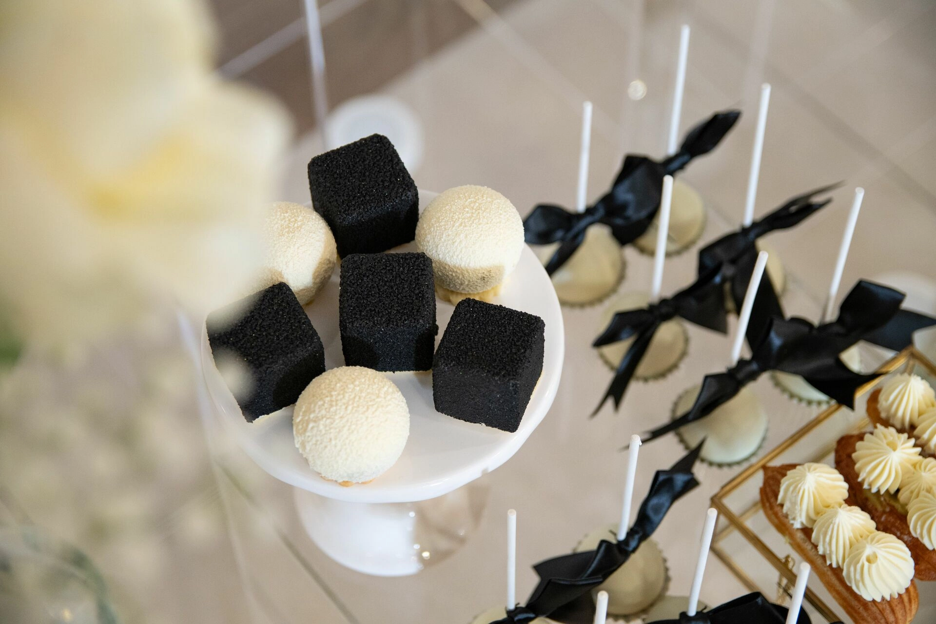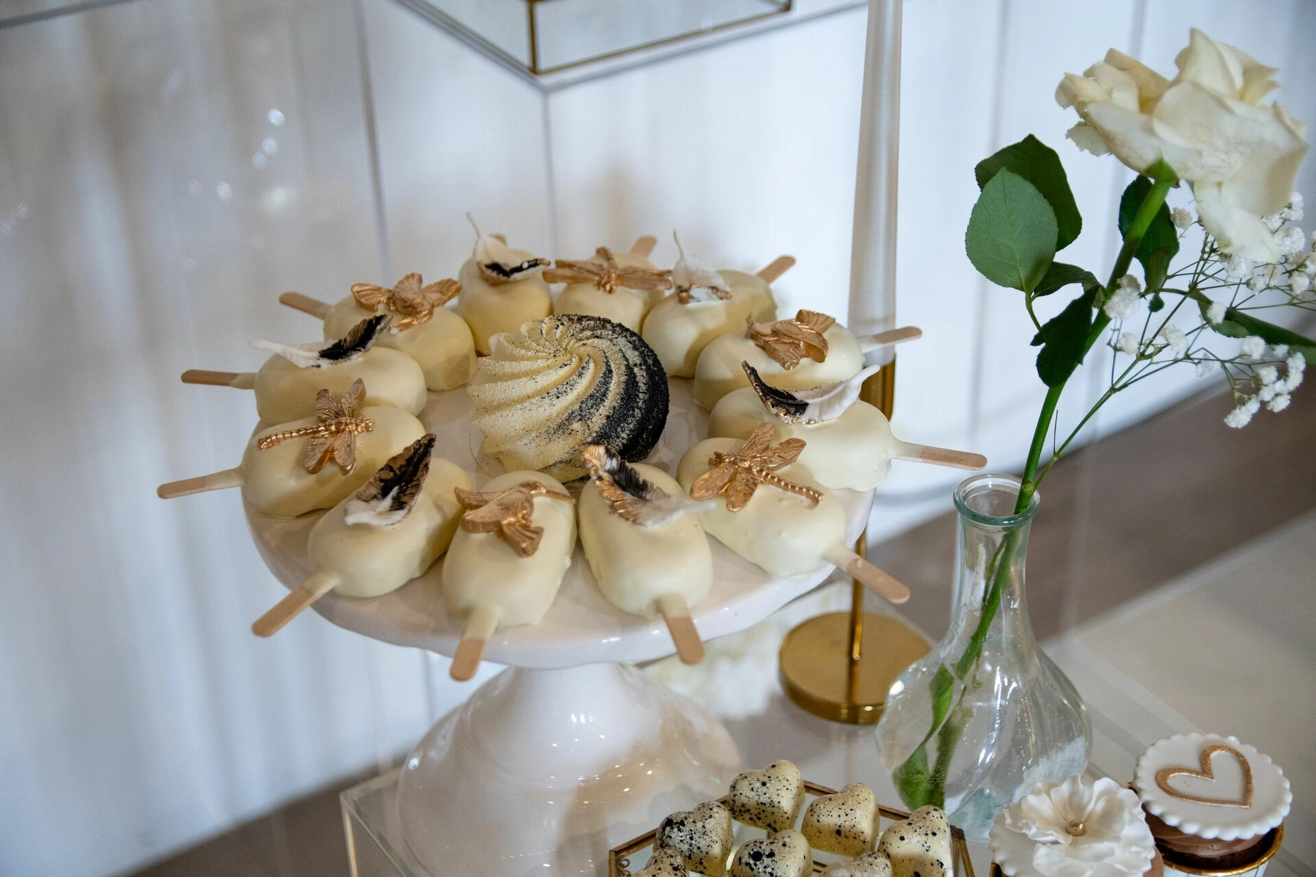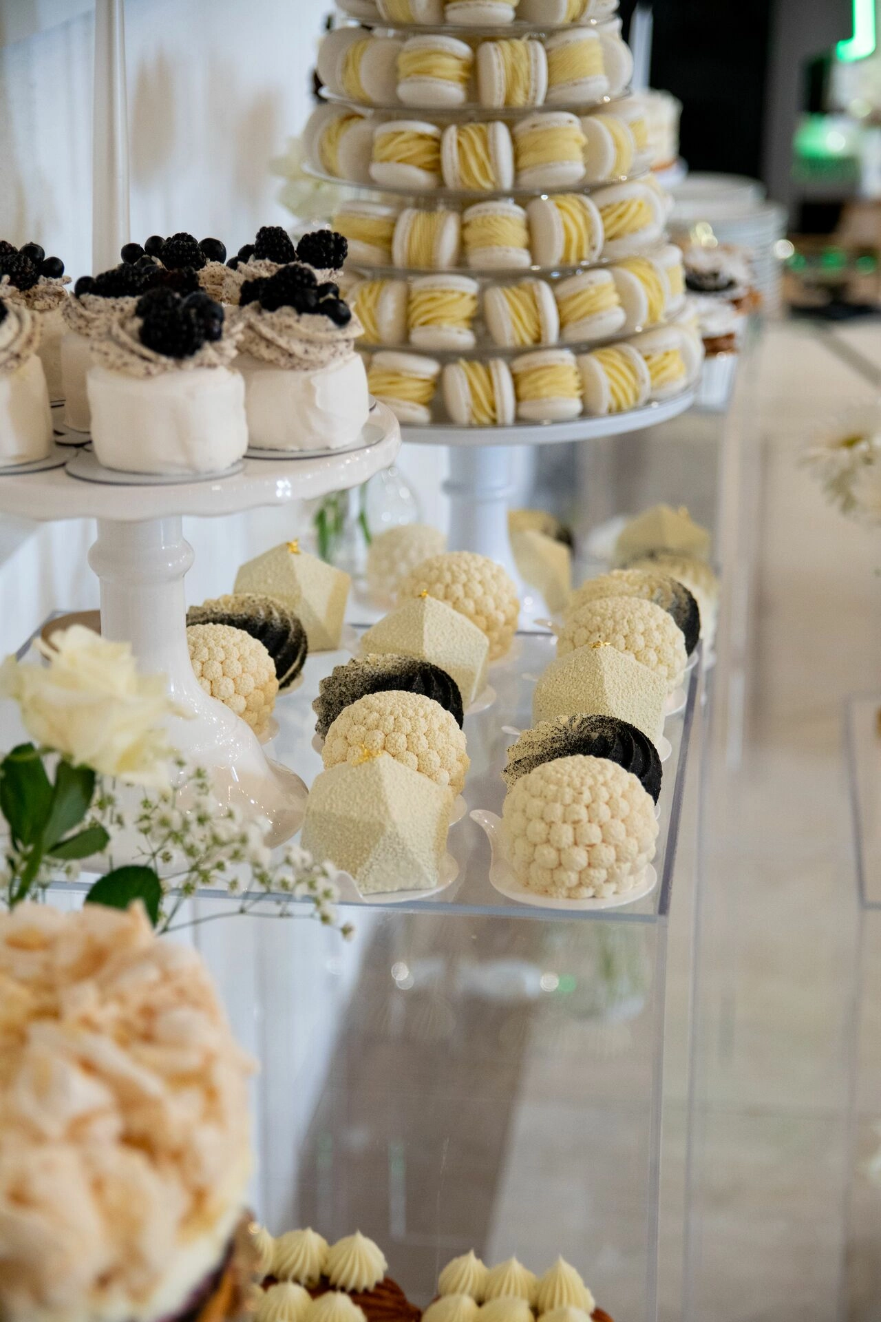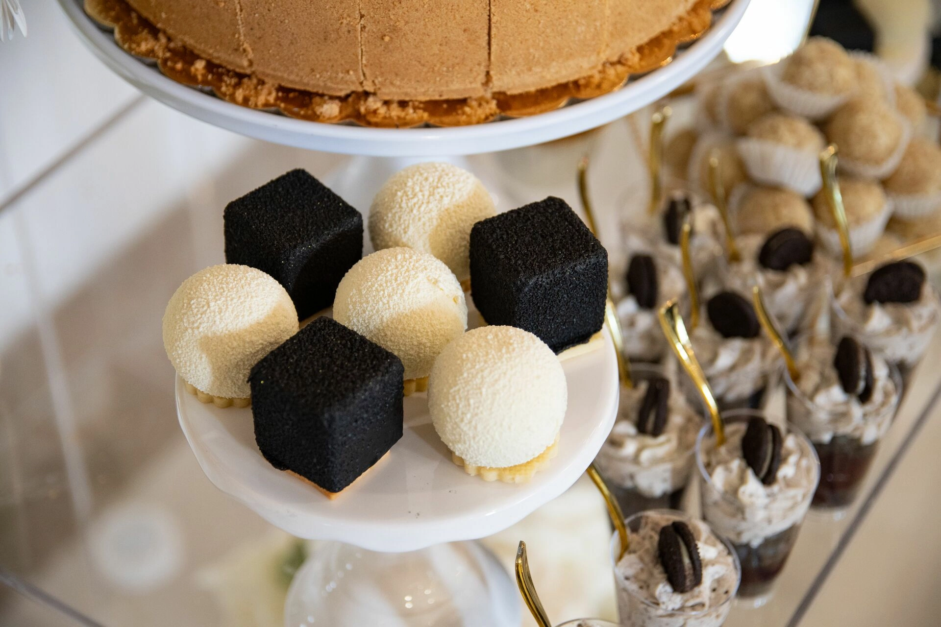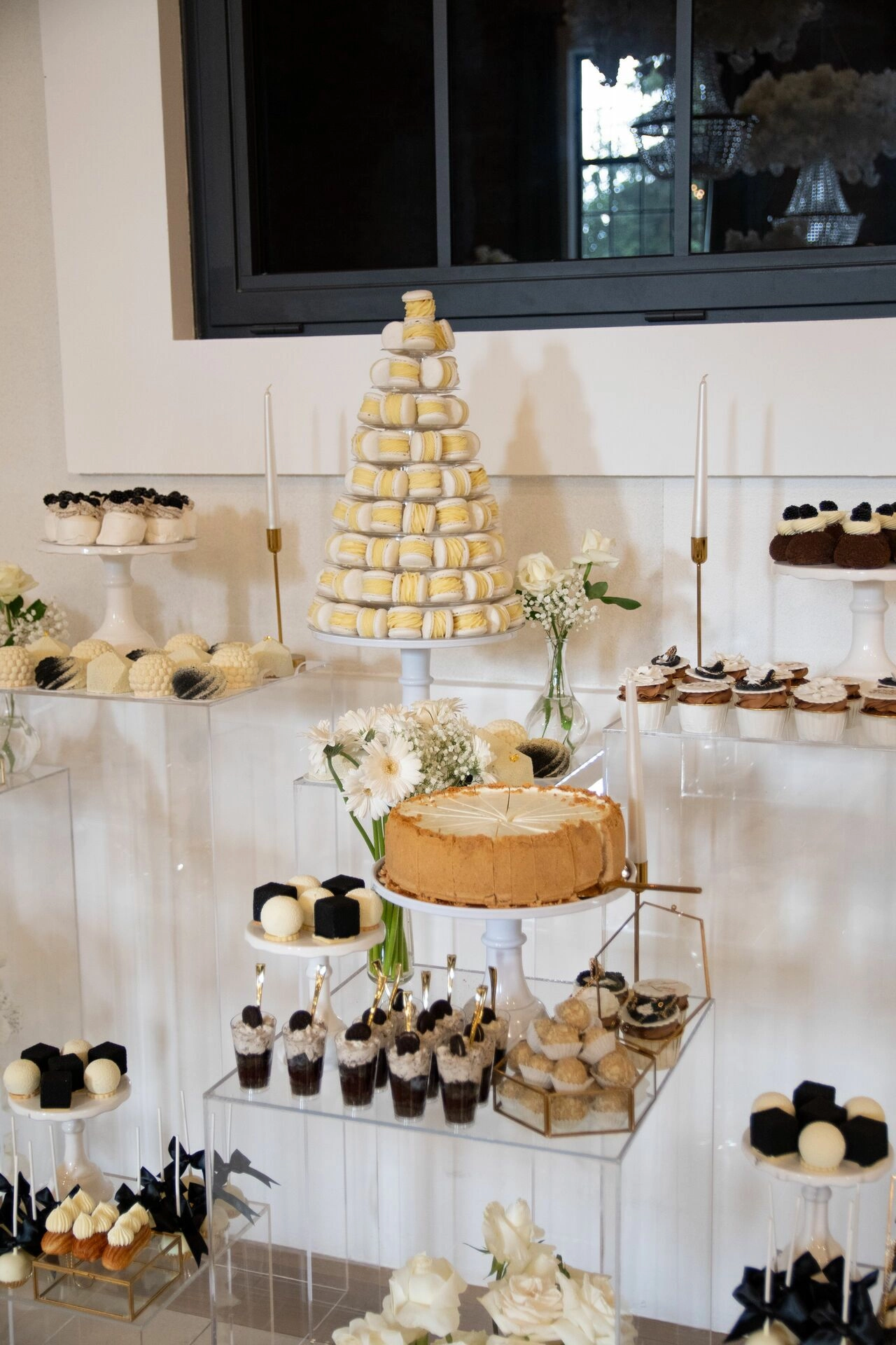 Wśród przygotowanych deserów znalazły się m.in.: makaroniki w formie efektownej wieży, monoporcje w czerni i bieli, mini ptysie, cake popsy, serniczki, eleganckie tartaletki z owocami leśnymi, ciasta premium i deserki w pucharkach. Klasyczna paleta kolorów – biel, czerń, złoto i delikatne beże – sprawia, że słodki bufet harmonizuje z każdą aranżacją sali weselnej. Dekorację stołu uzupełniają żywe kwiaty: białe róże i hortensje, które nadają całości subtelnego, romantycznego charakteru.