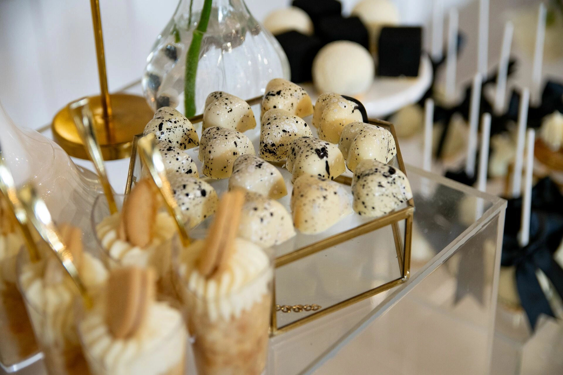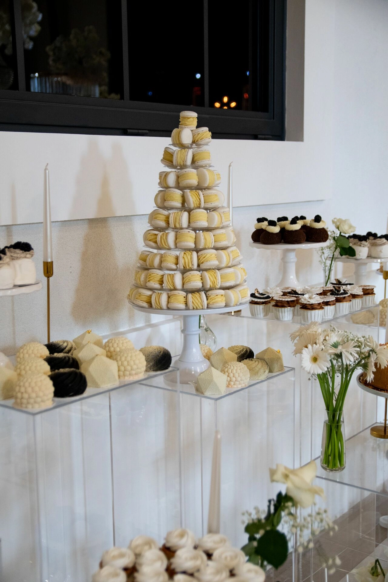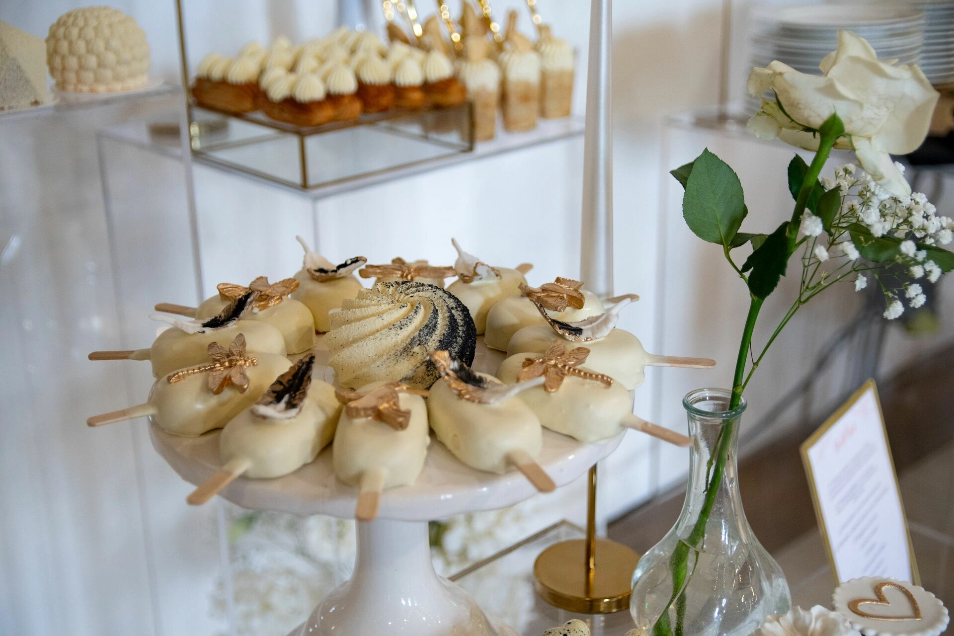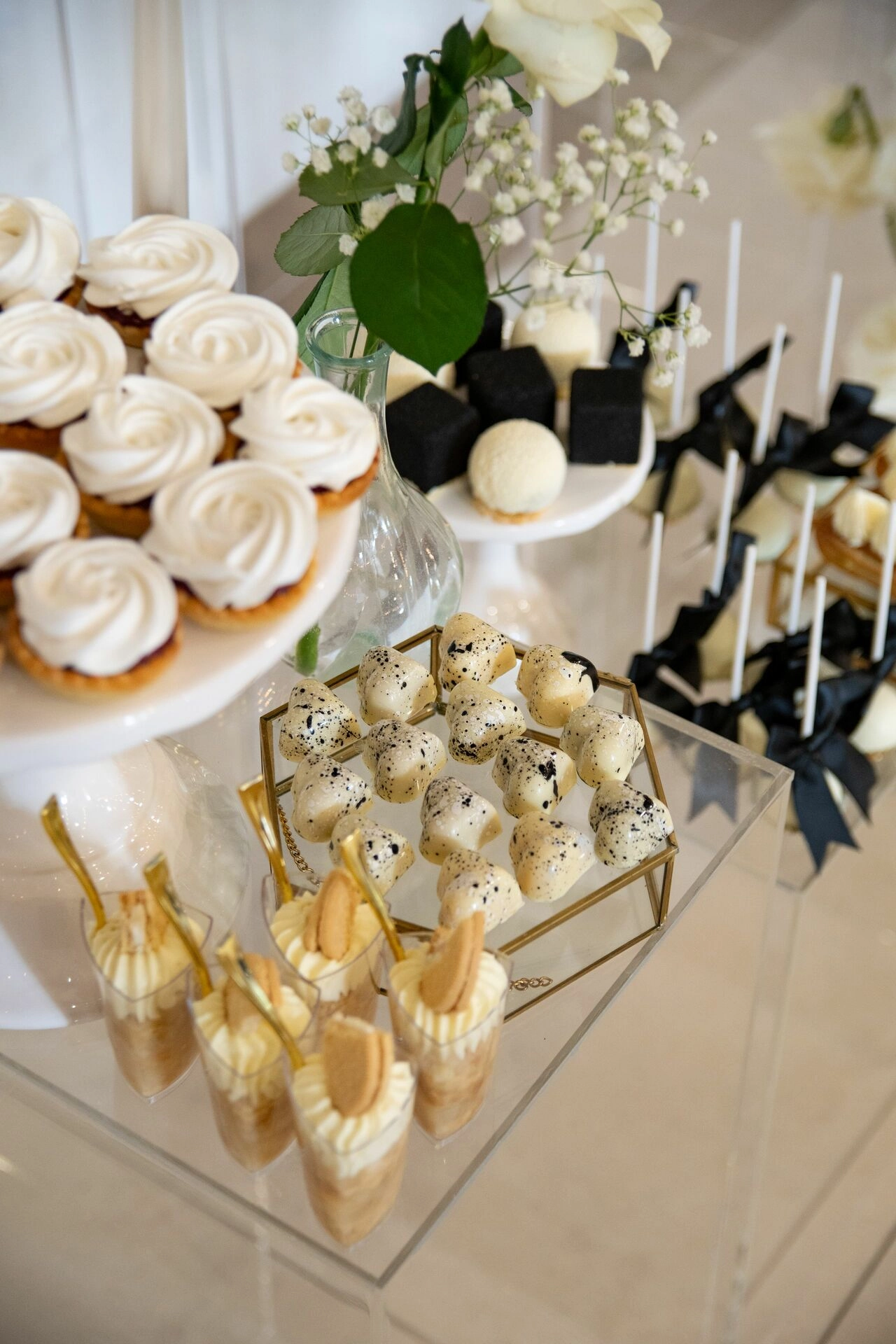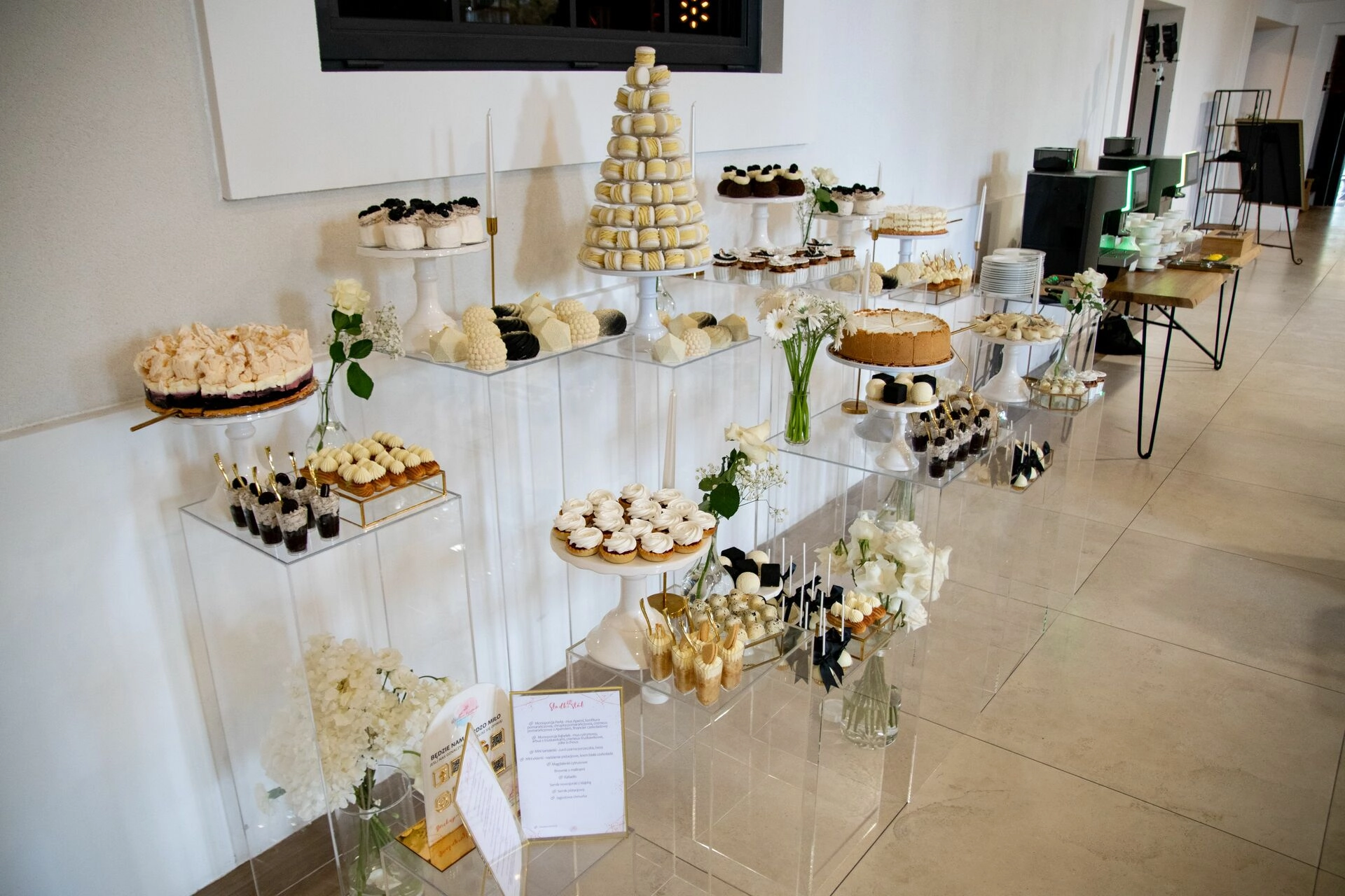 Wśród przygotowanych deserów znalazły się m.in.: makaroniki w formie efektownej wieży, monoporcje w czerni i bieli, mini ptysie, cake popsy, serniczki, eleganckie tartaletki z owocami leśnymi, ciasta premium i deserki w pucharkach. Klasyczna paleta kolorów – biel, czerń, złoto i delikatne beże – sprawia, że słodki bufet harmonizuje z każdą aranżacją sali weselnej. Dekorację stołu uzupełniają żywe kwiaty: białe róże i hortensje, które nadają całości subtelnego, romantycznego charakteru.