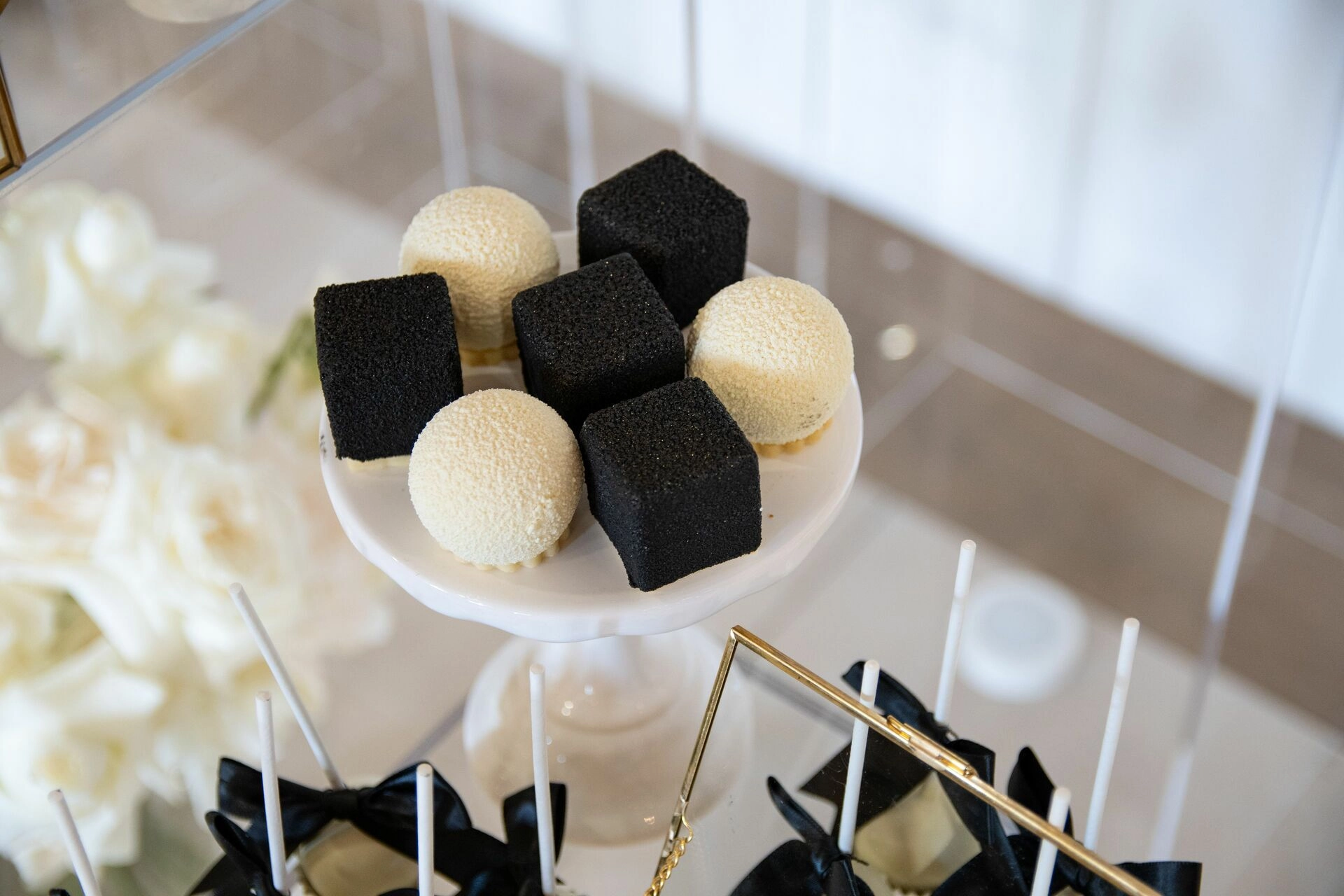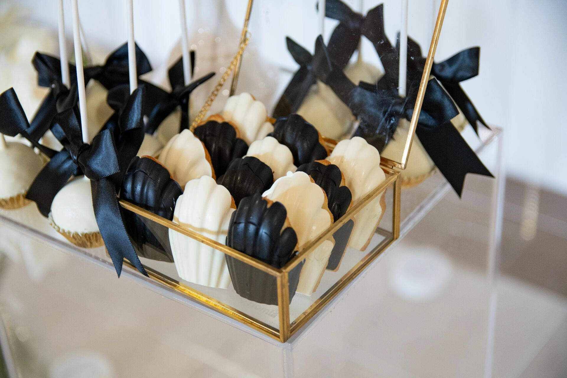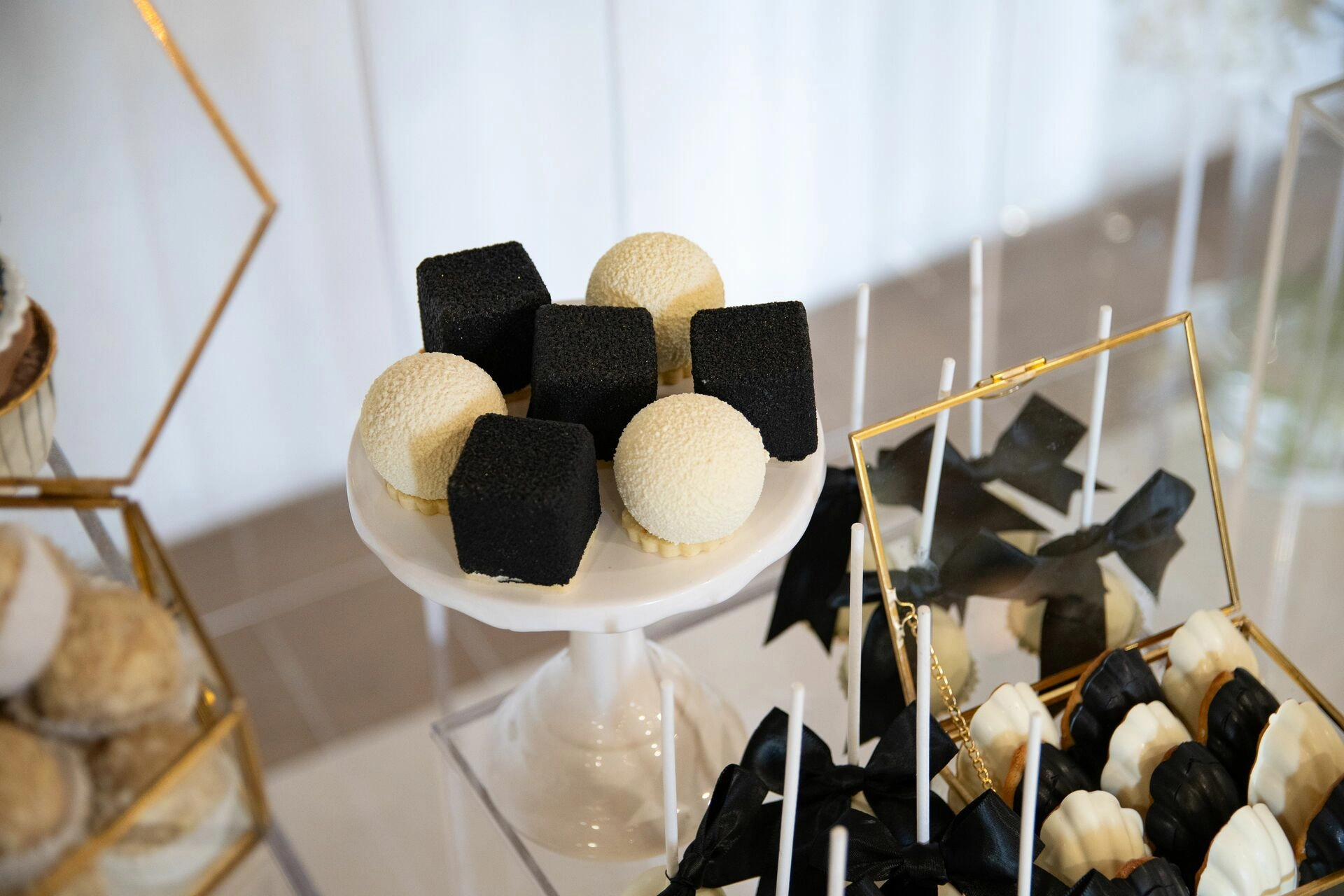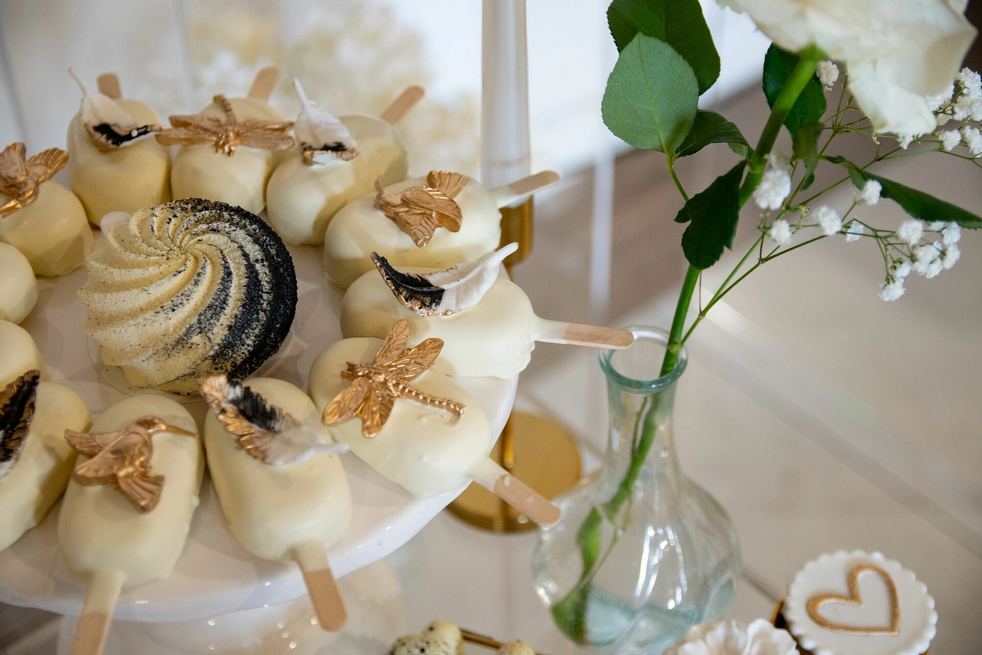 Wśród przygotowanych deserów znalazły się m.in.: makaroniki w formie efektownej wieży, monoporcje w czerni i bieli, mini ptysie, cake popsy, serniczki, eleganckie tartaletki z owocami leśnymi, ciasta premium i deserki w pucharkach. Klasyczna paleta kolorów – biel, czerń, złoto i delikatne beże – sprawia, że słodki bufet harmonizuje z każdą aranżacją sali weselnej. Dekorację stołu uzupełniają żywe kwiaty: białe róże i hortensje, które nadają całości subtelnego, romantycznego charakteru.