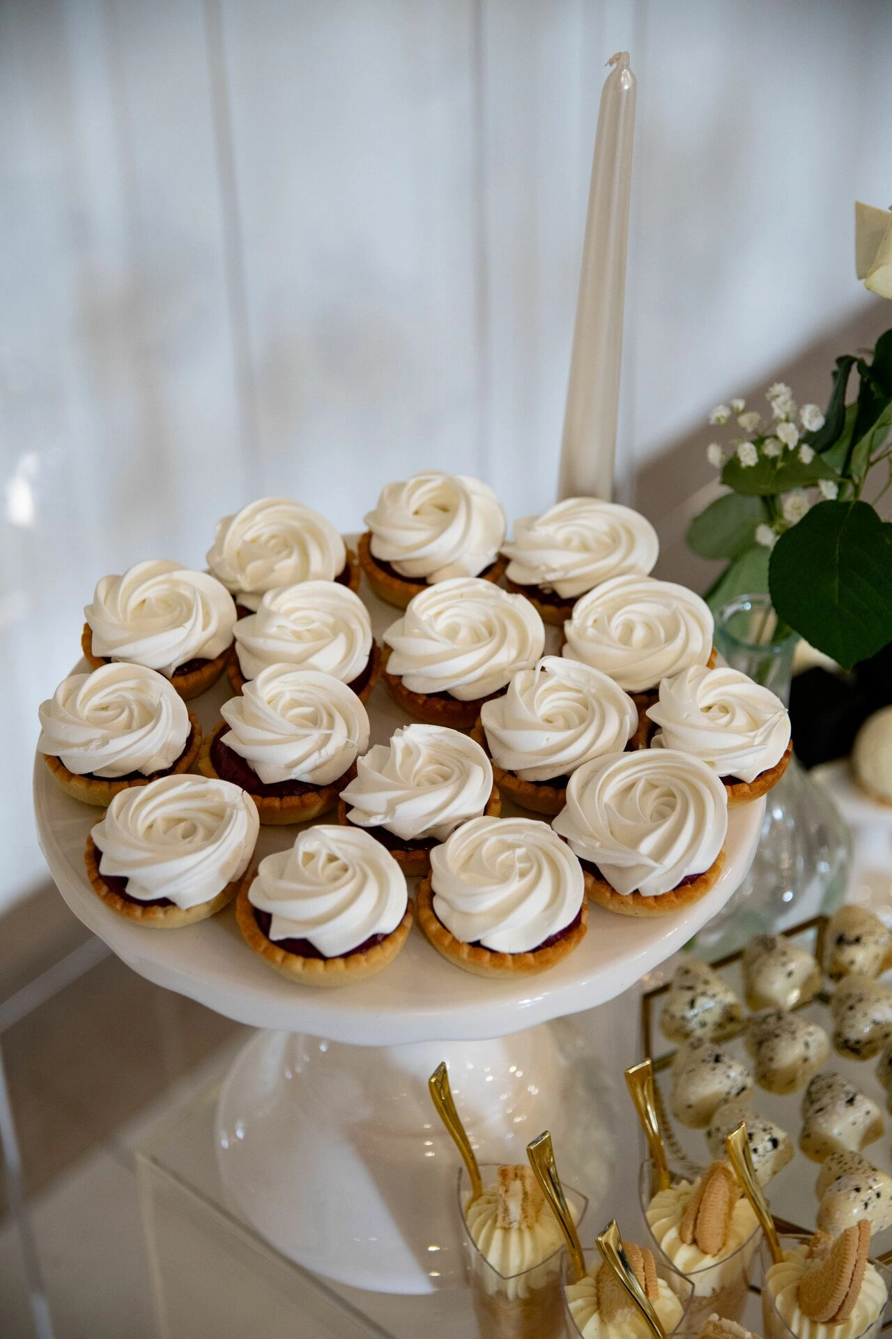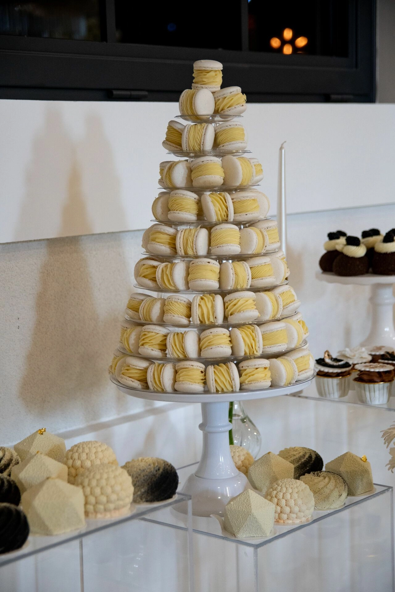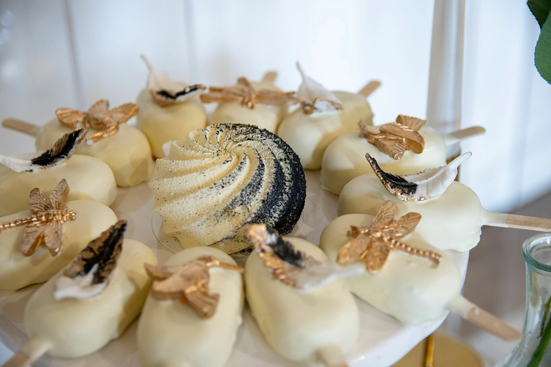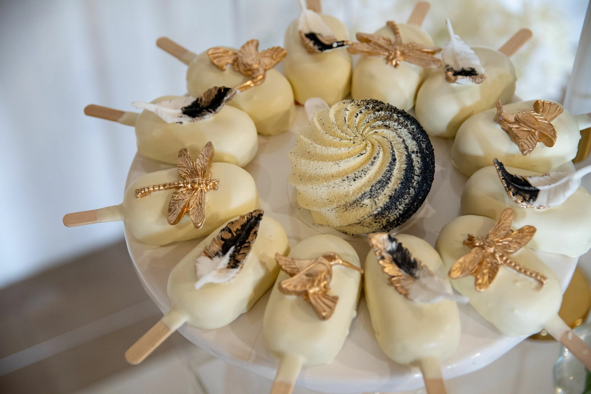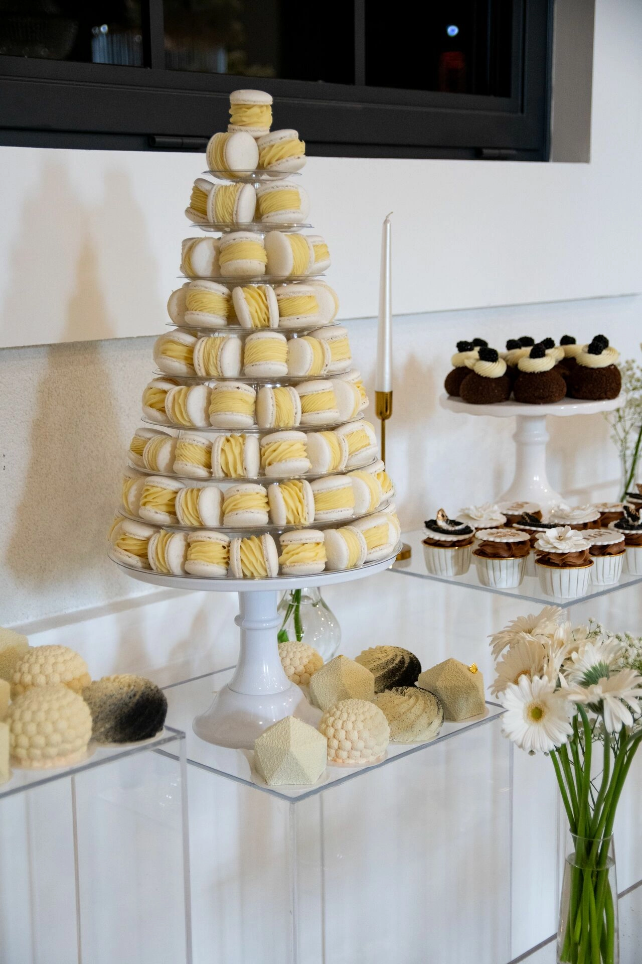 Wśród przygotowanych deserów znalazły się m.in.: makaroniki w formie efektownej wieży, monoporcje w czerni i bieli, mini ptysie, cake popsy, serniczki, eleganckie tartaletki z owocami leśnymi, ciasta premium i deserki w pucharkach. Klasyczna paleta kolorów – biel, czerń, złoto i delikatne beże – sprawia, że słodki bufet harmonizuje z każdą aranżacją sali weselnej. Dekorację stołu uzupełniają żywe kwiaty: białe róże i hortensje, które nadają całości subtelnego, romantycznego charakteru.