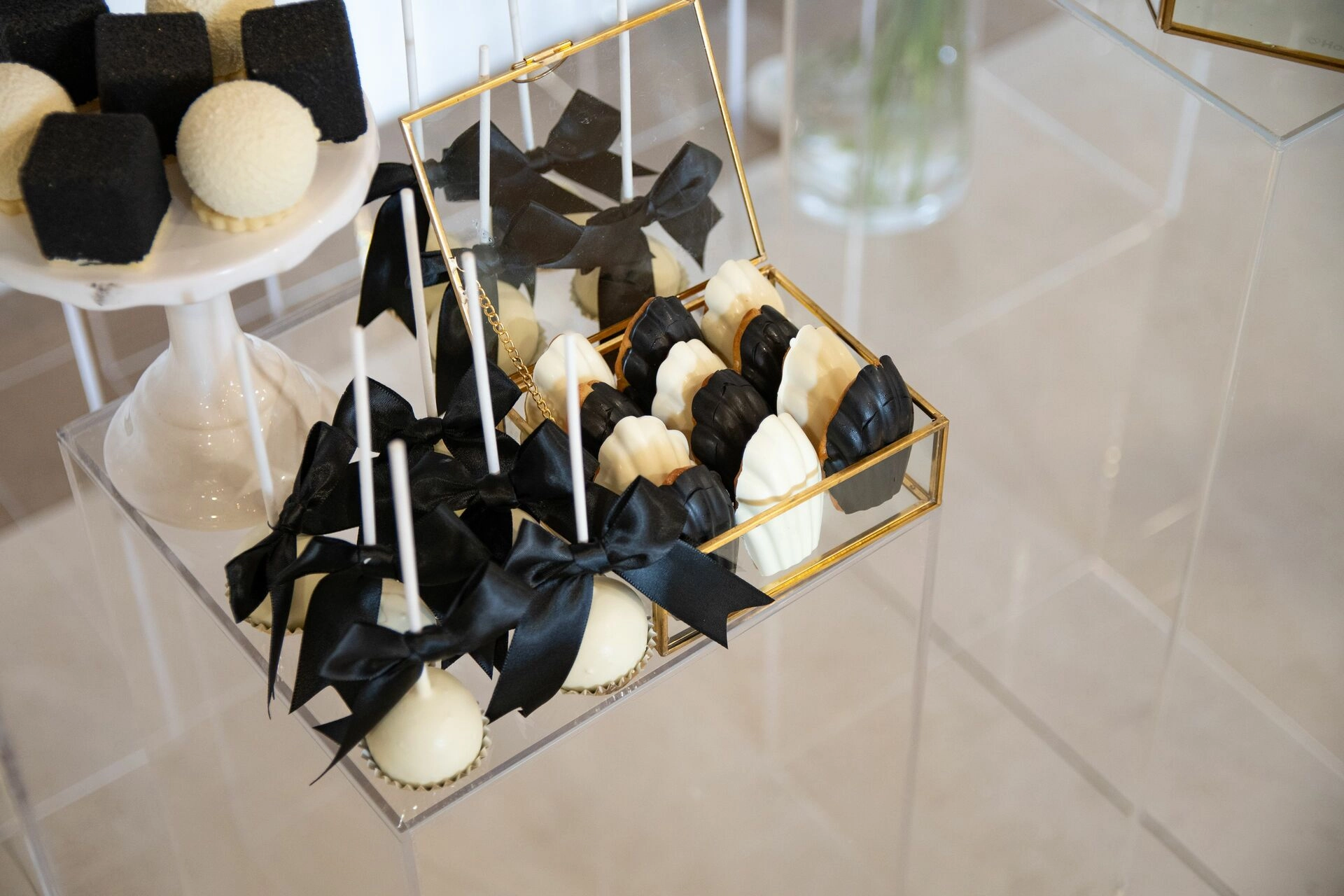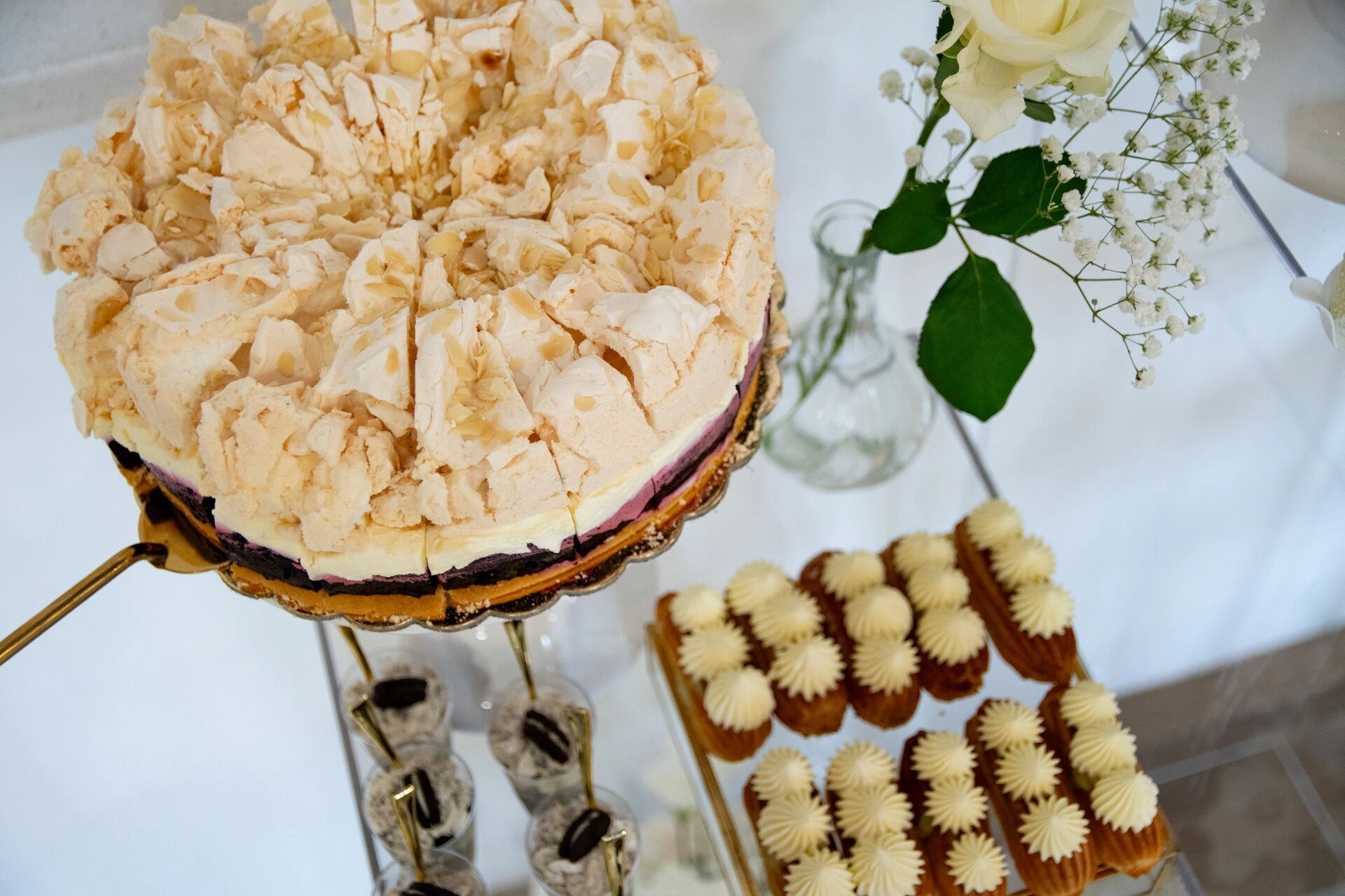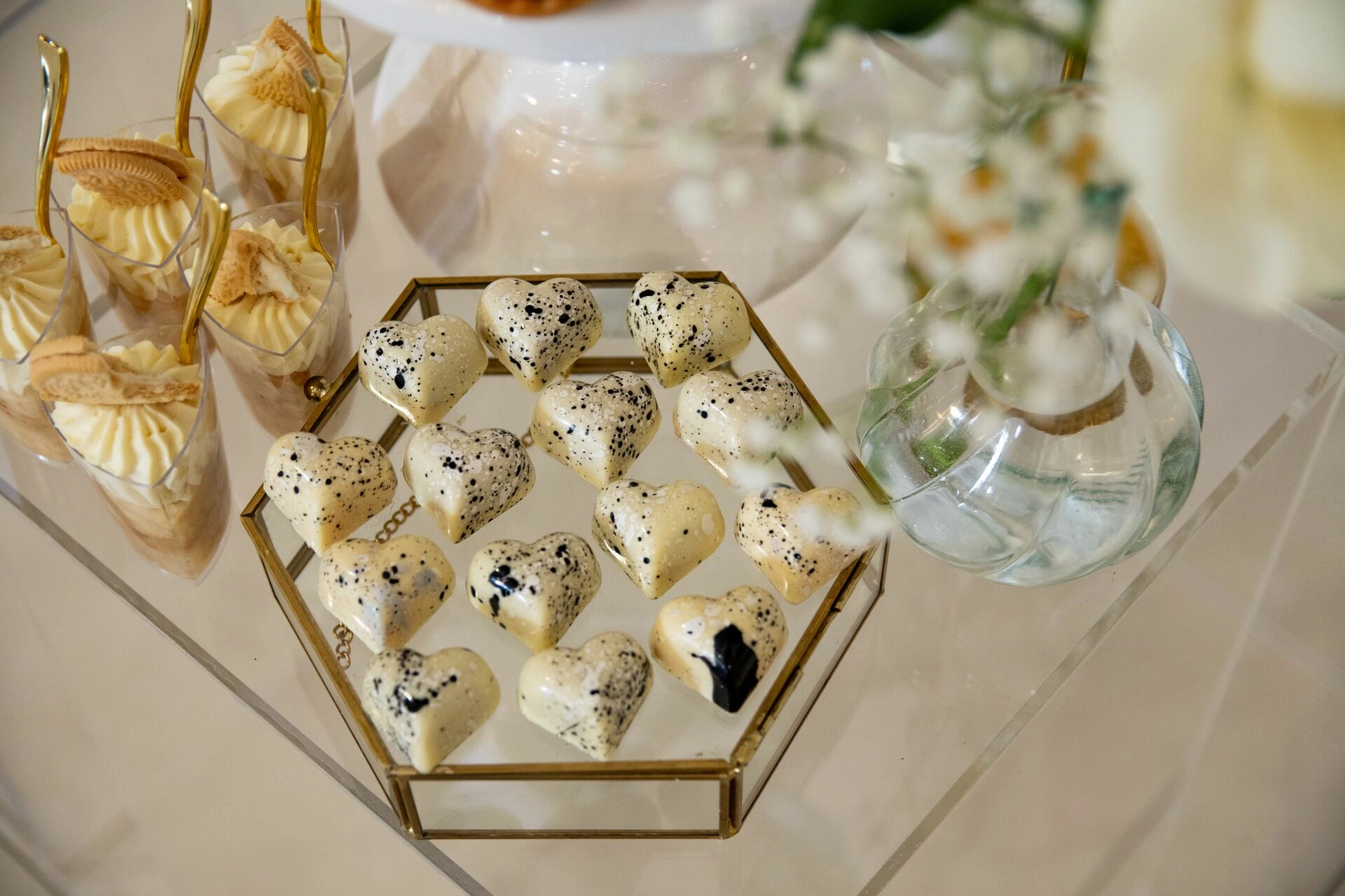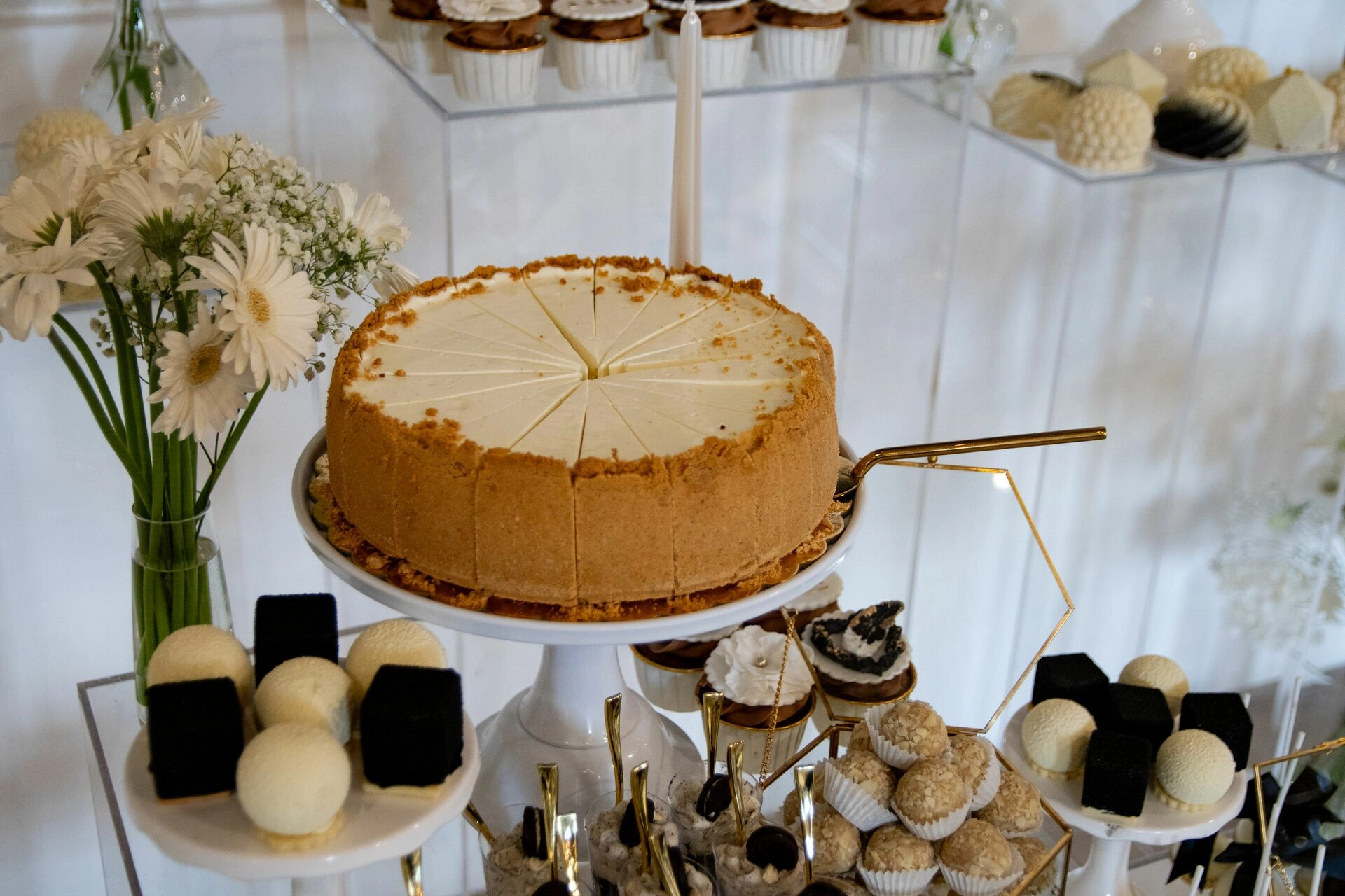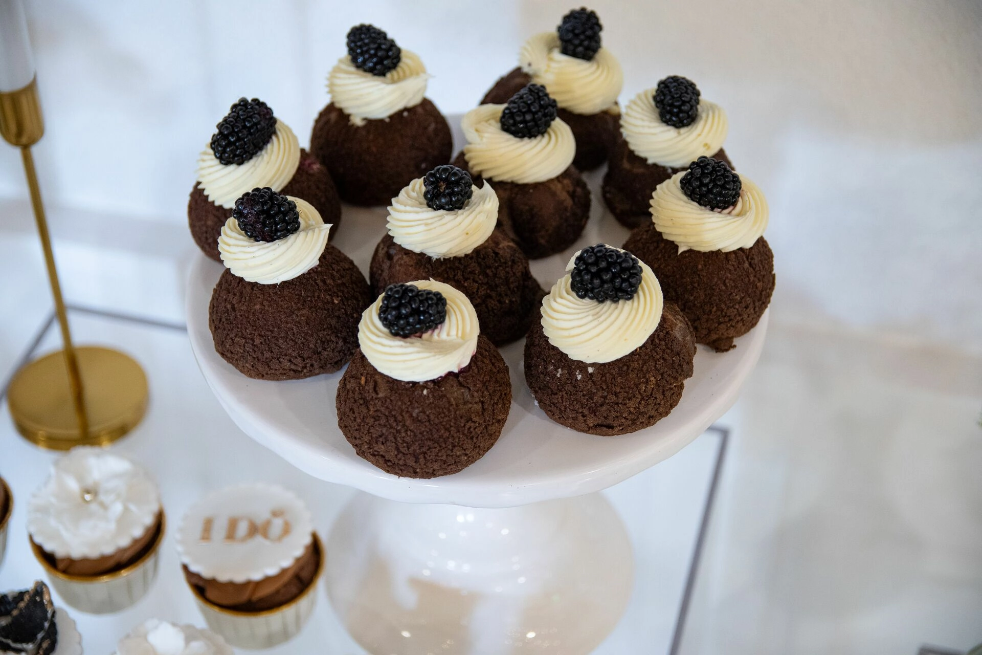 Wśród przygotowanych deserów znalazły się m.in.: makaroniki w formie efektownej wieży, monoporcje w czerni i bieli, mini ptysie, cake popsy, serniczki, eleganckie tartaletki z owocami leśnymi, ciasta premium i deserki w pucharkach. Klasyczna paleta kolorów – biel, czerń, złoto i delikatne beże – sprawia, że słodki bufet harmonizuje z każdą aranżacją sali weselnej. Dekorację stołu uzupełniają żywe kwiaty: białe róże i hortensje, które nadają całości subtelnego, romantycznego charakteru.