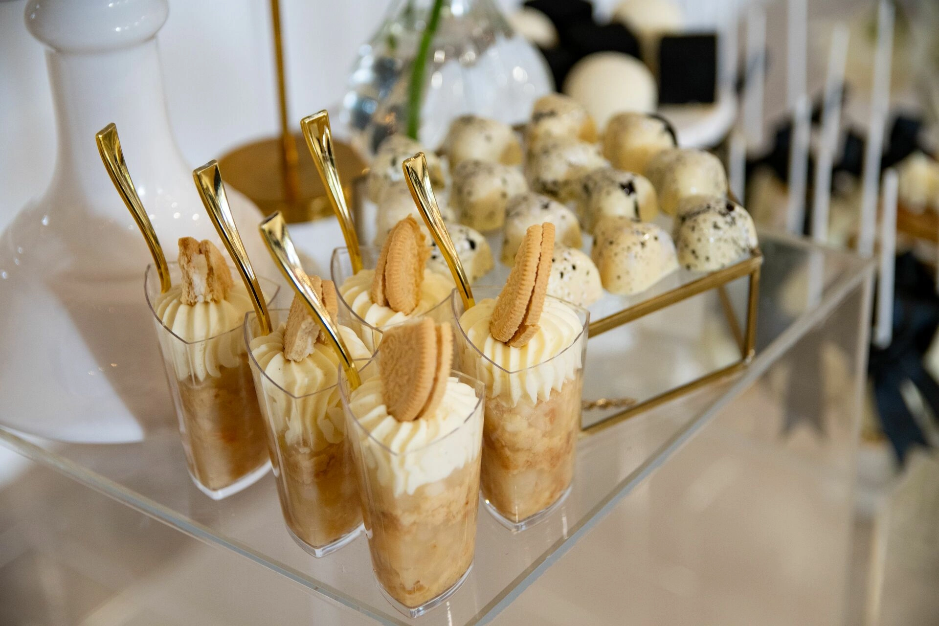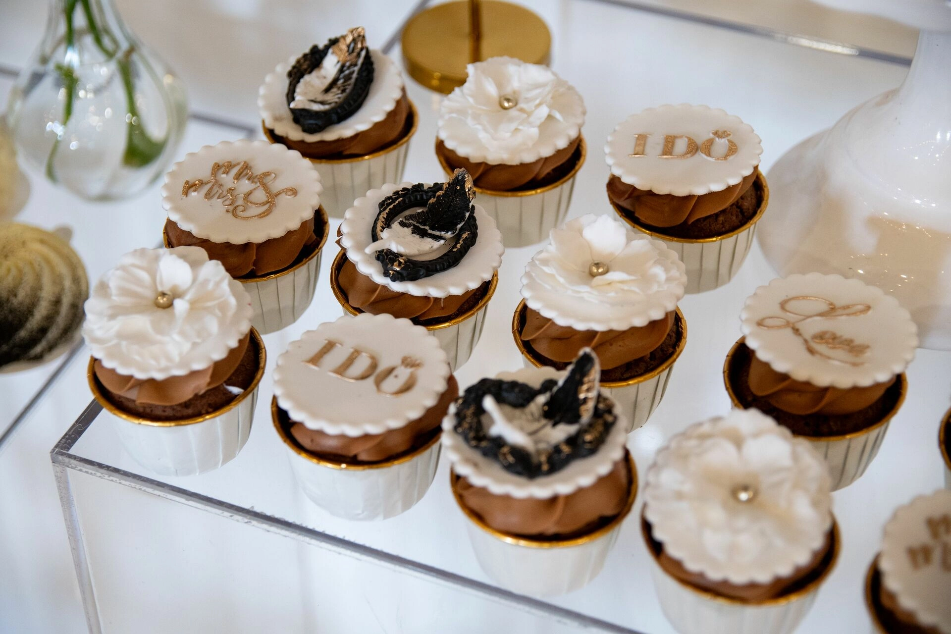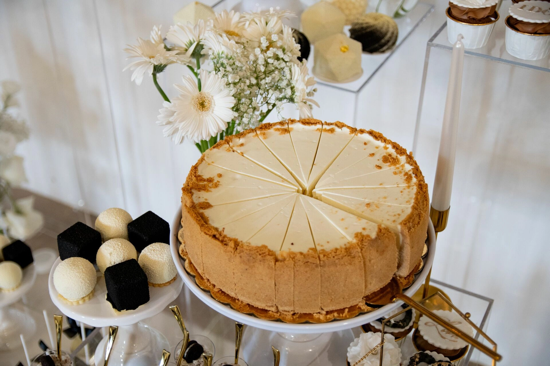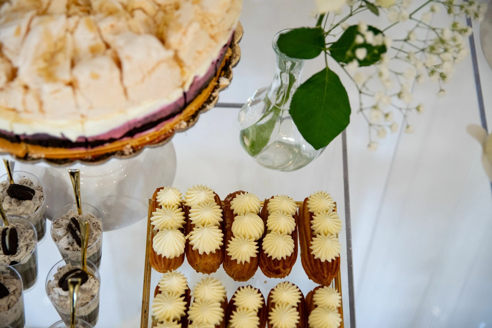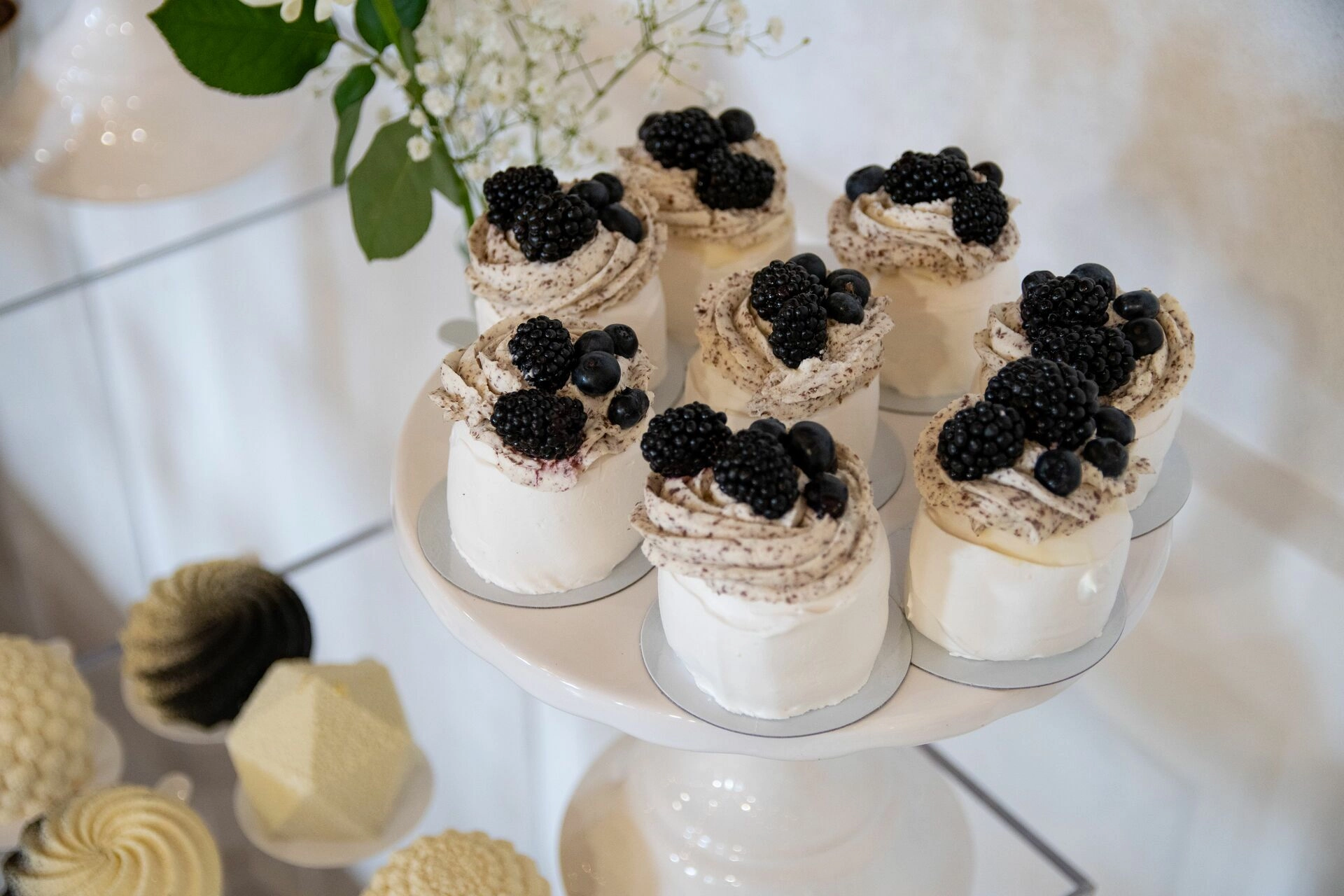 Wśród przygotowanych deserów znalazły się m.in.: makaroniki w formie efektownej wieży, monoporcje w czerni i bieli, mini ptysie, cake popsy, serniczki, eleganckie tartaletki z owocami leśnymi, ciasta premium i deserki w pucharkach. Klasyczna paleta kolorów – biel, czerń, złoto i delikatne beże – sprawia, że słodki bufet harmonizuje z każdą aranżacją sali weselnej. Dekorację stołu uzupełniają żywe kwiaty: białe róże i hortensje, które nadają całości subtelnego, romantycznego charakteru.