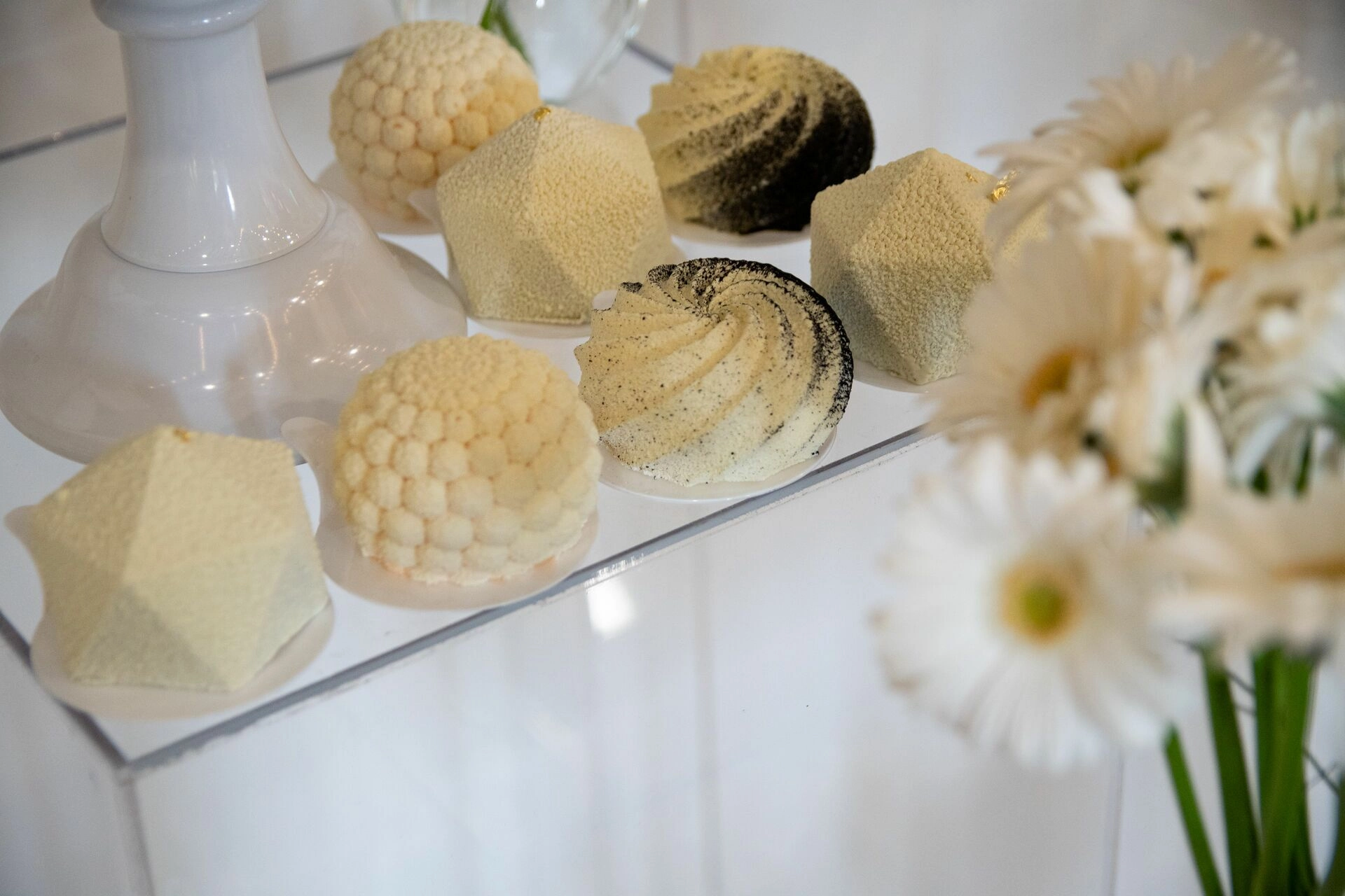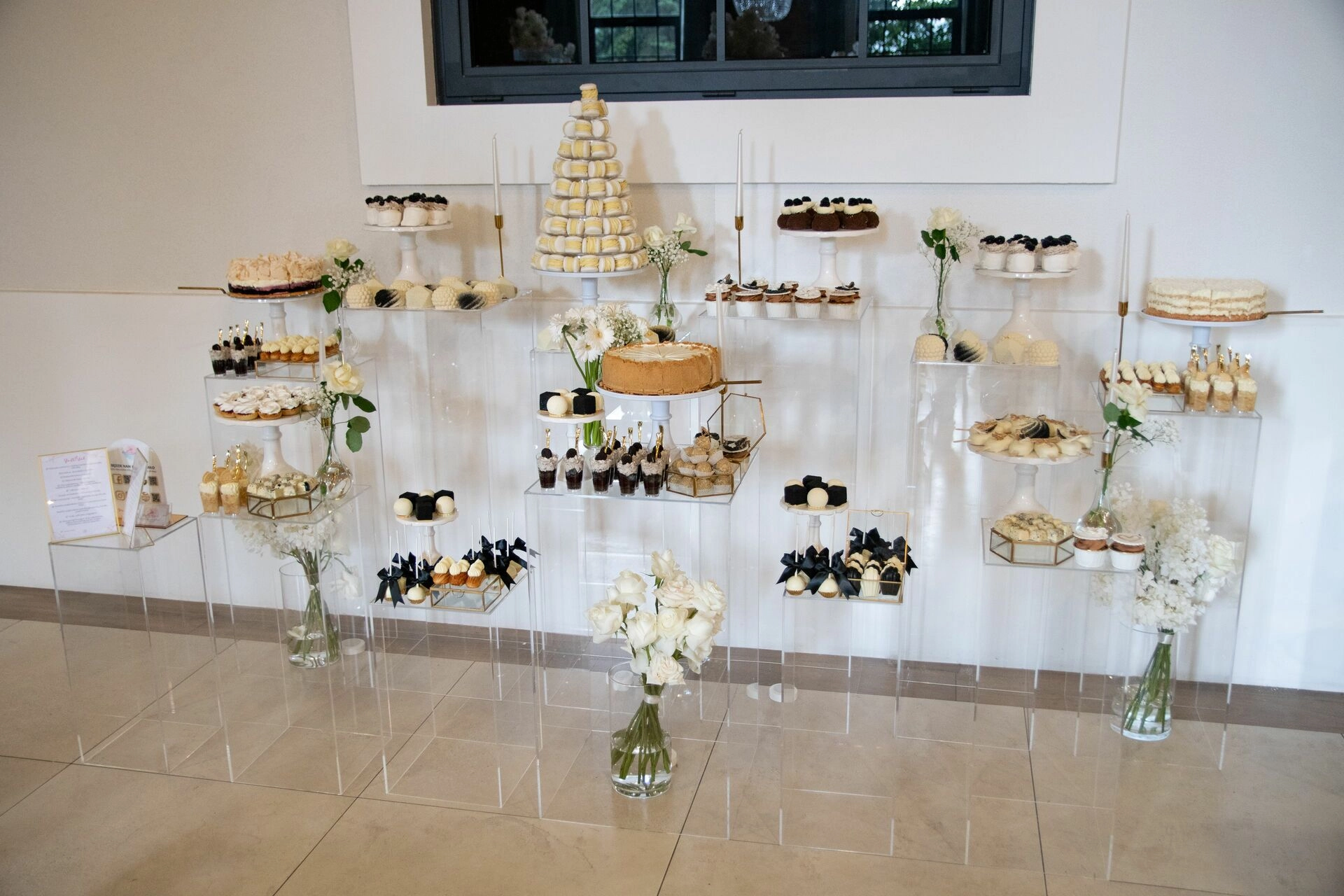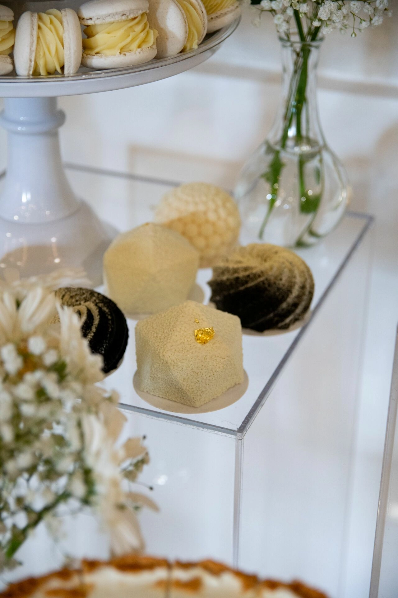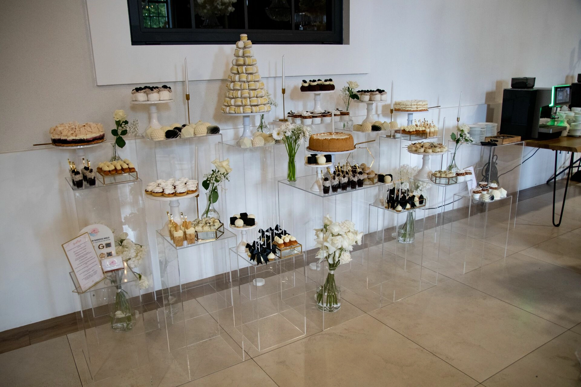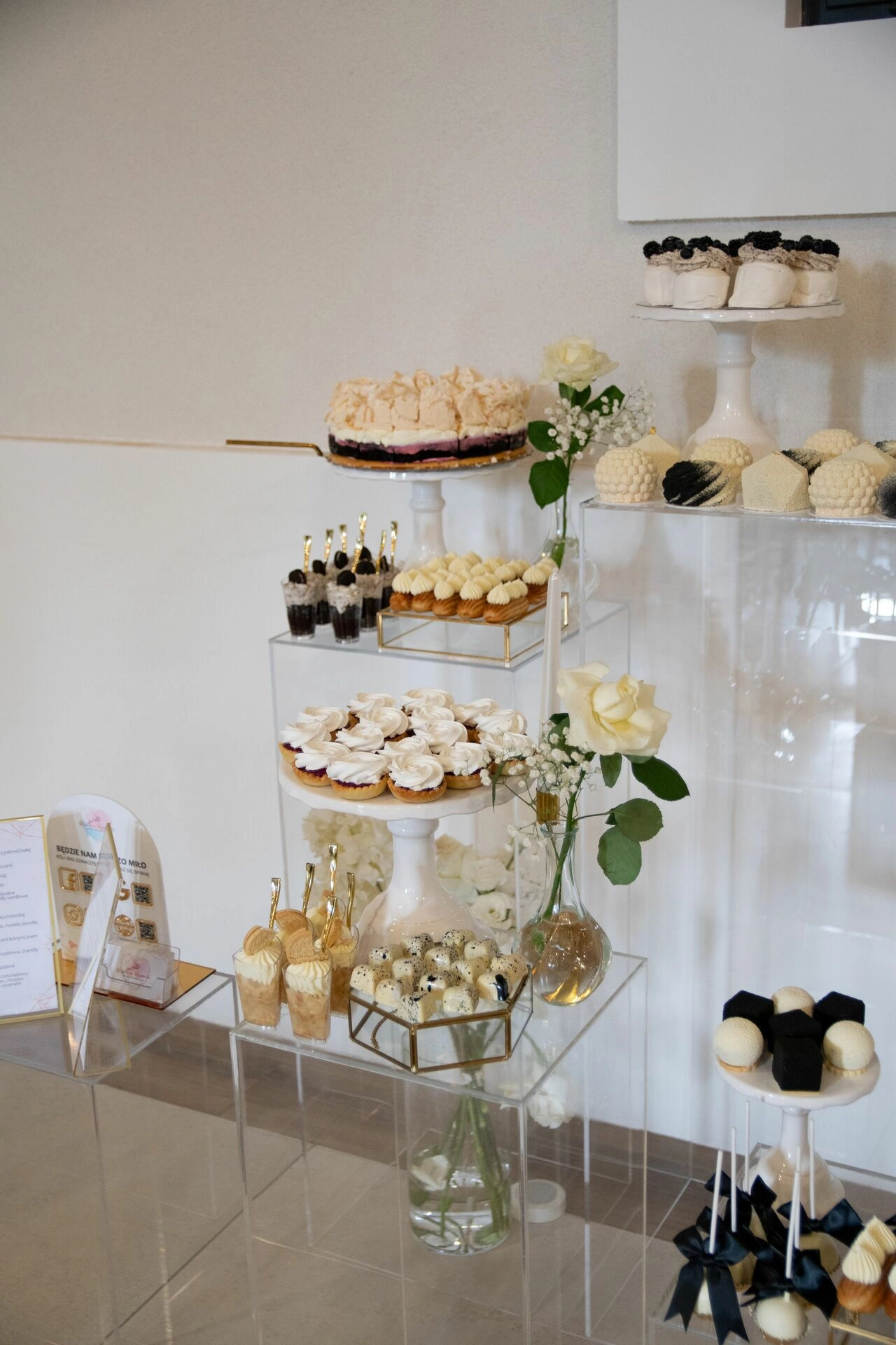 Ten słodki stół weselny to połączenie nowoczesnego minimalizmu z eleganckim stylem glamour. Wszystkie wypieki zostały zaaranżowane na transparentnych postumentach z plexi, które nadają całości niezwykłej lekkości i efektu „unoszenia się” słodkości w powietrzu. To idealna oprawa dla luksusowego przyjęcia weselnego – stół nie tylko przyciąga wzrok, ale także wspaniale prezentuje się na zdjęciach i podkreśla estetykę sali.