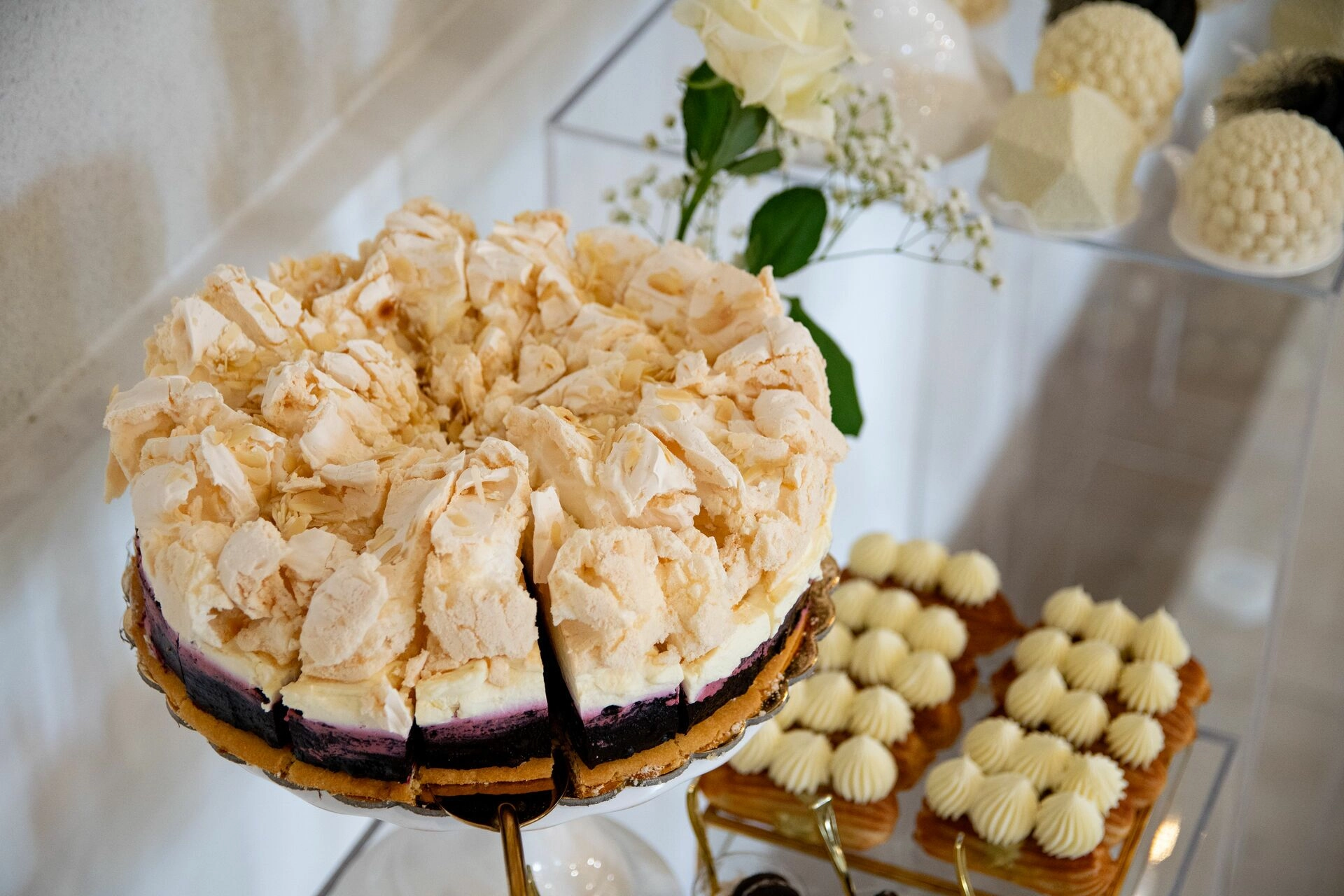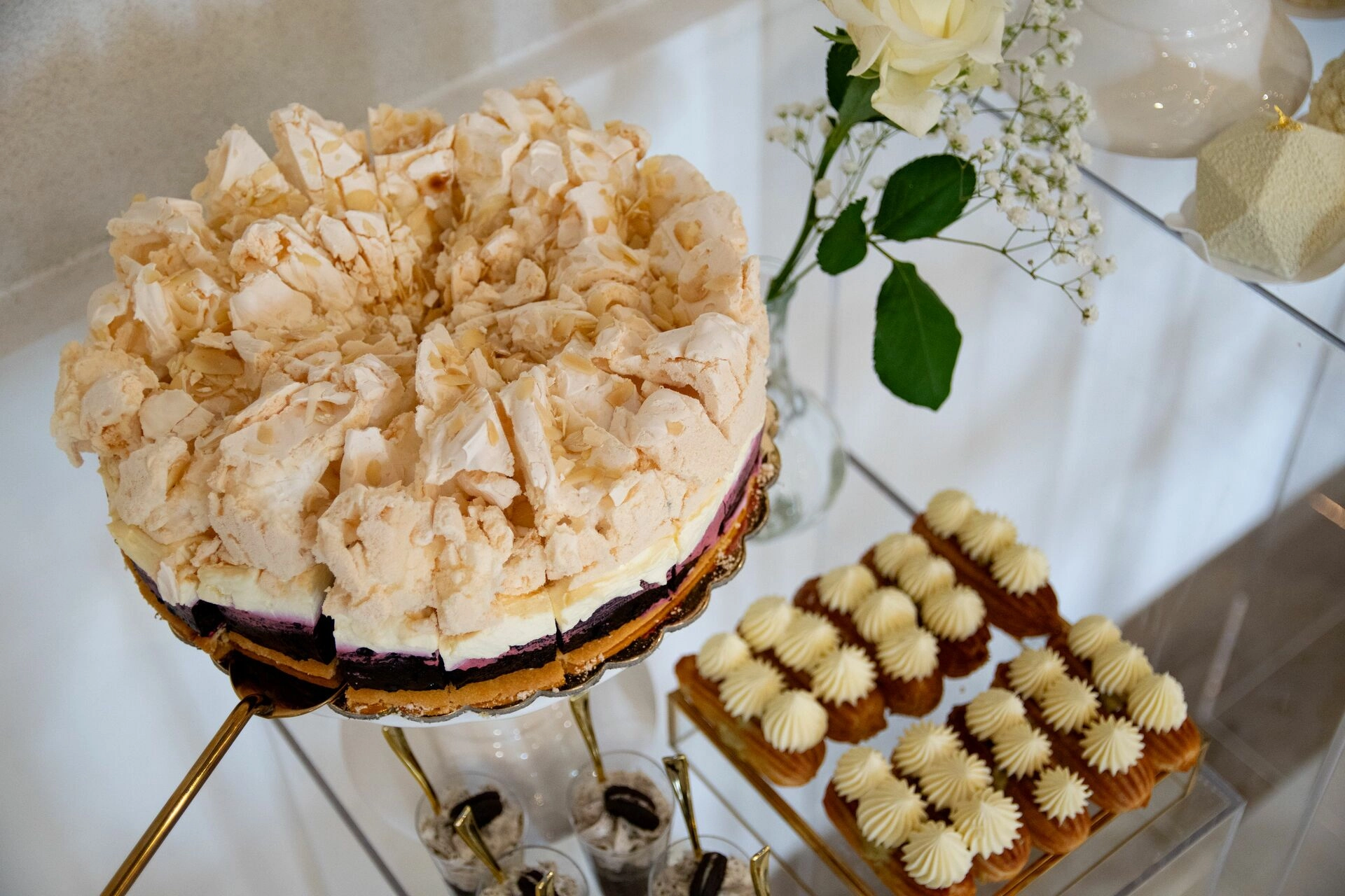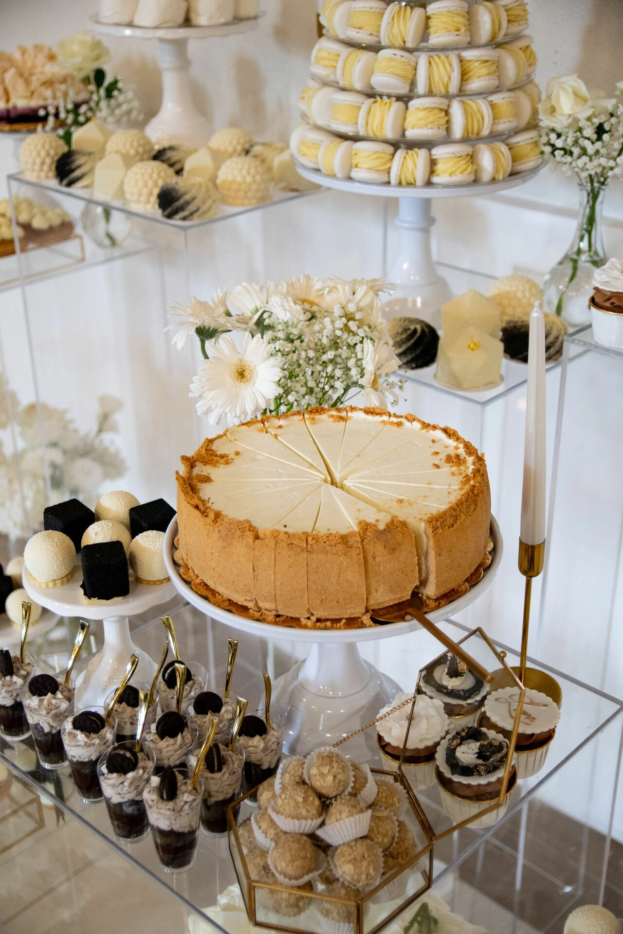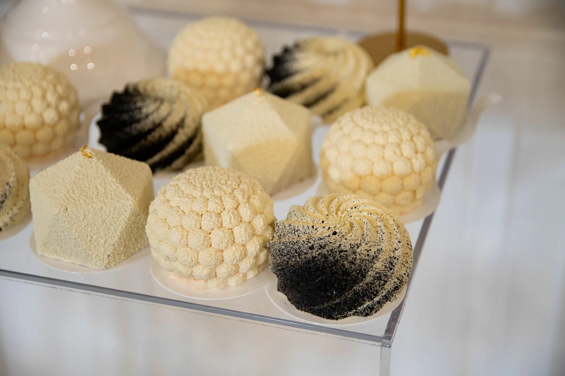 Ten słodki stół weselny to połączenie nowoczesnego minimalizmu z eleganckim stylem glamour. Wszystkie wypieki zostały zaaranżowane na transparentnych postumentach z plexi, które nadają całości niezwykłej lekkości i efektu „unoszenia się” słodkości w powietrzu. To idealna oprawa dla luksusowego przyjęcia weselnego – stół nie tylko przyciąga wzrok, ale także wspaniale prezentuje się na zdjęciach i podkreśla estetykę sali.