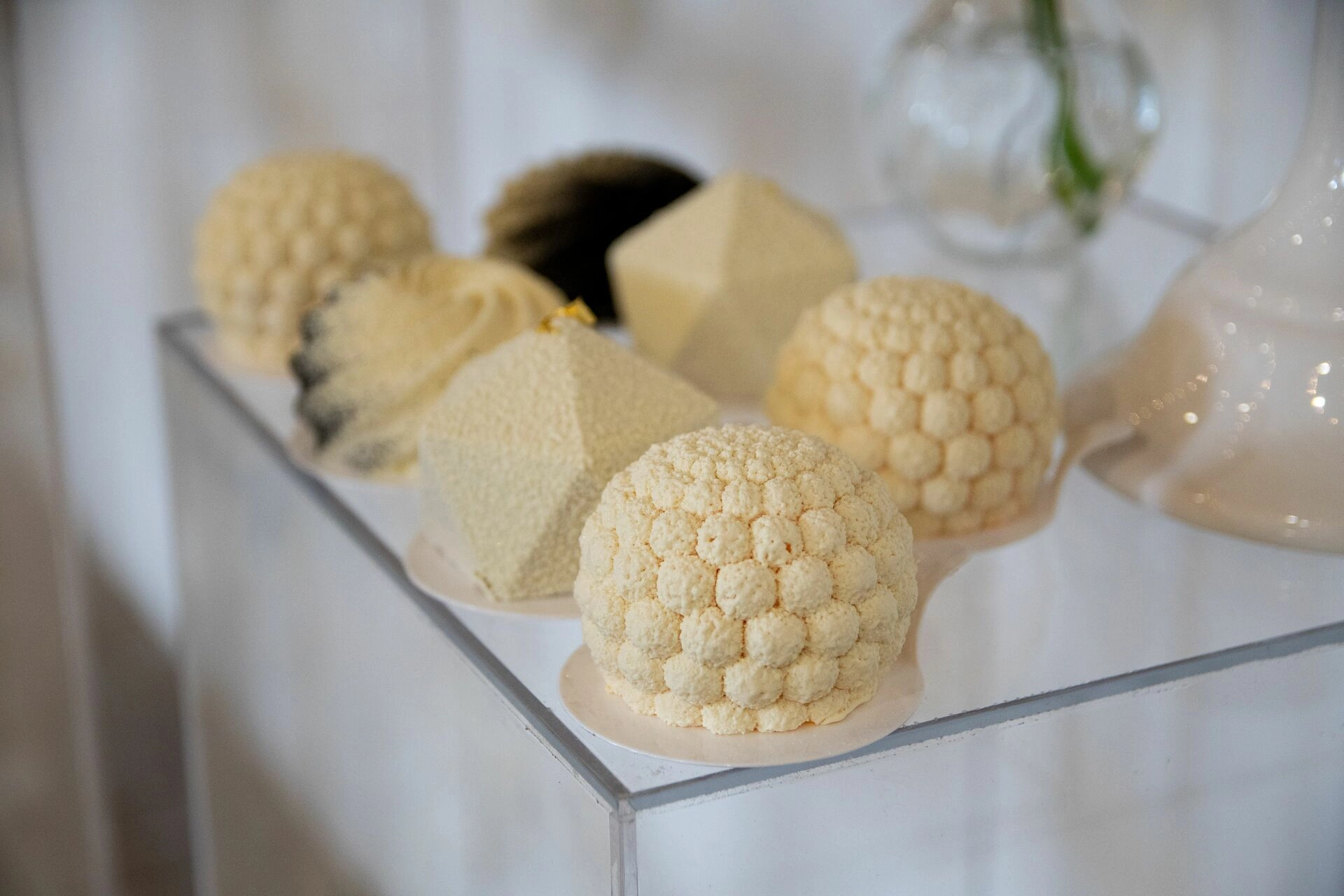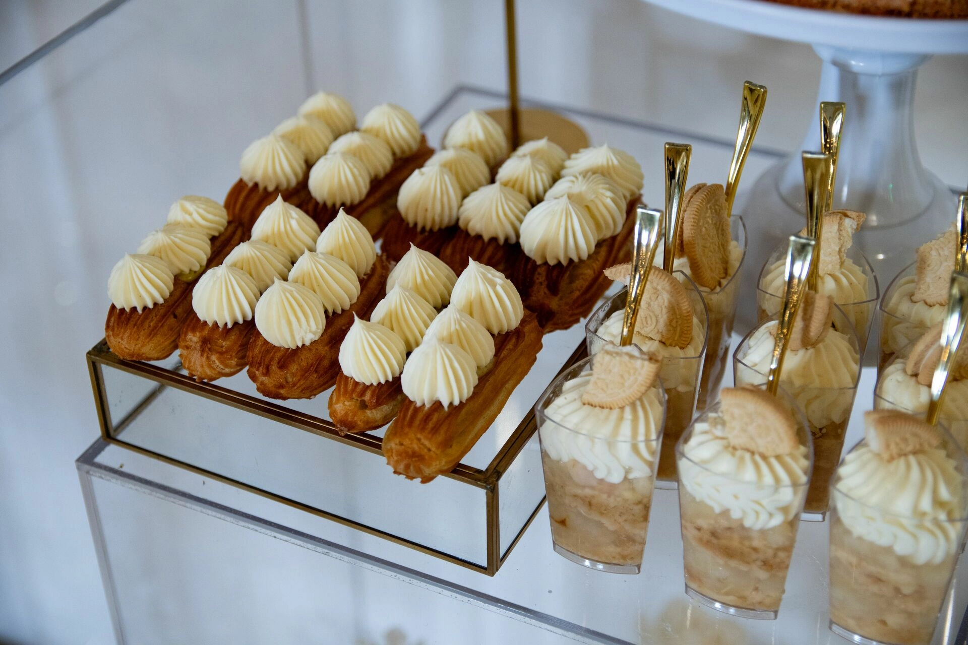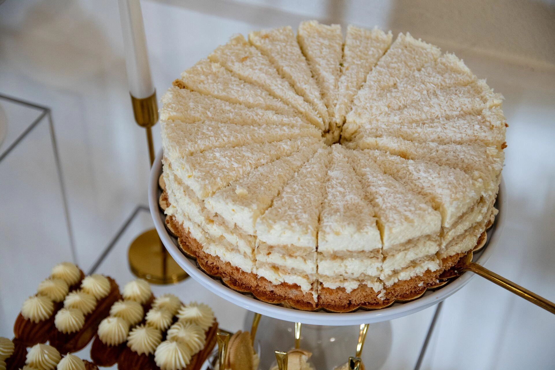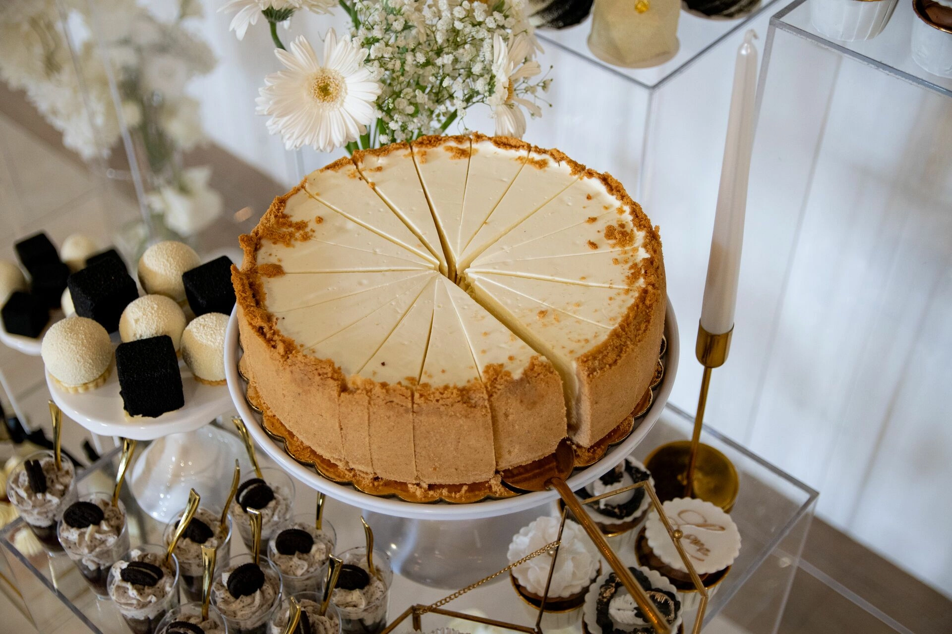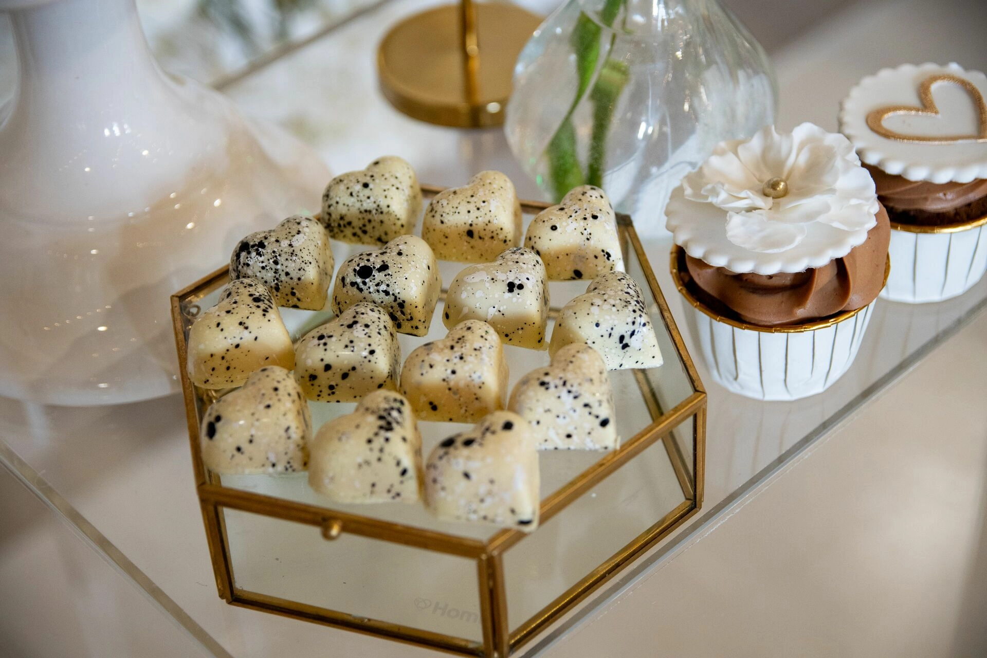 Ten słodki stół weselny to połączenie nowoczesnego minimalizmu z eleganckim stylem glamour. Wszystkie wypieki zostały zaaranżowane na transparentnych postumentach z plexi, które nadają całości niezwykłej lekkości i efektu „unoszenia się” słodkości w powietrzu. To idealna oprawa dla luksusowego przyjęcia weselnego – stół nie tylko przyciąga wzrok, ale także wspaniale prezentuje się na zdjęciach i podkreśla estetykę sali.