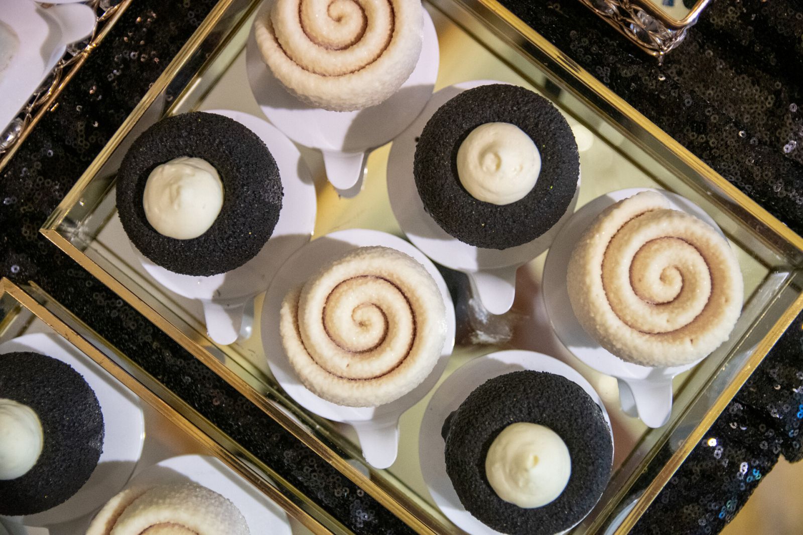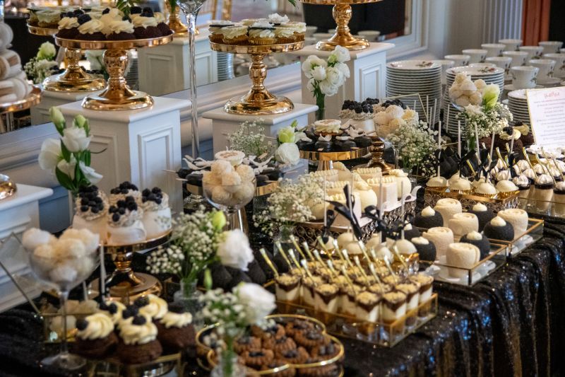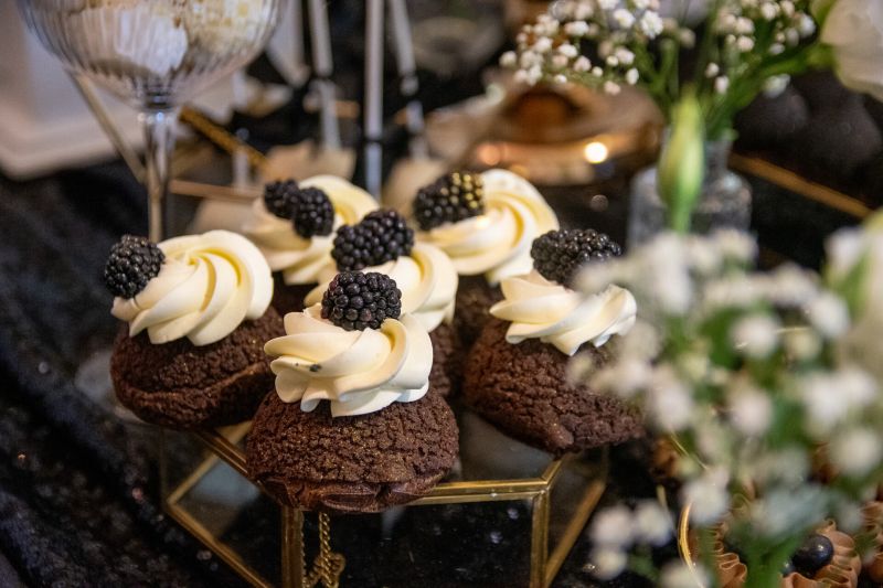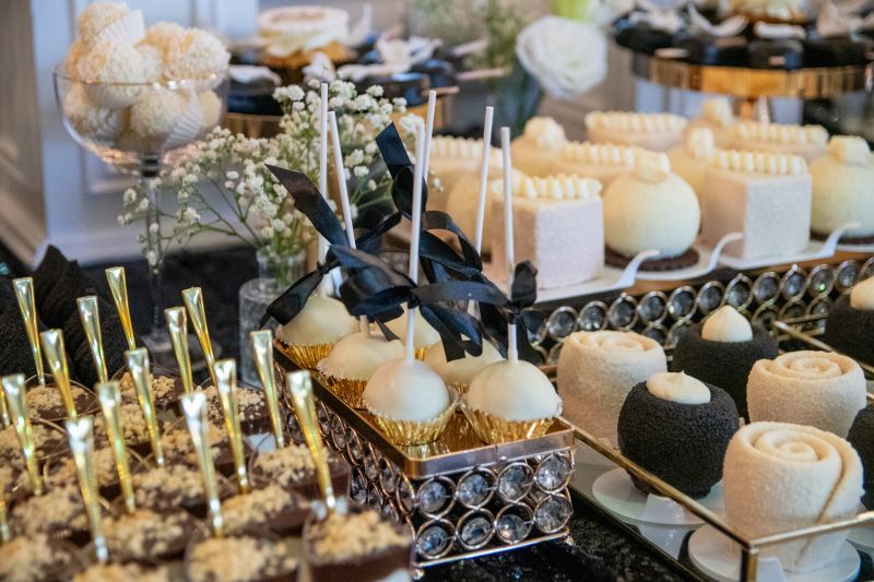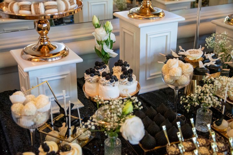 Desery rozmieszczone na złotych paterach i geometrycznych podstawkach prezentują się niczym małe dzieła sztuki. Na stole znalazły się m.in. delikatne mini bezy, eleganckie cake pops z czarno-białymi kokardami, monoporcje o aksamitnej strukturze, trufle oraz klasyczne babeczki z kremem i świeżymi owocami.