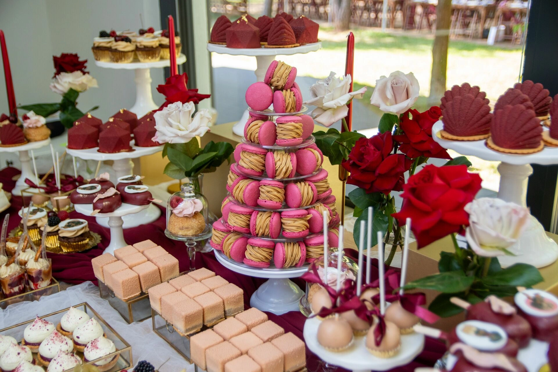 Dekoracja dopełniona została żywymi różami – w czerwieniach, bordo i pudrowym różu – oraz delikatnym tłem z marszczonych tkanin, złotych akcentów i świec. Wszystko to sprawiło, że candy bar stał się nie tylko punktem kulminacyjnym pod względem smaków, ale też zachwycającym tłem do zdjęć i wspomnień.