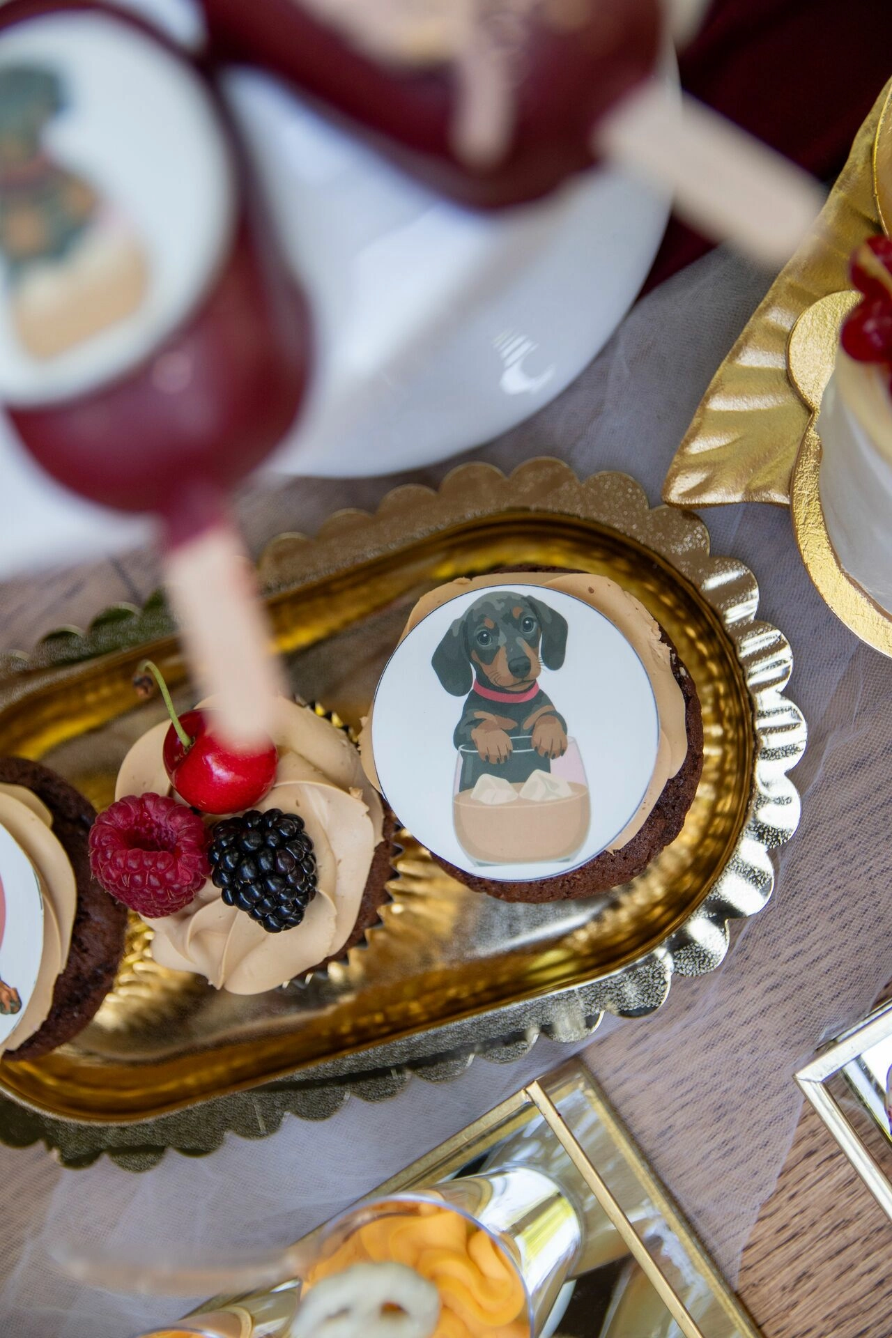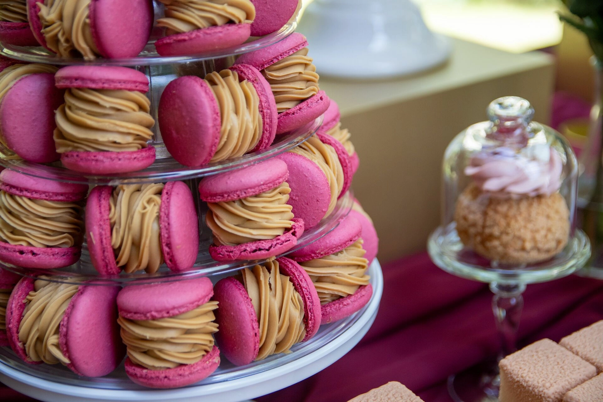 Sercem stołu była wieża z makaroników – różowych, z nutą owoców leśnych – która od razu przyciągała wzrok. Towarzyszyły jej ręcznie dekorowane monoporcje o zaskakujących strukturach i połączeniach smakowych: od pistacjowego musu z porzeczką i chrupką z czerwonych owoców, przez wariację na temat Kinder Bueno z morelą i czekoladowym financierem, aż po mini musowe desery z jogurtem, jagodą i sable.