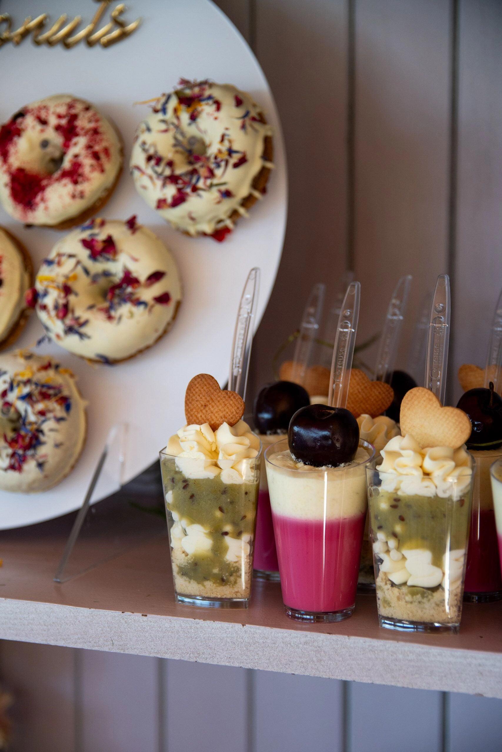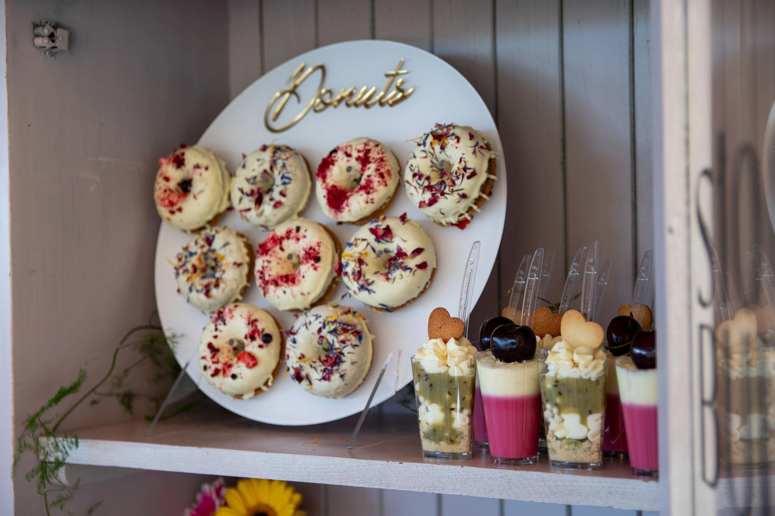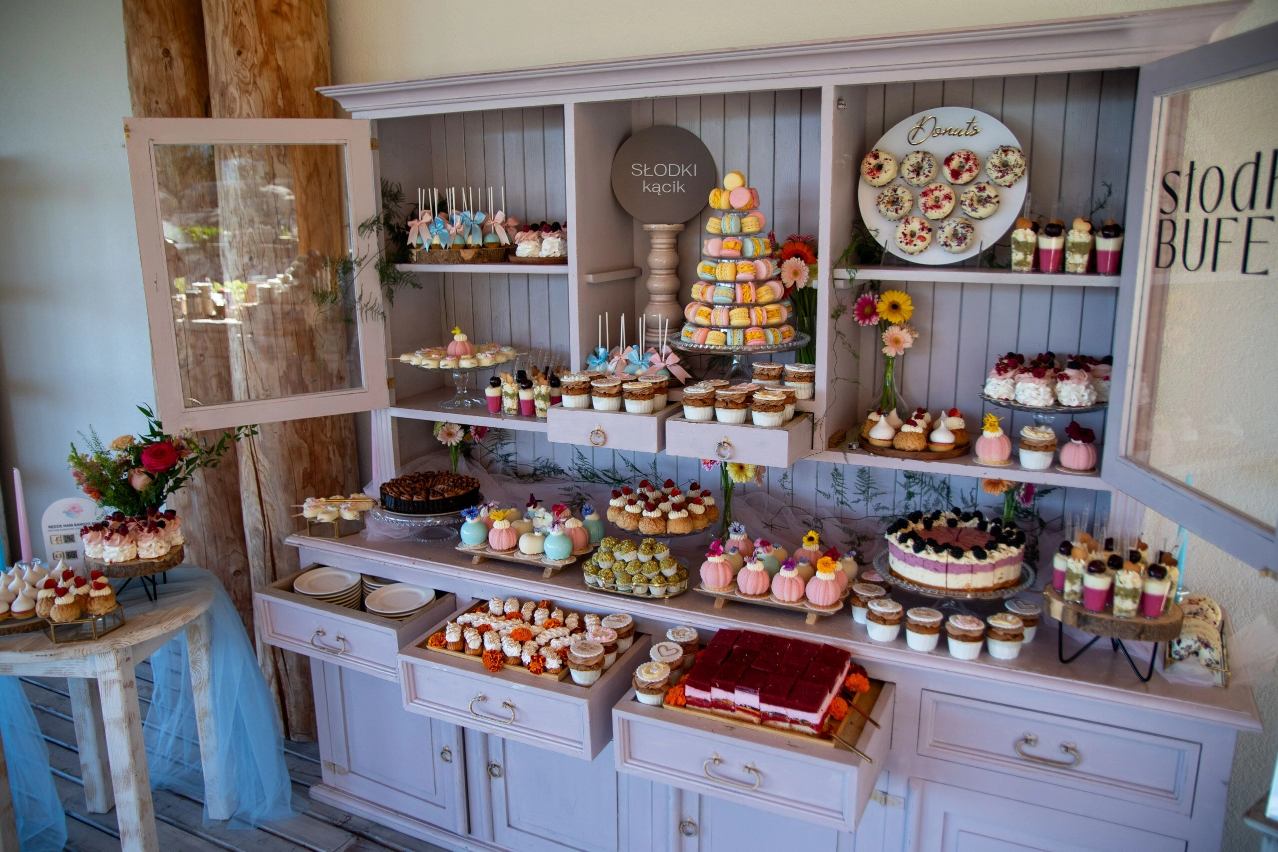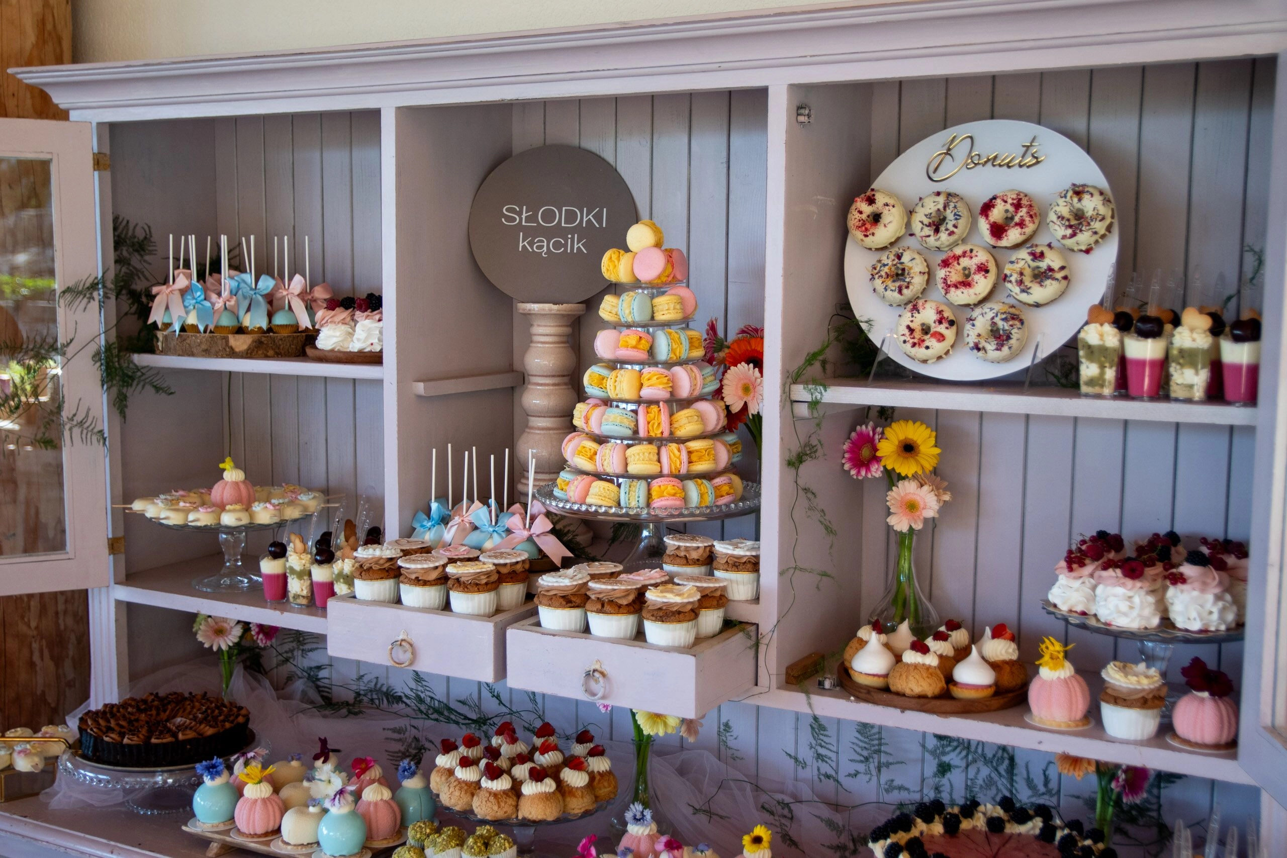 - Donuty: Z finezyjnymi polewami i posypkami, umieszczone na dekoracyjnych paterach.