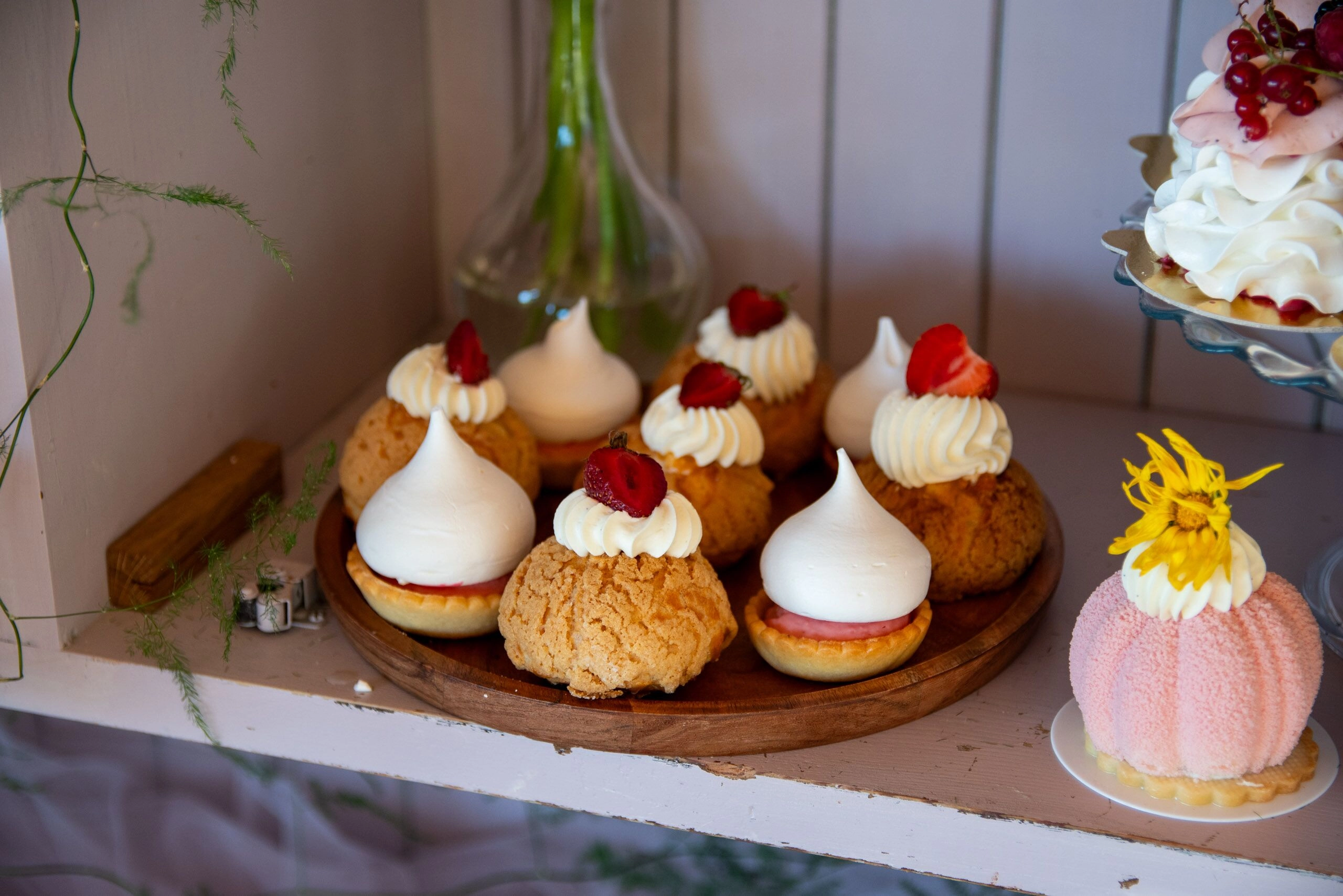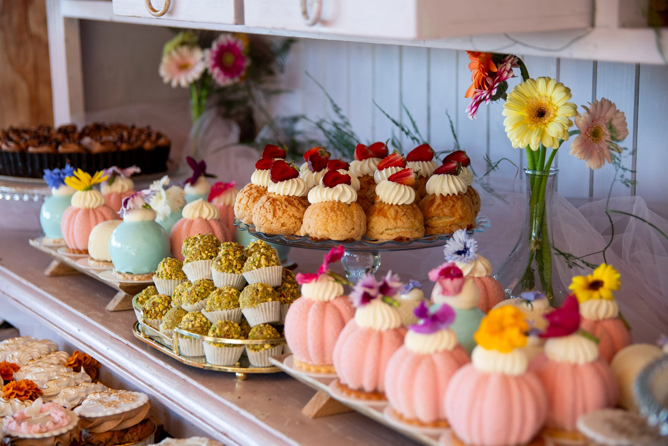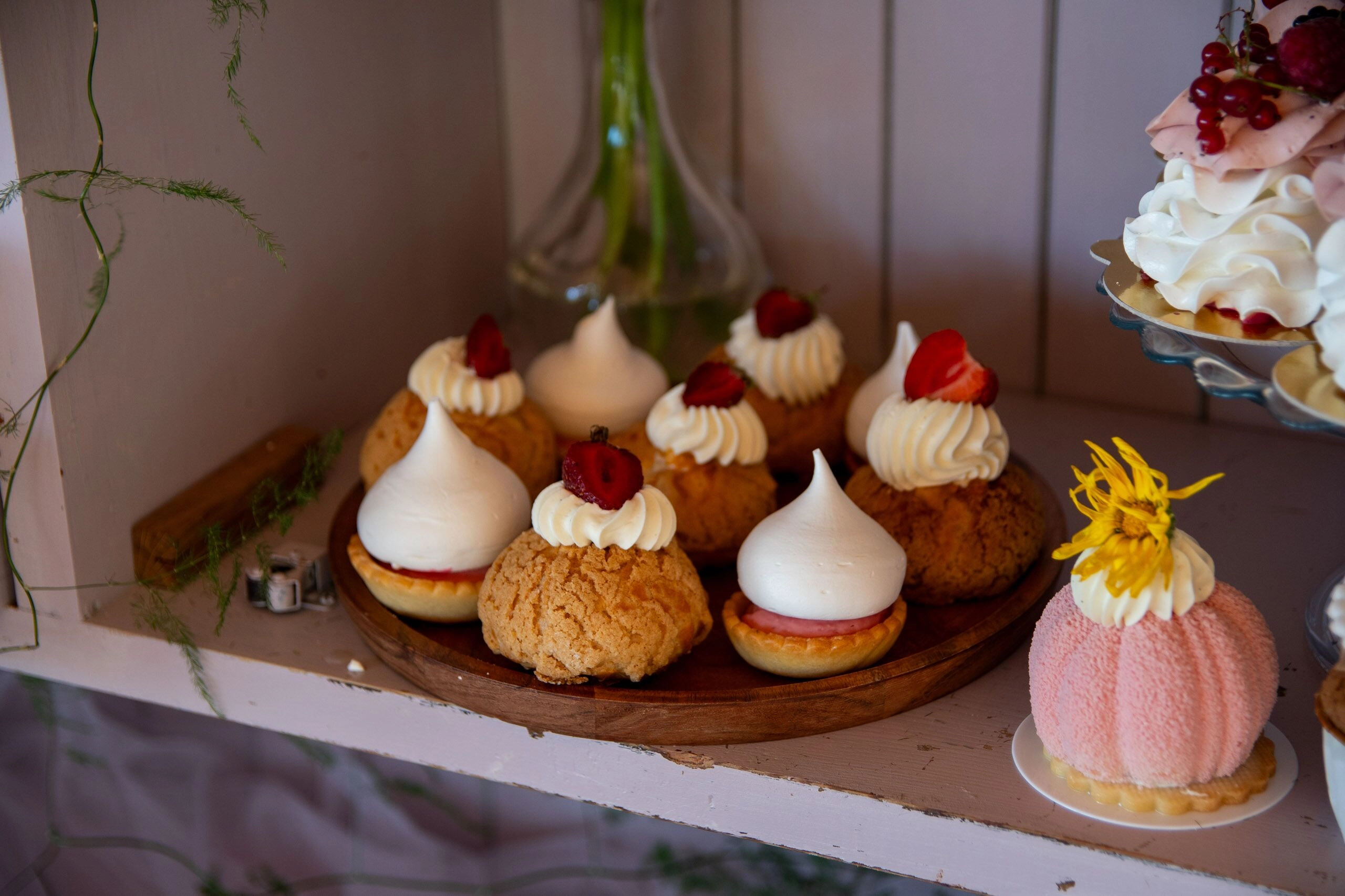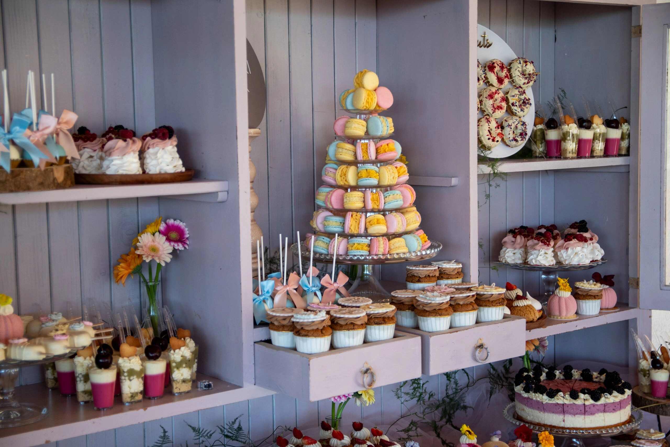 - Donuty: Z finezyjnymi polewami i posypkami, umieszczone na dekoracyjnych paterach.