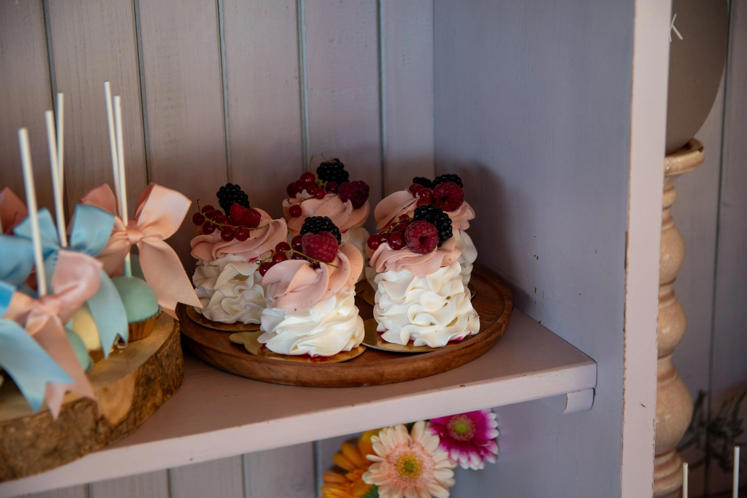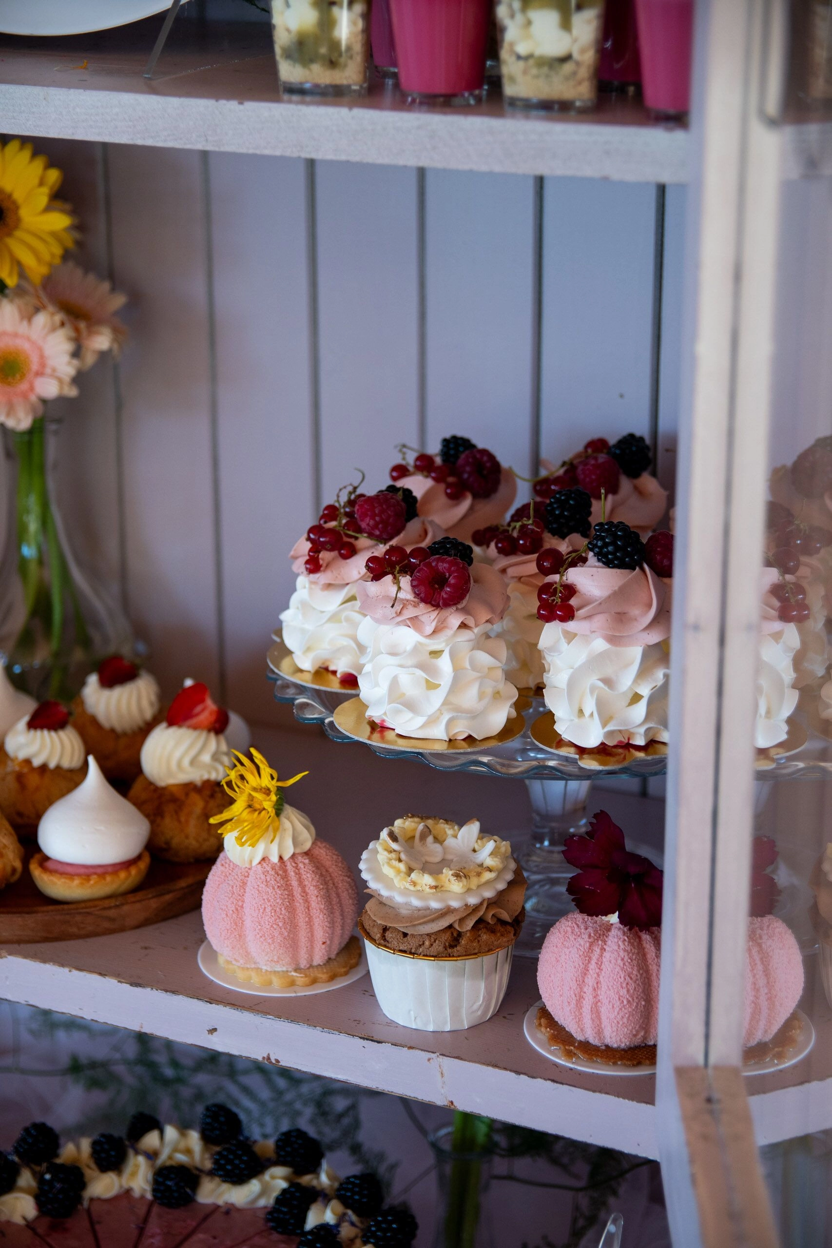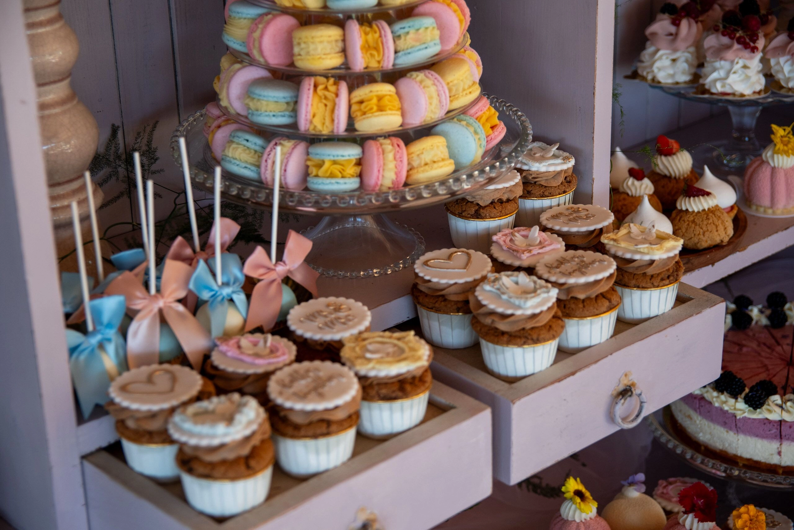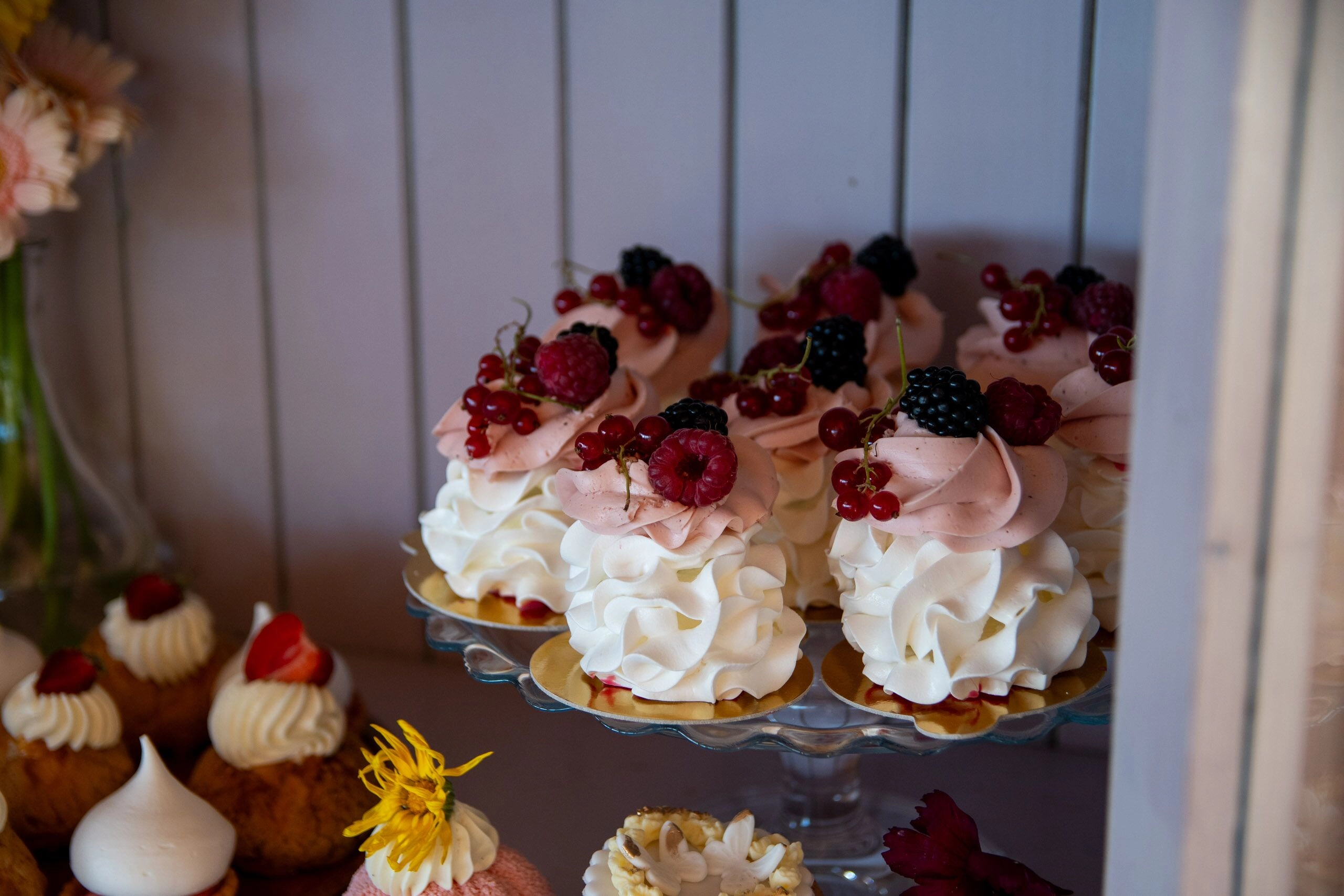 - Babeczki: Z różną dekoracją i w różnych kolorach, zdobione kremami i owocami.