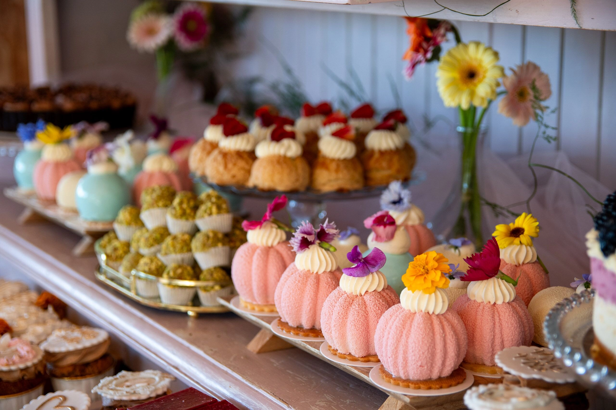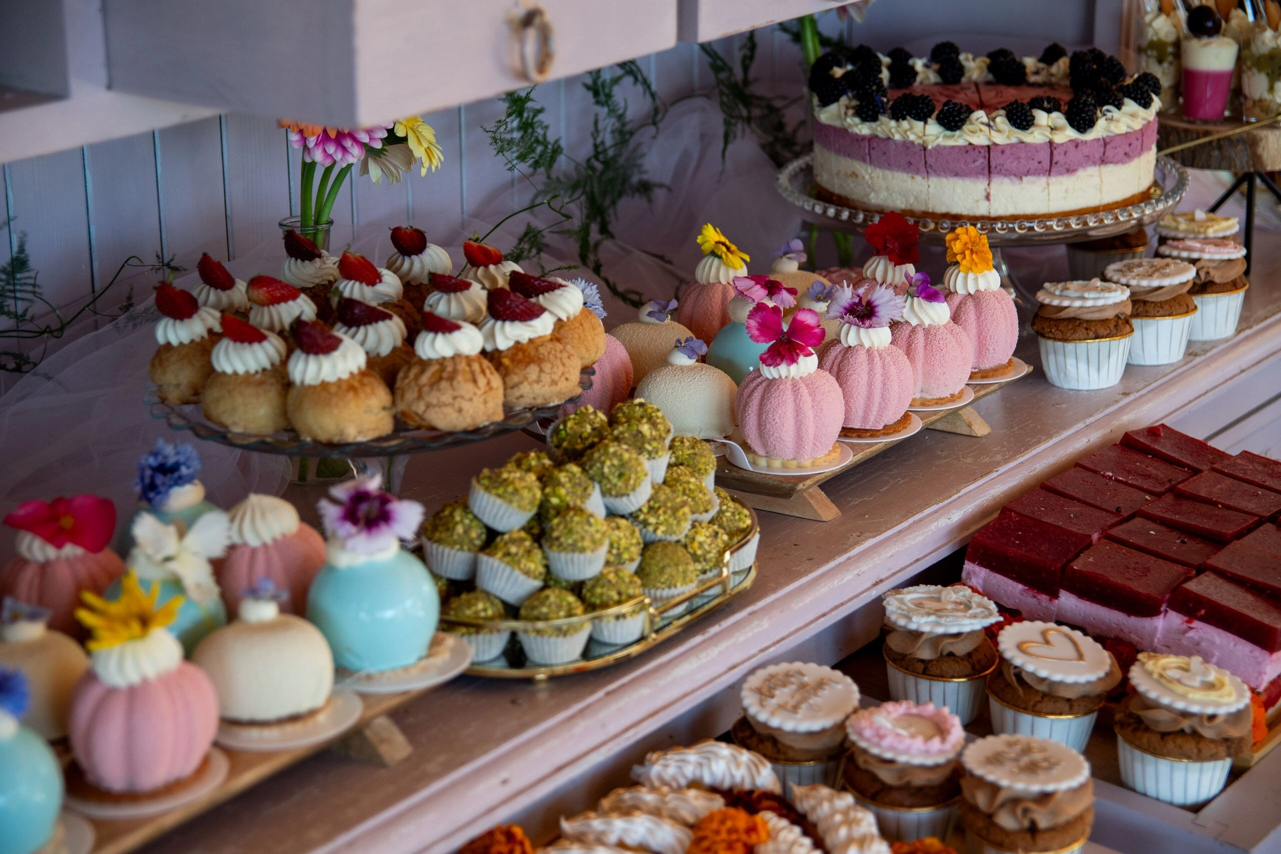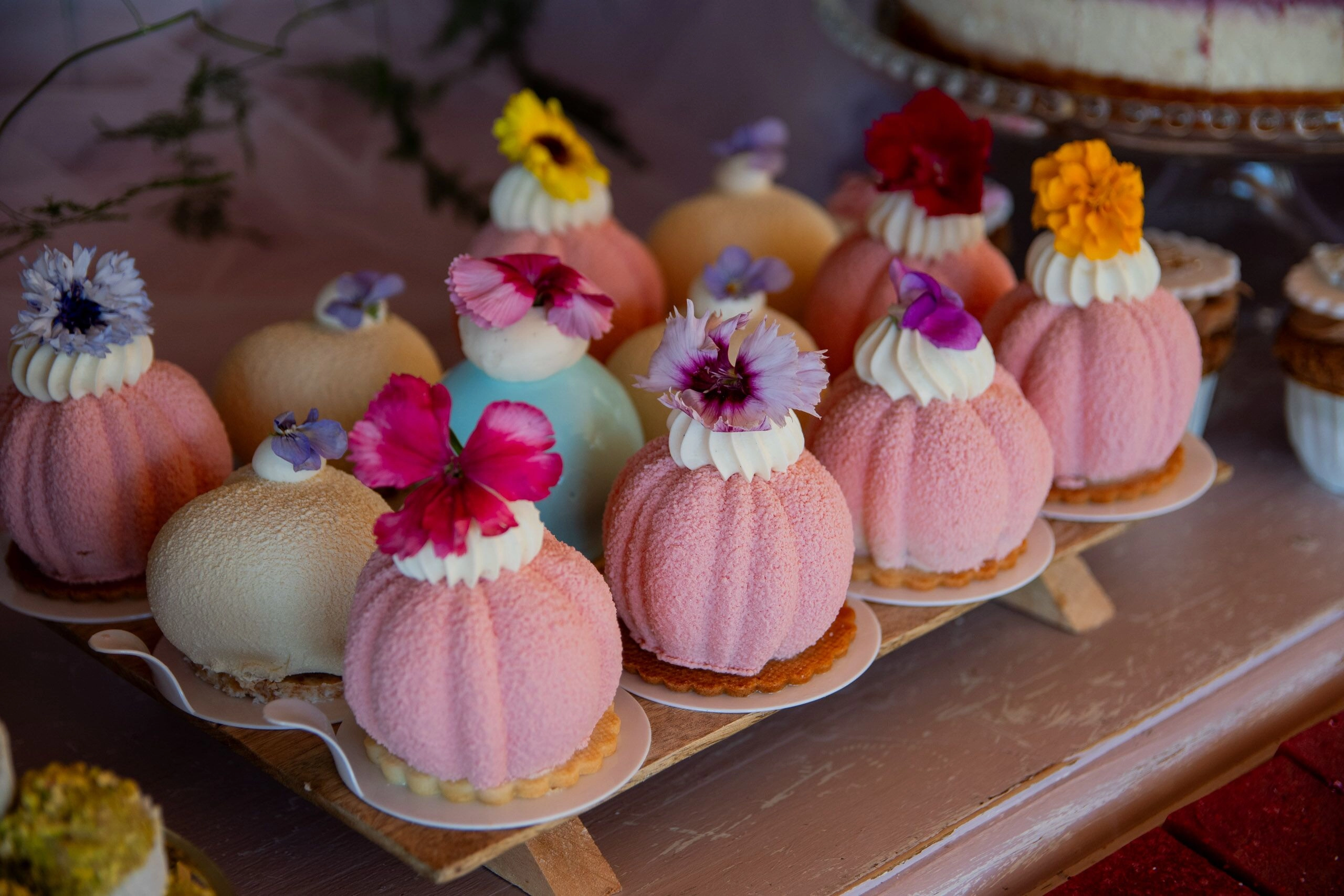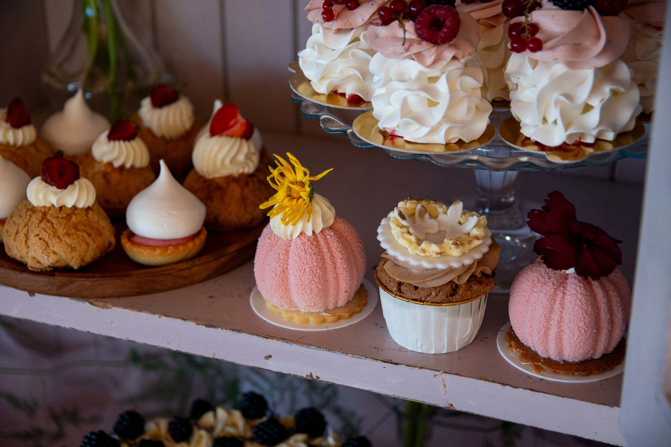 - Babeczki: Z różną dekoracją i w różnych kolorach, zdobione kremami i owocami.