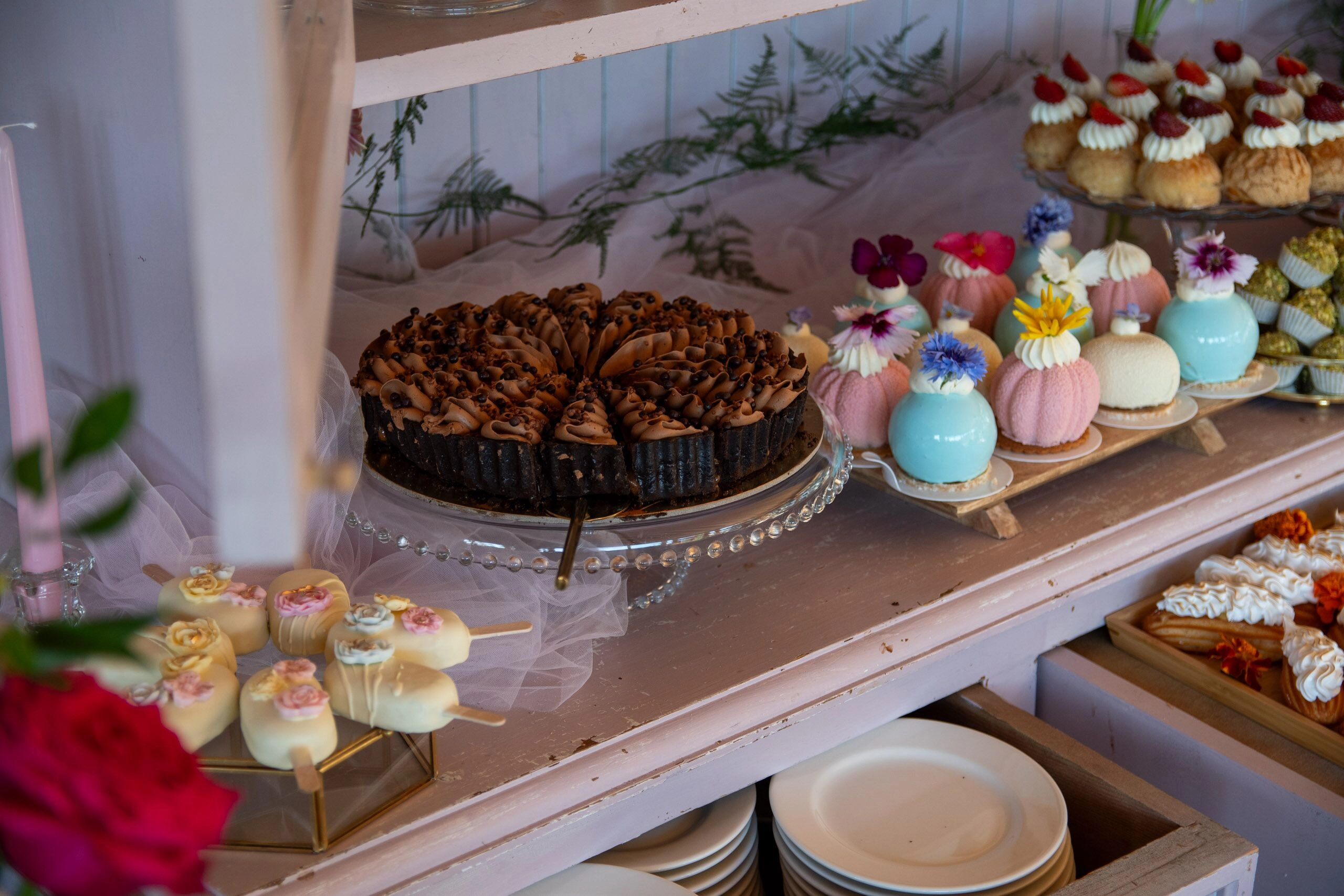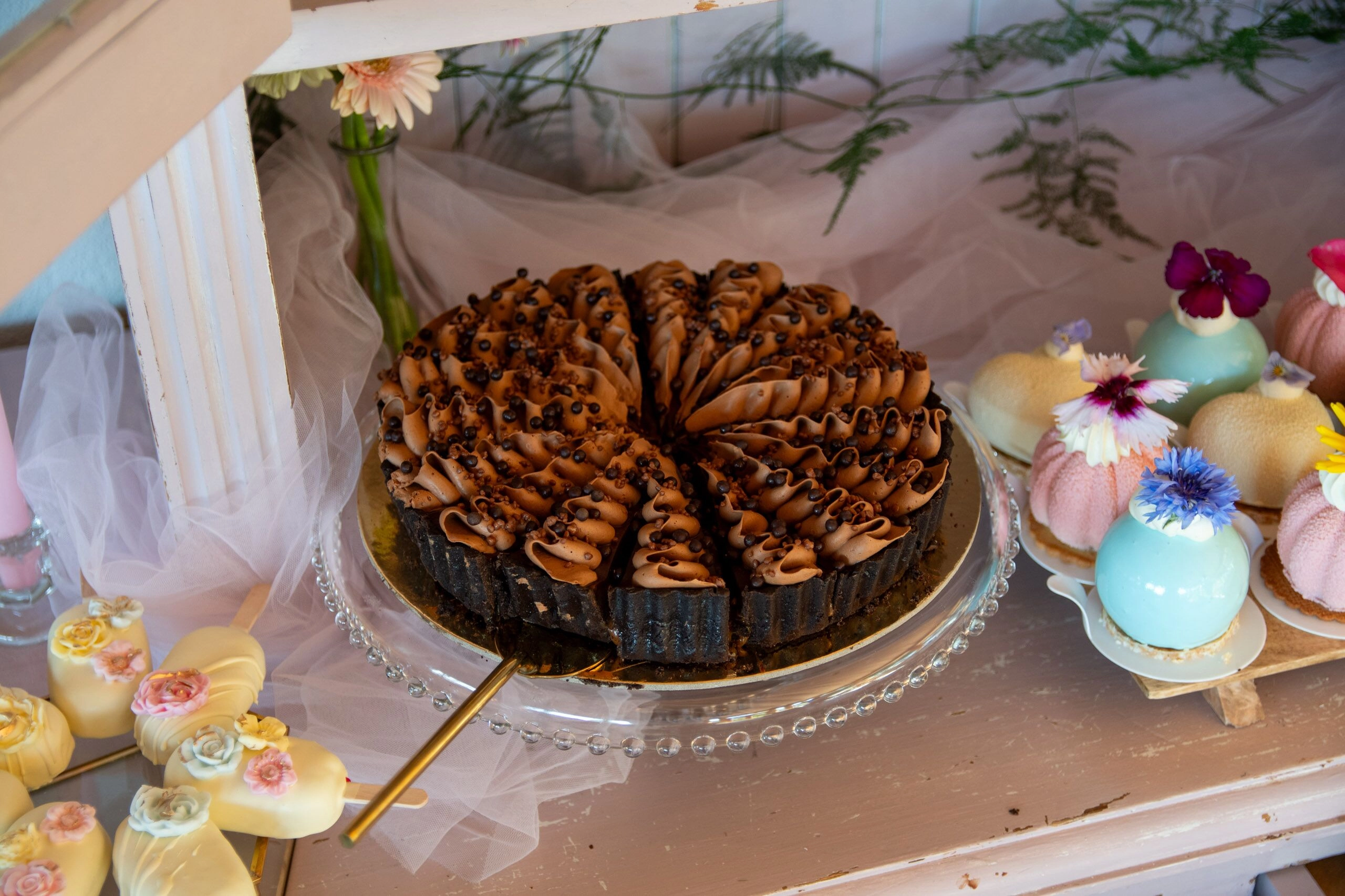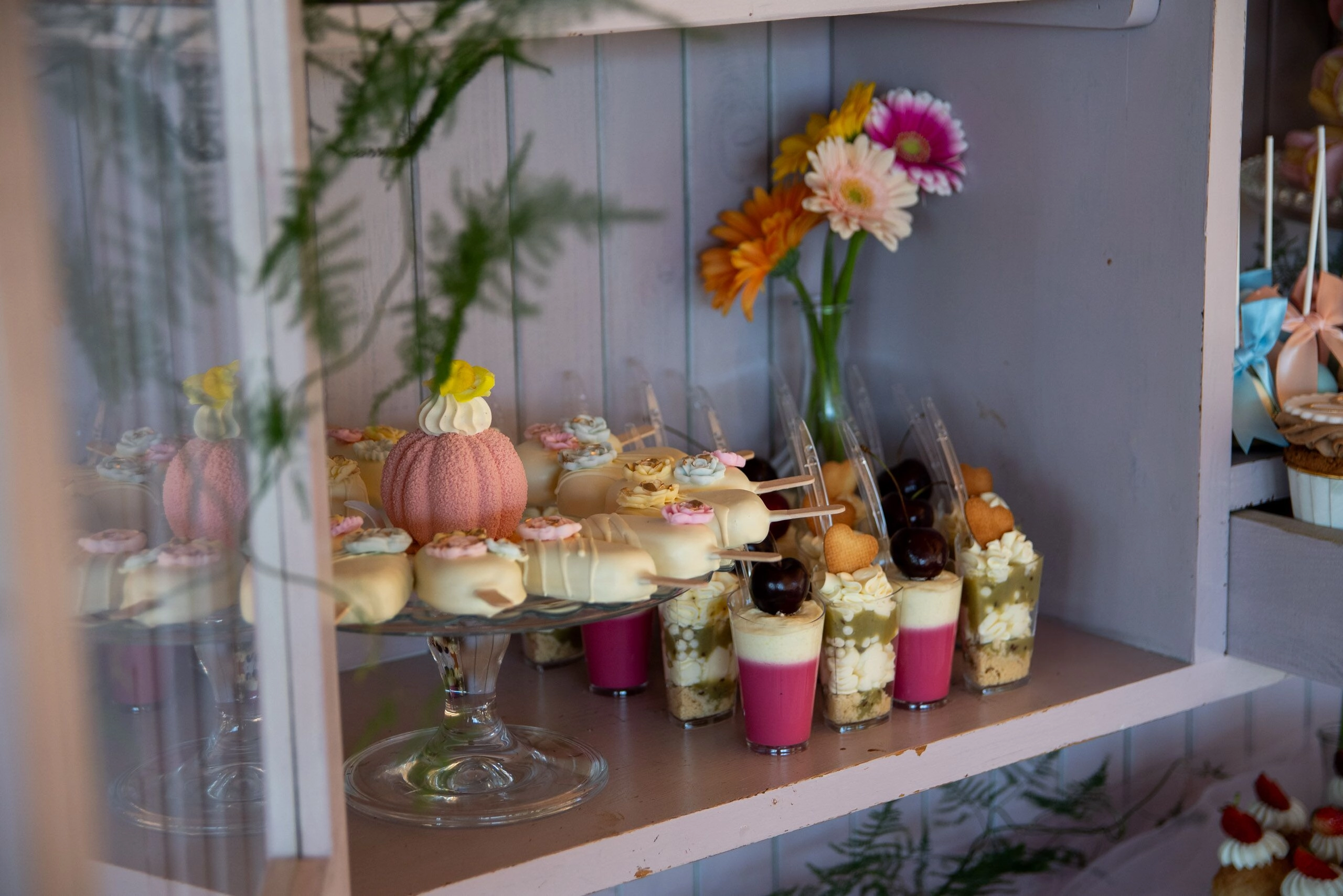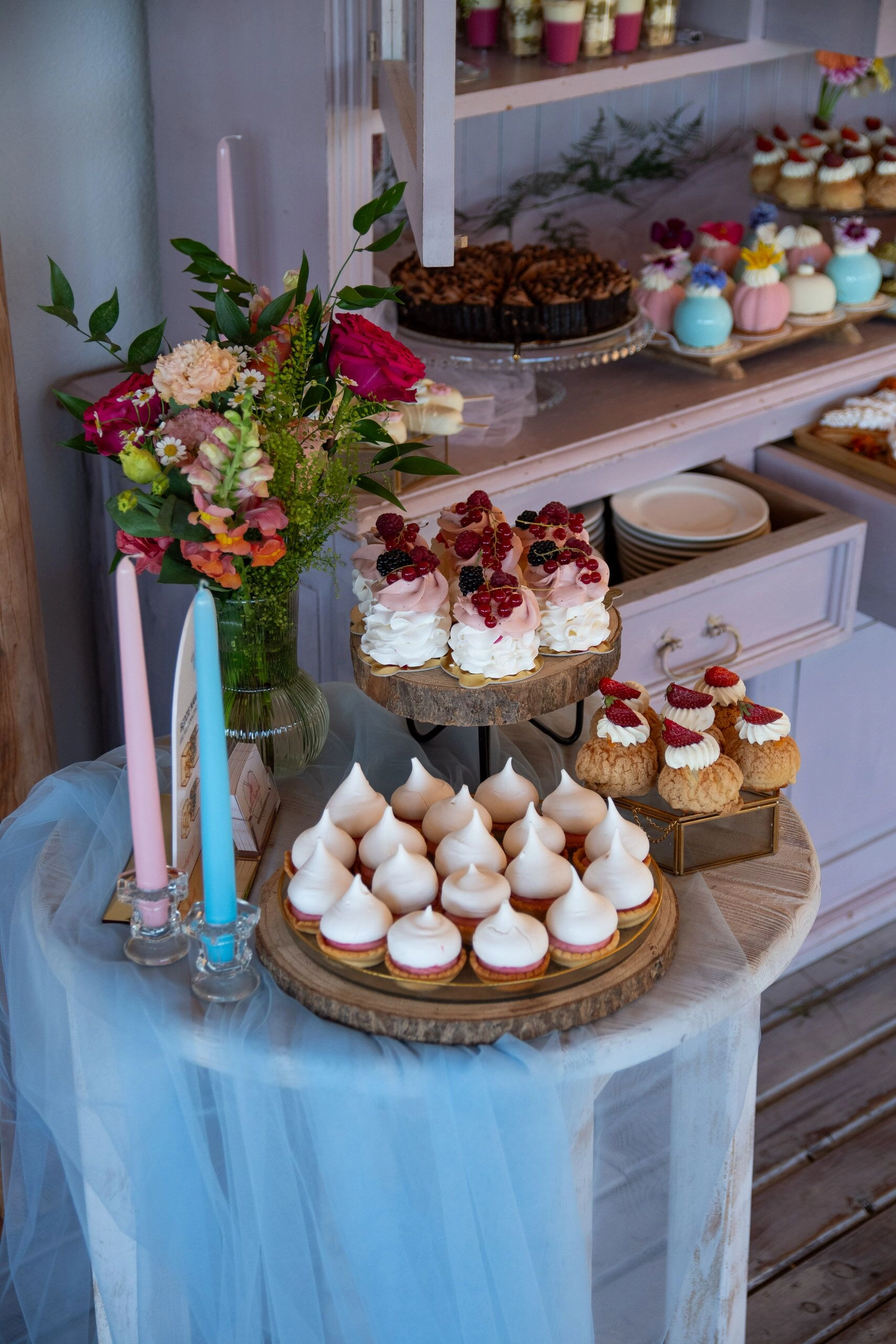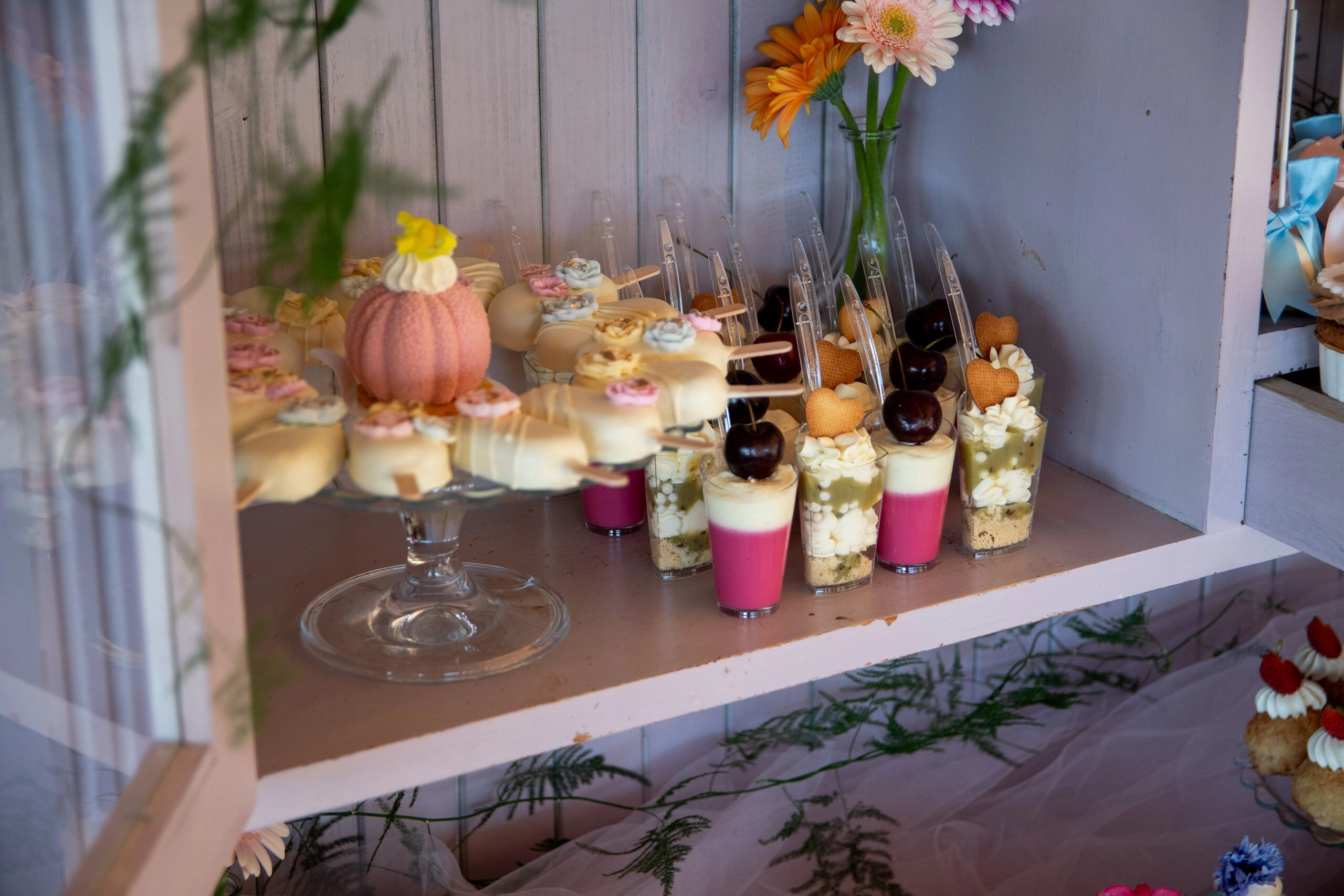 Cała aranżacja słodkiego stołu obejmuje wszelkie naczynia, a także świeże kwiaty, wstążki i inne elementy dekoracyjne, które tworzą spójną i zachwycającą całość.