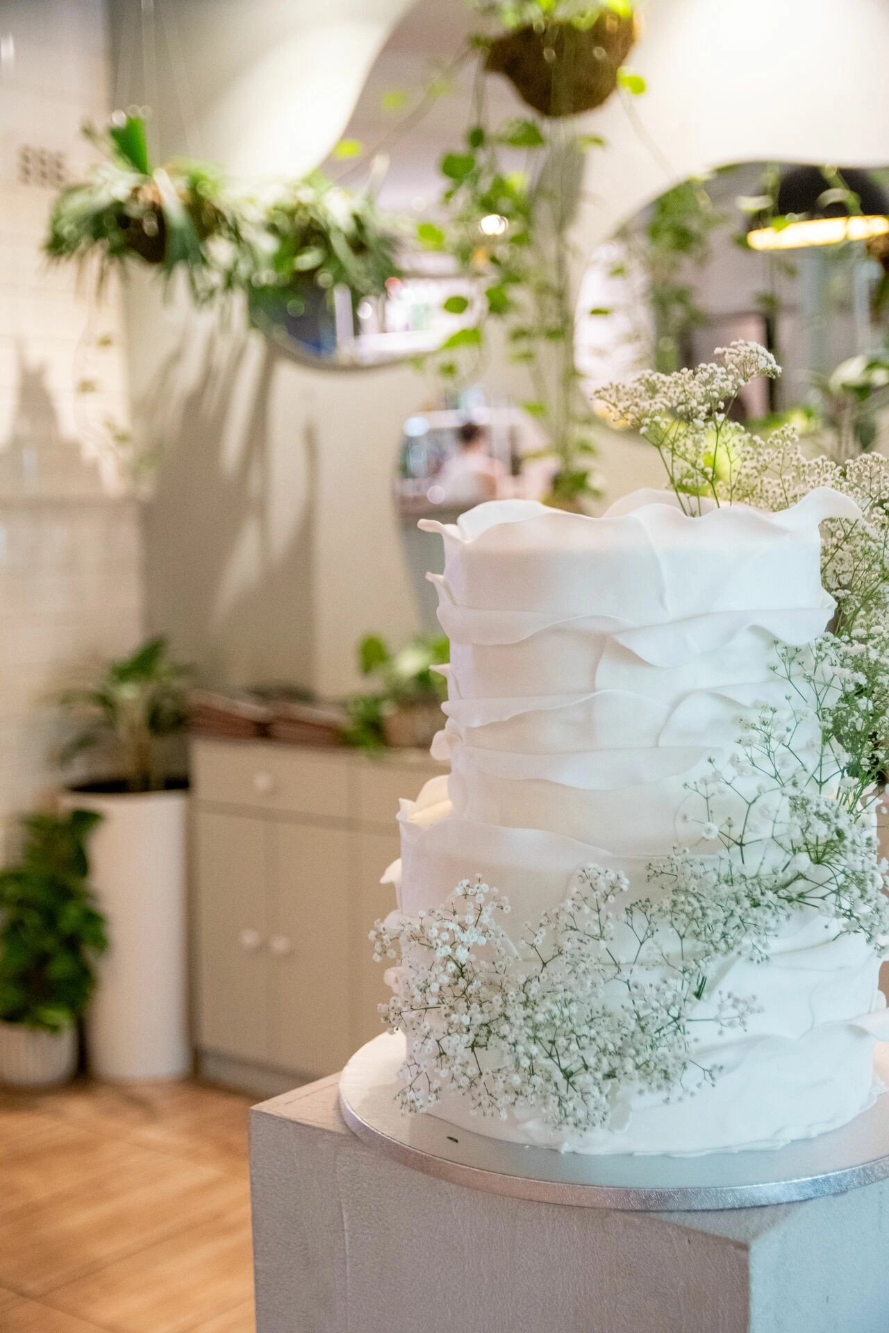 Dekorację dopełniają tylko żywe gałązki gipsówki – drobne, białe kwiatki, które wprowadzają lekkość, świeżość i naturalny urok. W połączeniu z czystą bielą masy cukrowej tworzą obraz tortu, który idealnie wpisuje się w nowoczesne, eleganckie wesela, przyjęcia w stylu boho czy rustykalnym, a nawet minimalistyczne eventy, gdzie liczy się harmonia formy i treści.