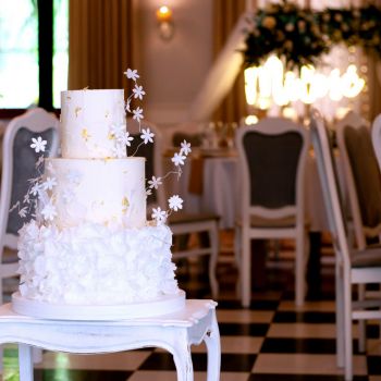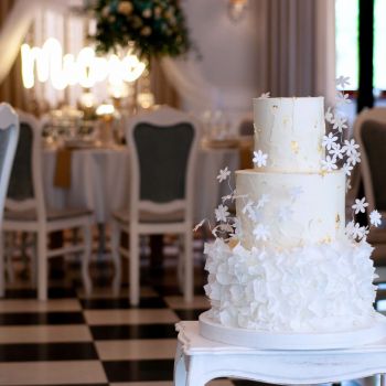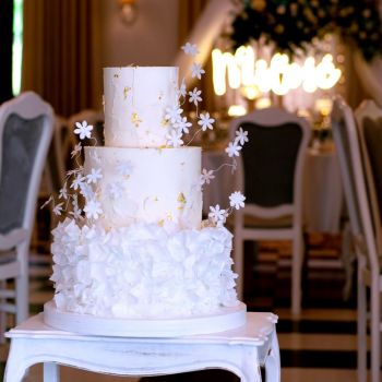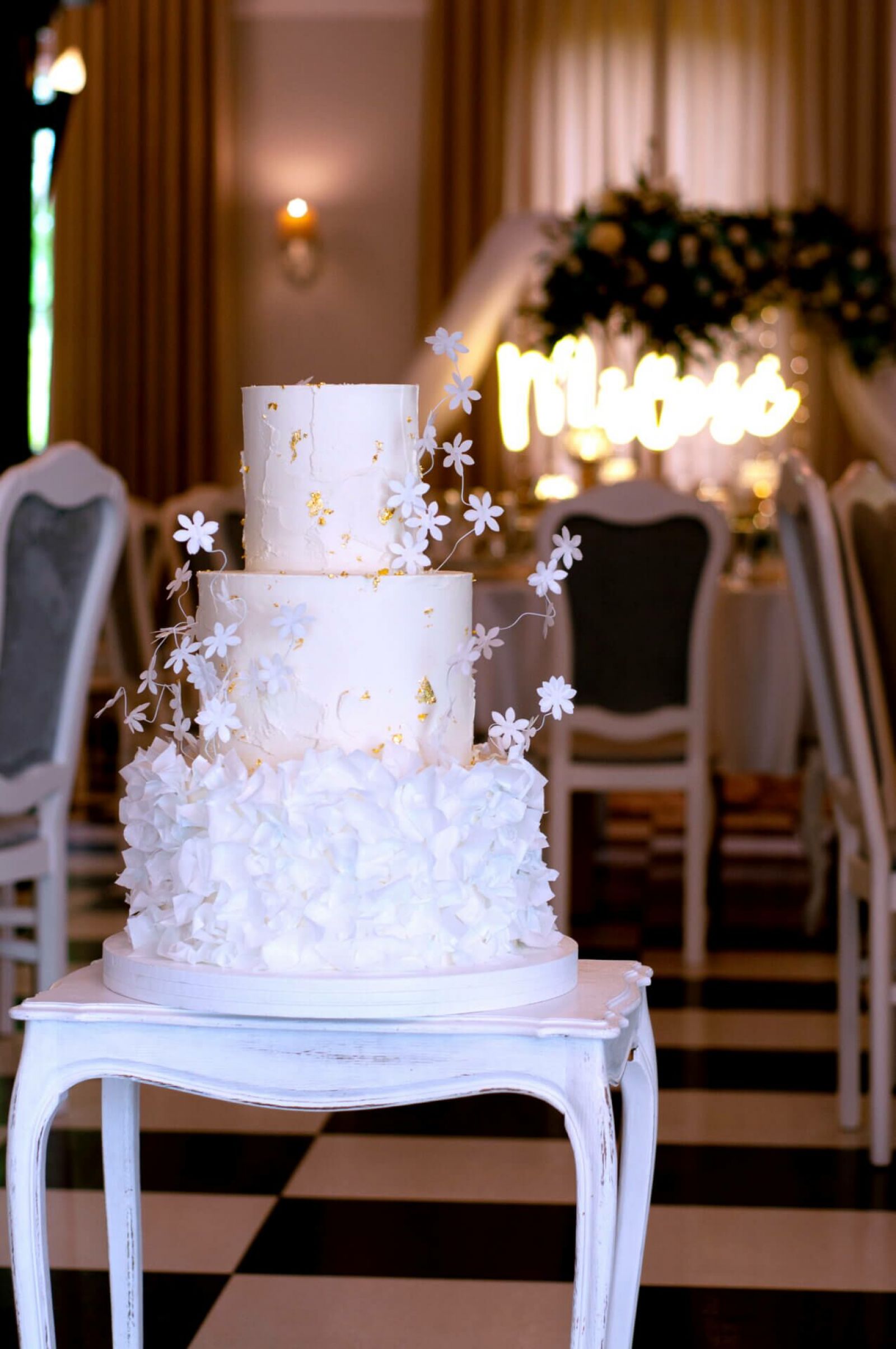 Tort weselny z delikatną falbanką na dolnym piętrze oraz z piękną dekoracją w formie kwiatuszków na drucikach. Nasze torty weselne stworzone są z najwyższej jakości składników, które gwarantują niezrównany smak i elegancki wygląd. Delikatna falbanka na dolnym piętrze tortu dodaje mu romantycznego i subtelnego charakteru, podkreślając jednocześnie jego wyrafinowaną formę.