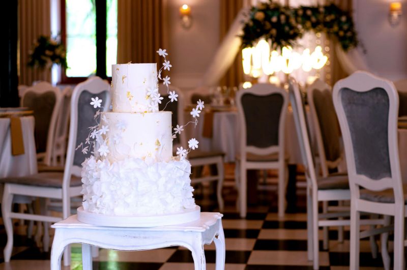 Dodatkową dekoracją są misternie wykonane kwiatuszki na drucikach, które nadają tortowi lekkości i finezji. Te kwiatowe akcenty są idealnym dopełnieniem każdej kompozycji, dodając jej świeżości i naturalnego piękna. Nasz tort weselny z falbanką i kwiatuszkami jest idealnym wyborem na eleganckie wesela, gdzie każdy szczegół ma znaczenie.