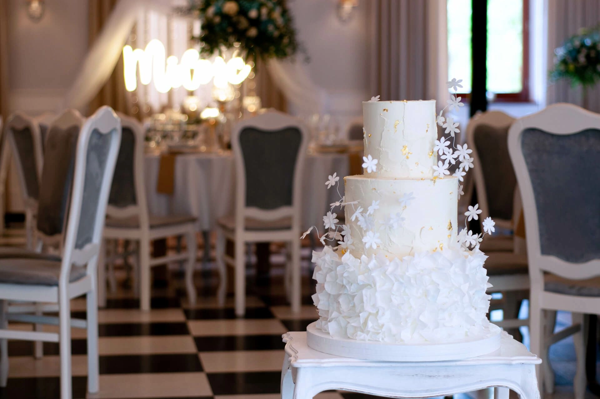 Tort weselny z delikatną falbanką na dolnym piętrze oraz z piękną dekoracją w formie kwiatuszków na drucikach. Nasze torty weselne stworzone są z najwyższej jakości składników, które gwarantują niezrównany smak i elegancki wygląd. Delikatna falbanka na dolnym piętrze tortu dodaje mu romantycznego i subtelnego charakteru, podkreślając jednocześnie jego wyrafinowaną formę.