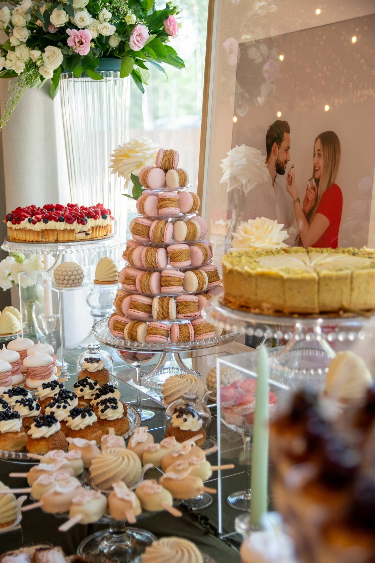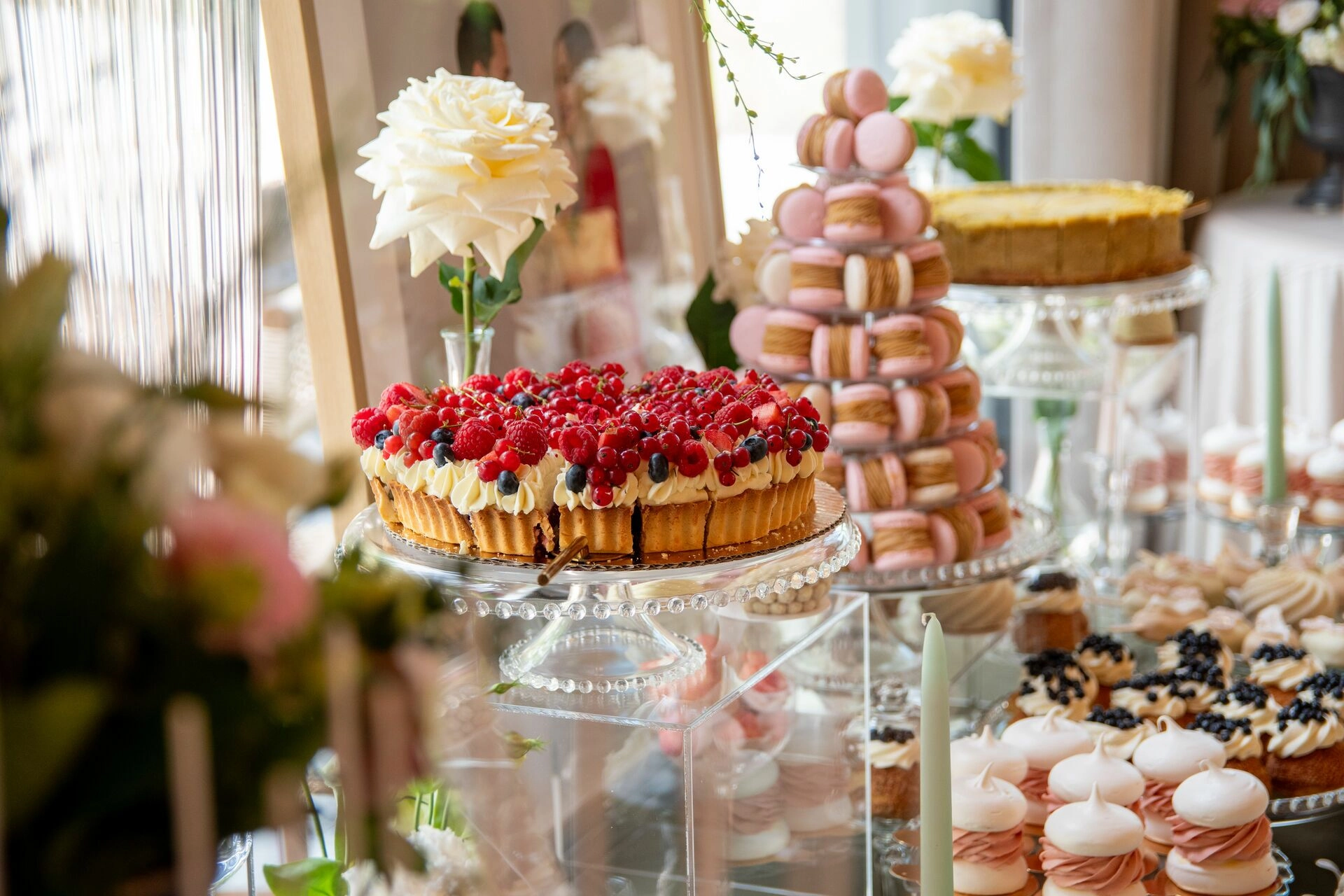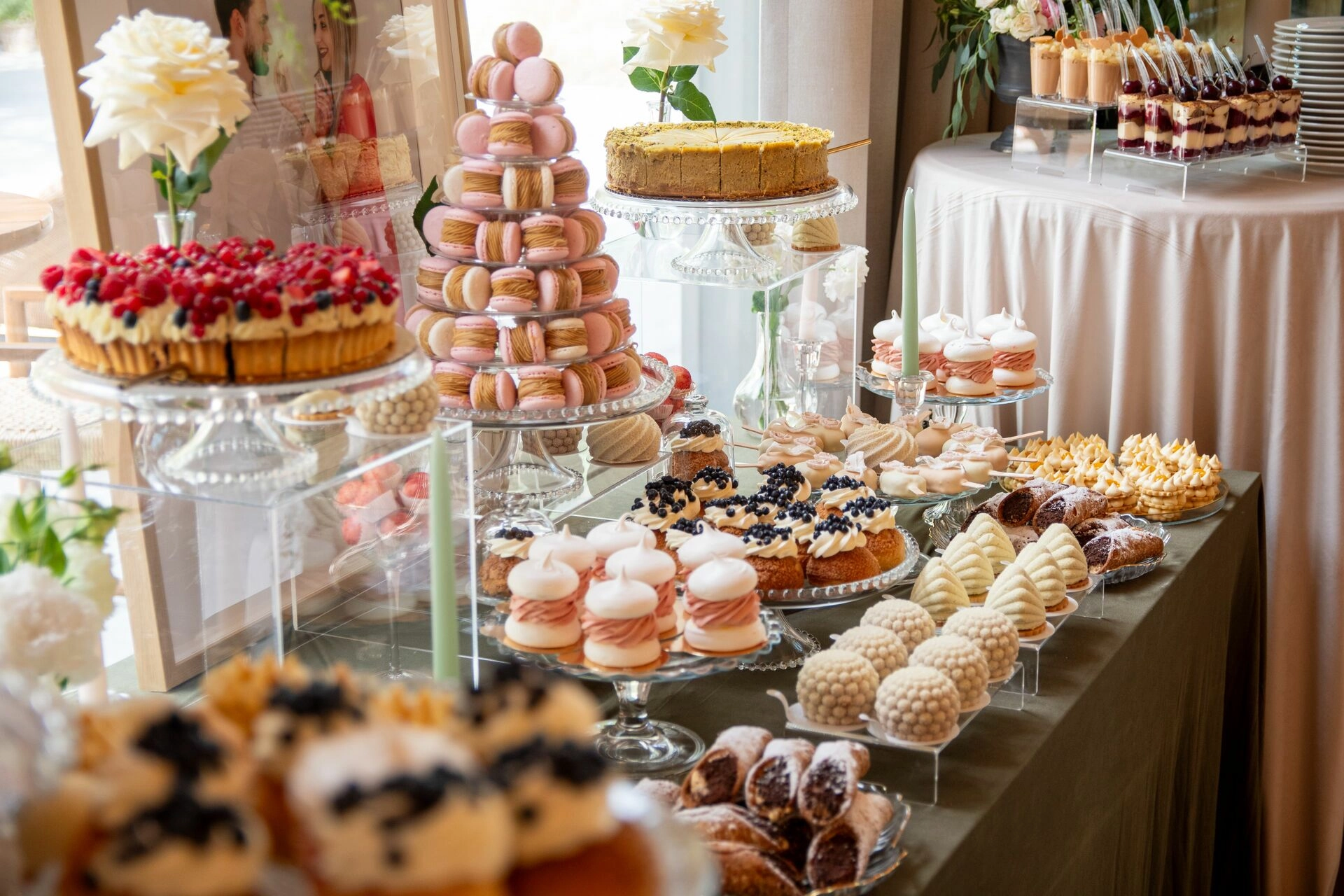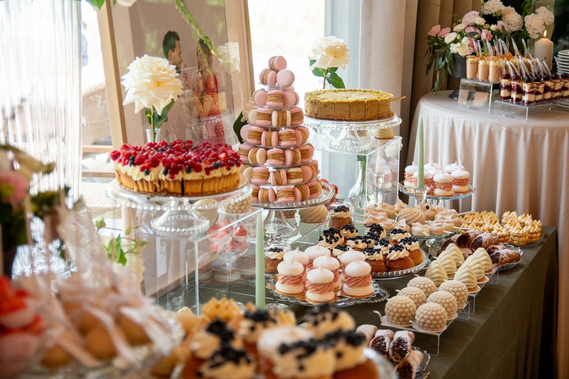 Słodki stół został zaaranżowany z dbałością o detale – kryształowe patery, świeże kwiaty, świece, tkaniny w delikatnych odcieniach i subtelna oprawa zdjęciowa Pary Młodej. To nie tylko candy bar – to scena z filmu. Kadry, które pachną miłością, smakiem i zachwytem.