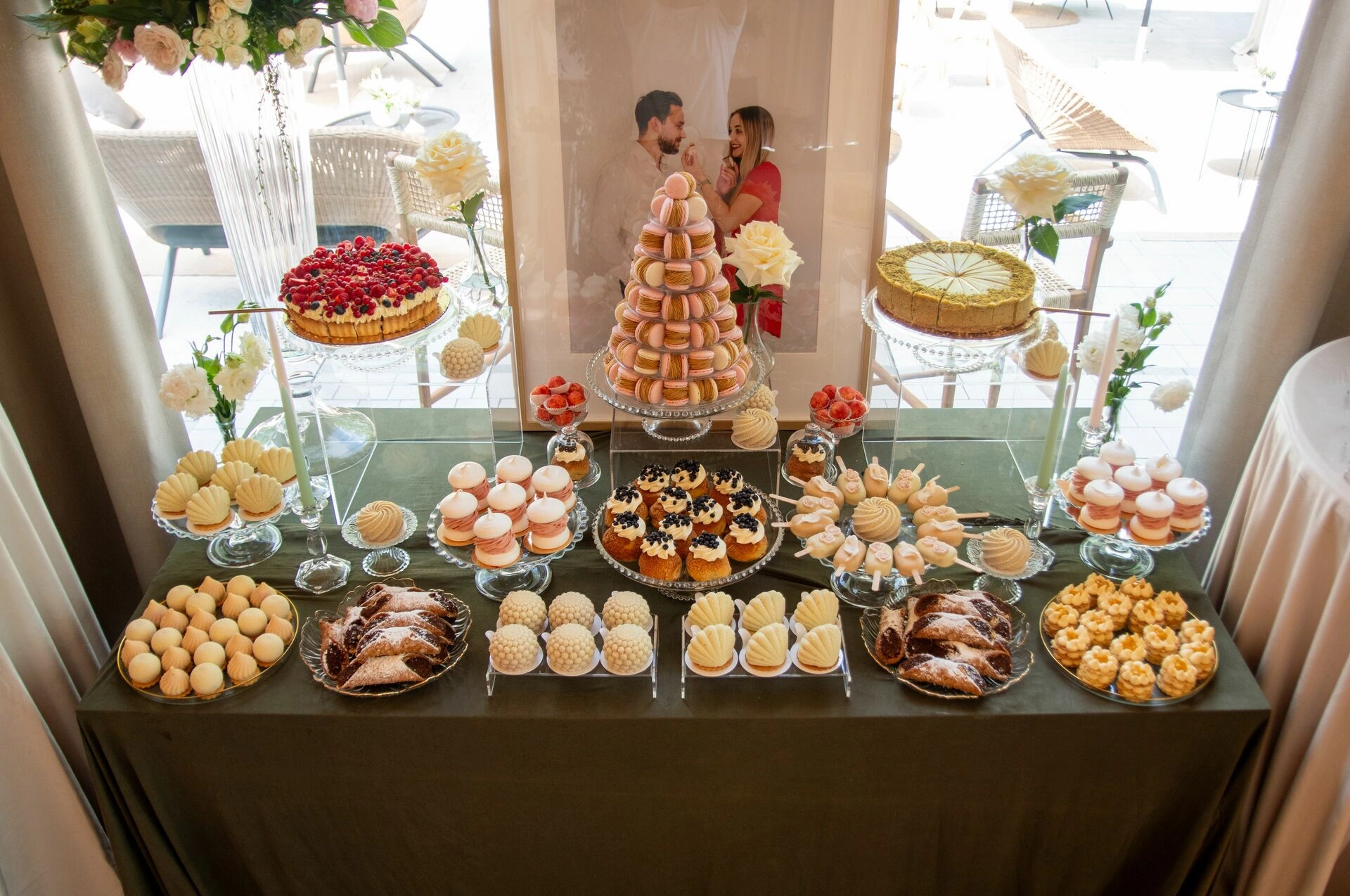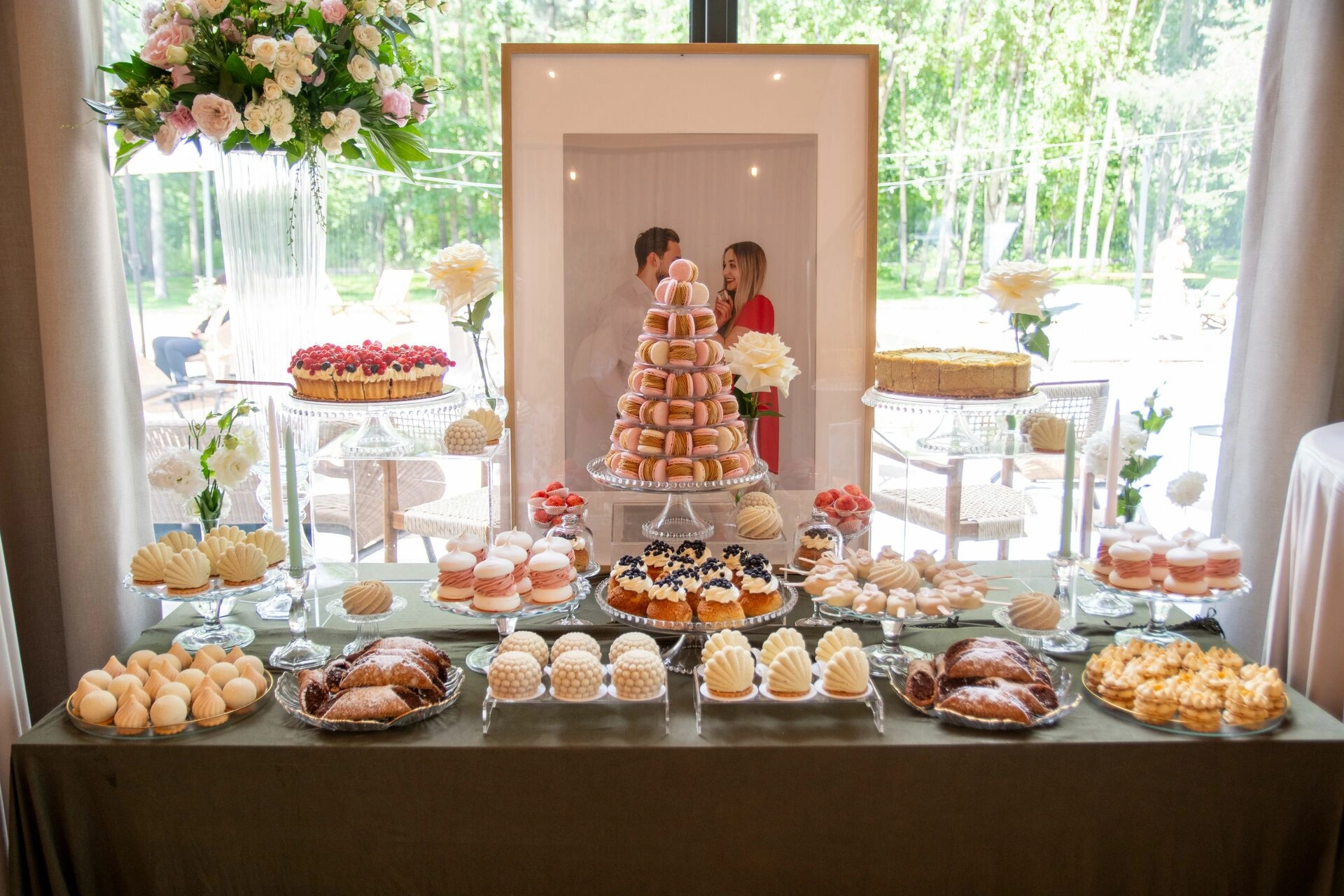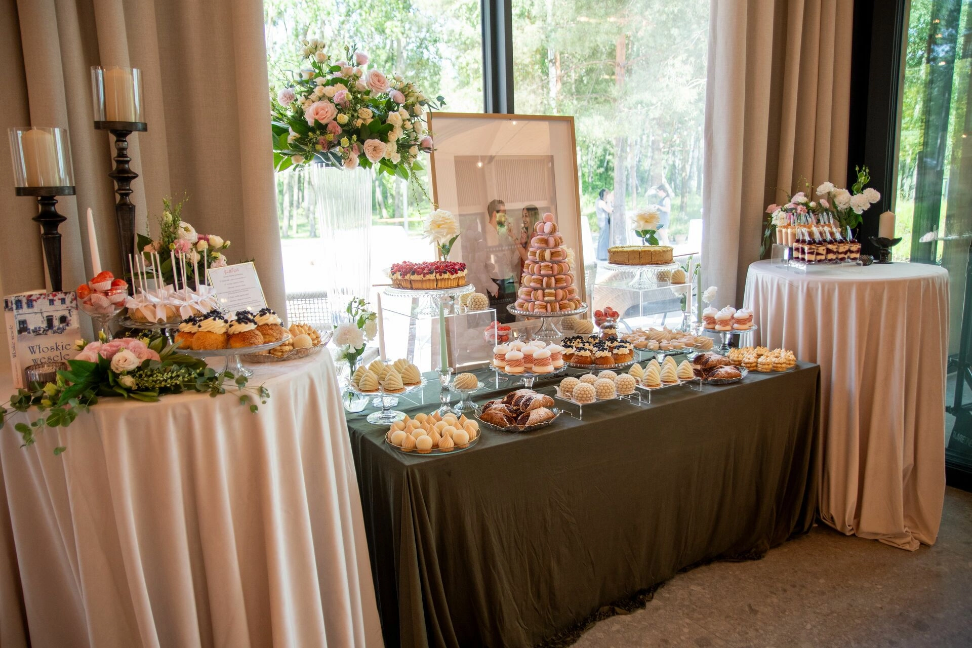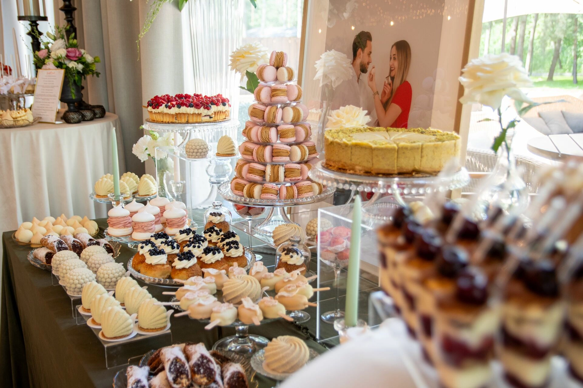 Słodki stół został zaaranżowany z dbałością o detale – kryształowe patery, świeże kwiaty, świece, tkaniny w delikatnych odcieniach i subtelna oprawa zdjęciowa Pary Młodej. To nie tylko candy bar – to scena z filmu. Kadry, które pachną miłością, smakiem i zachwytem.