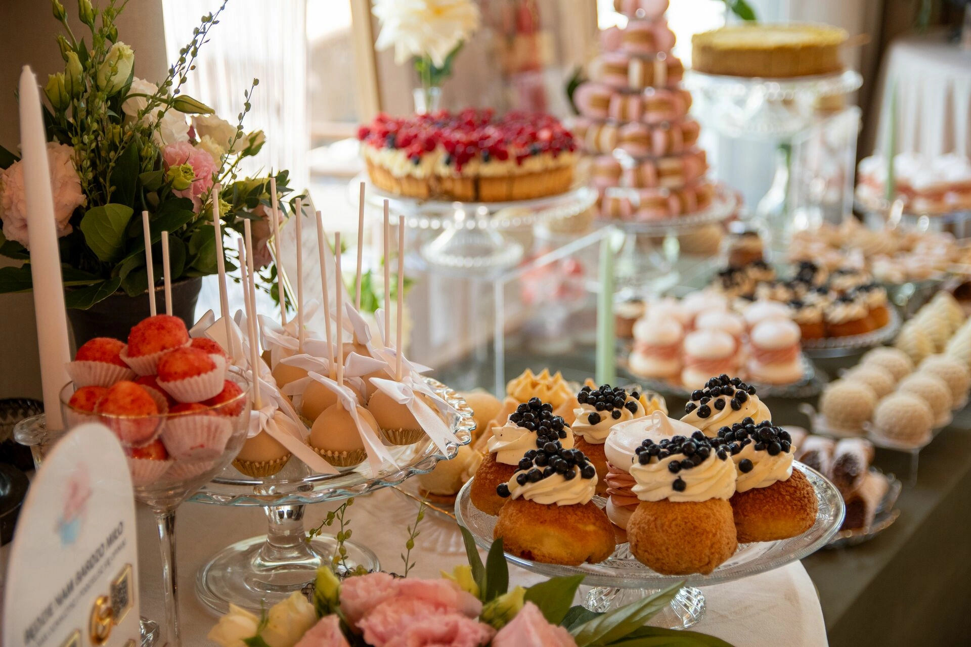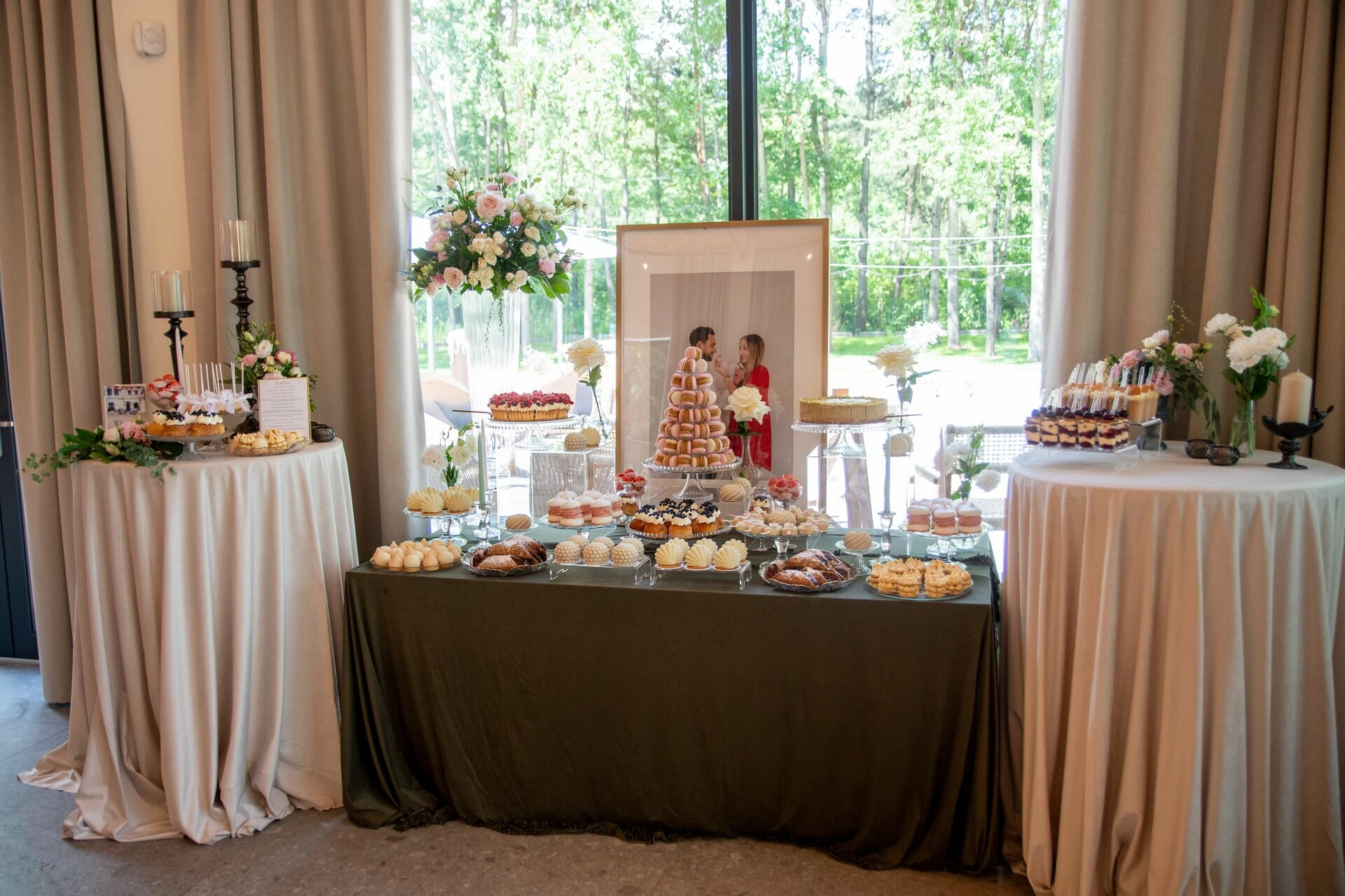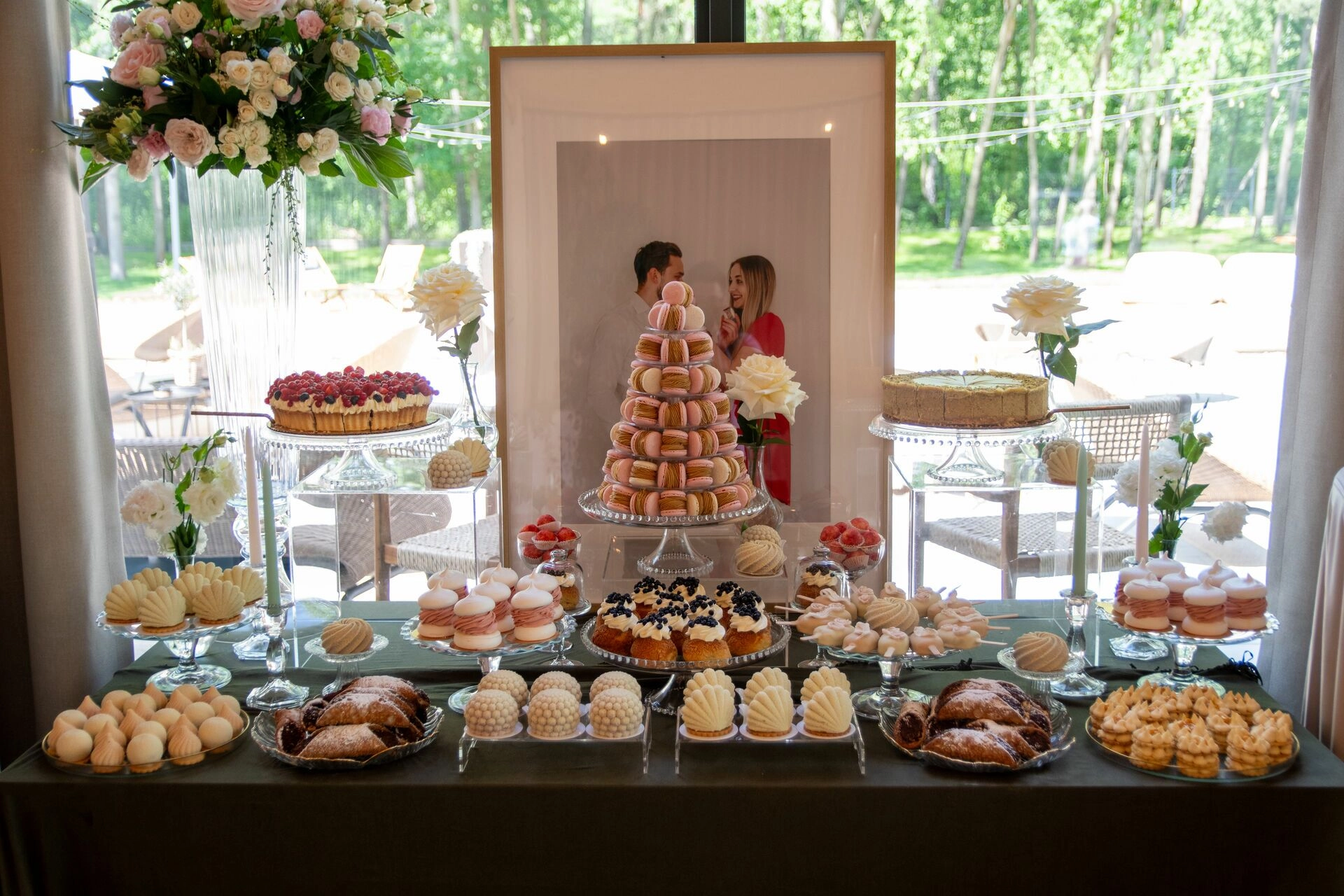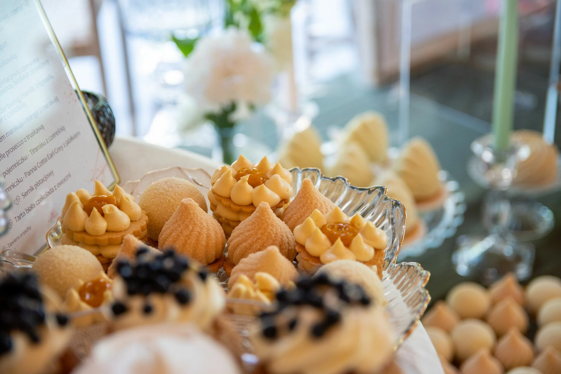 Słodki stół został zaaranżowany z dbałością o detale – kryształowe patery, świeże kwiaty, świece, tkaniny w delikatnych odcieniach i subtelna oprawa zdjęciowa Pary Młodej. To nie tylko candy bar – to scena z filmu. Kadry, które pachną miłością, smakiem i zachwytem.