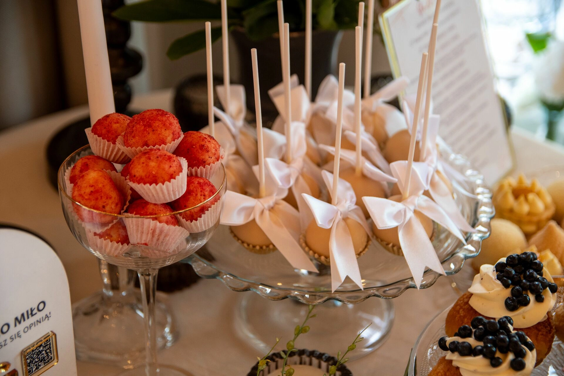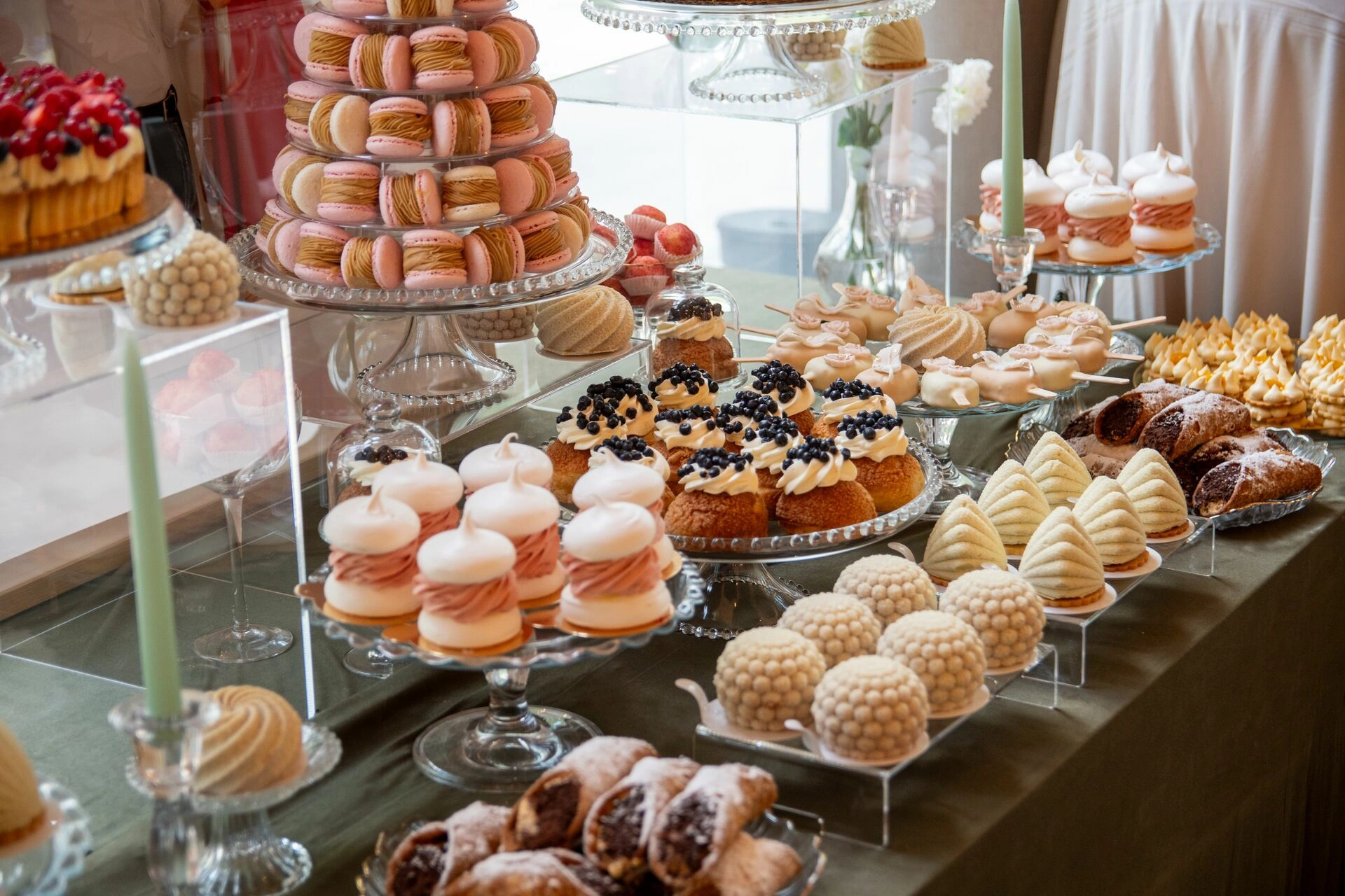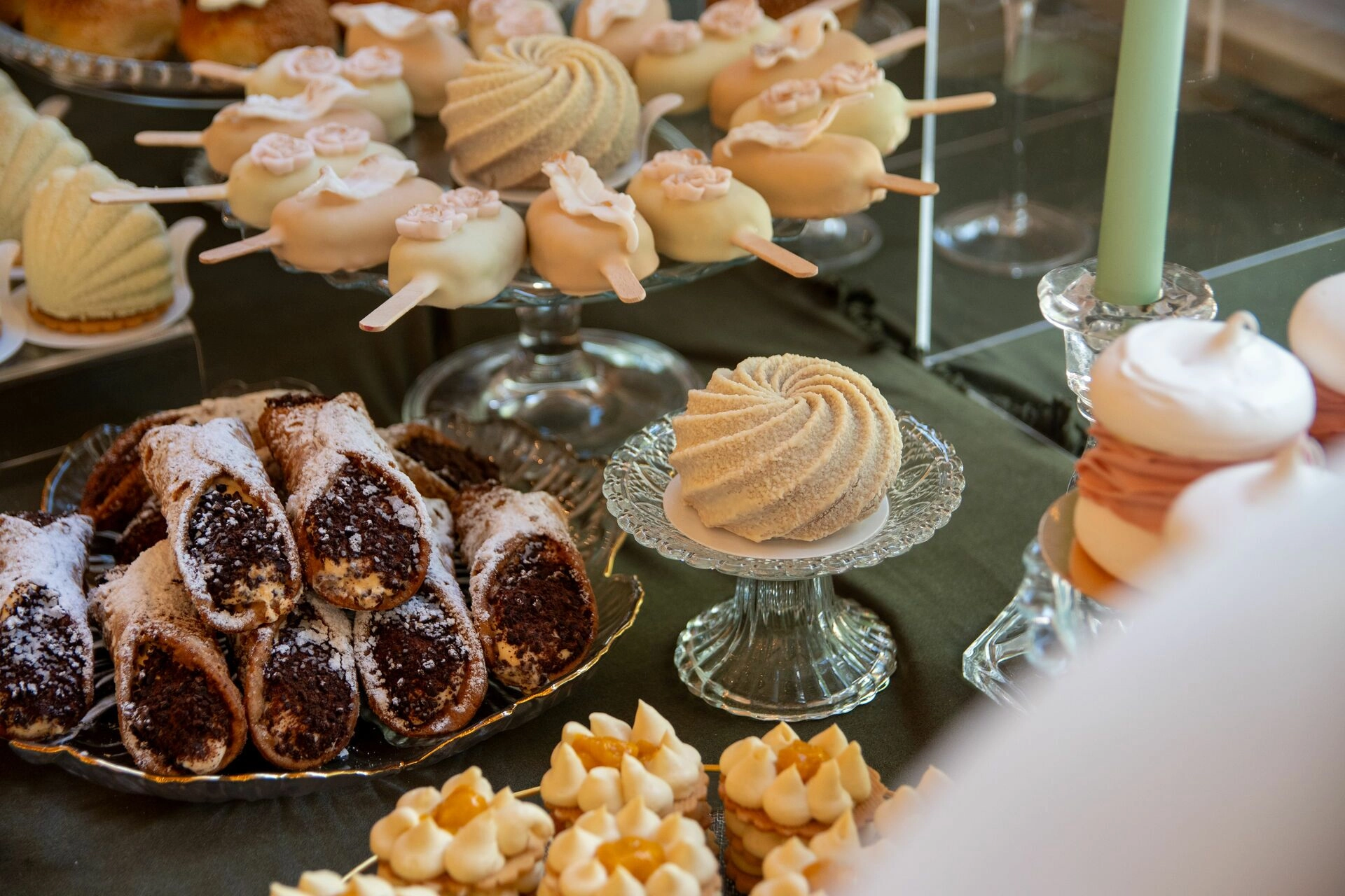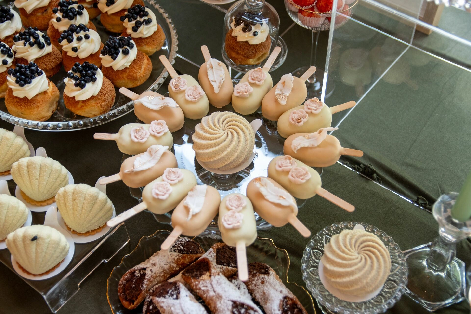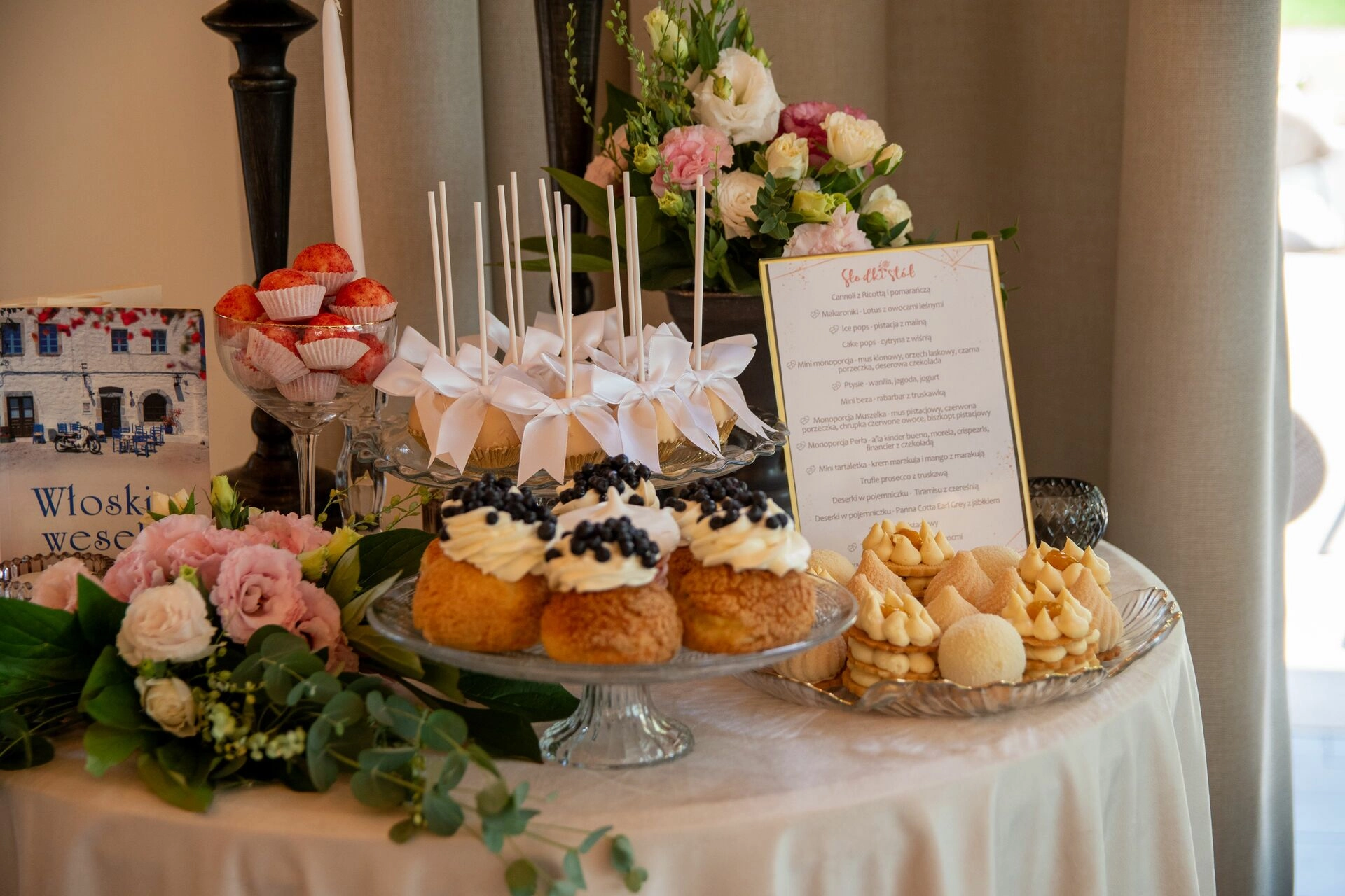 Z myślą o gościach szukających orzeźwienia przygotowaliśmy ice popsy pistacjowo-malinowe, a dla tych, którzy kochają klasykę – cake popsy cytrynowo-wiśniowe oraz cannoli z ricottą i skórką pomarańczową, prosto z sycylijskiej tradycji. Całość dopełniały trufle prosecco z truskawką, sernik pistacjowy i tarta z białą czekoladą i owocami – słodkie akcenty zamykające całą kompozycję z włoską gracją.