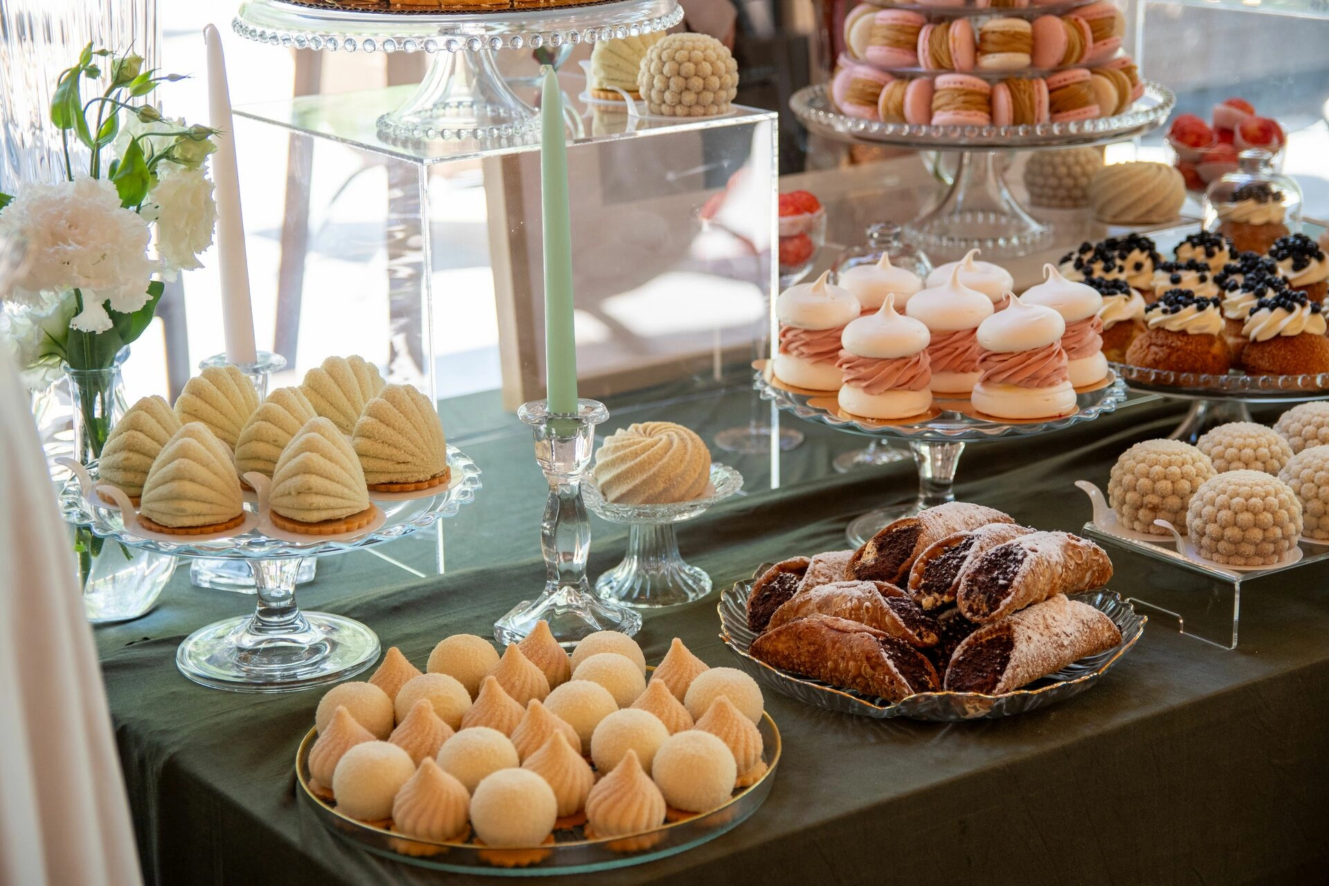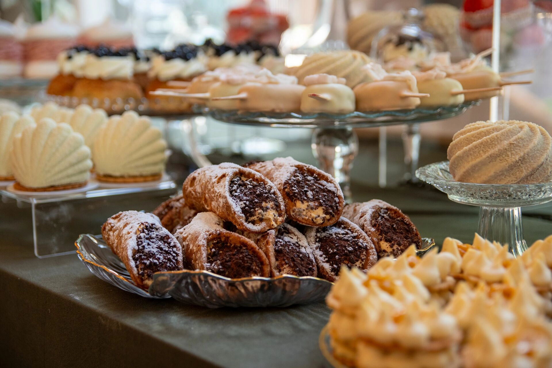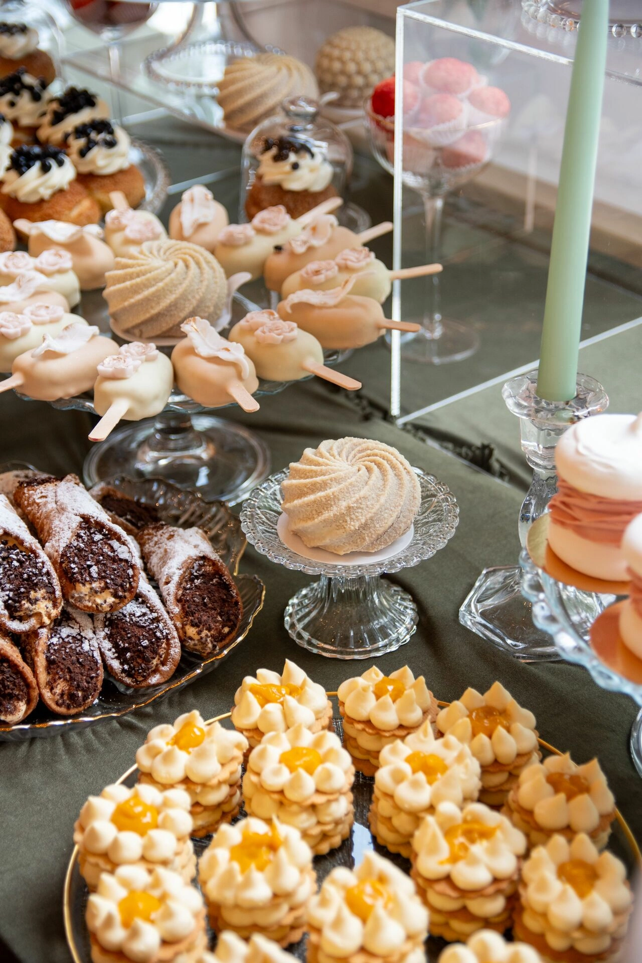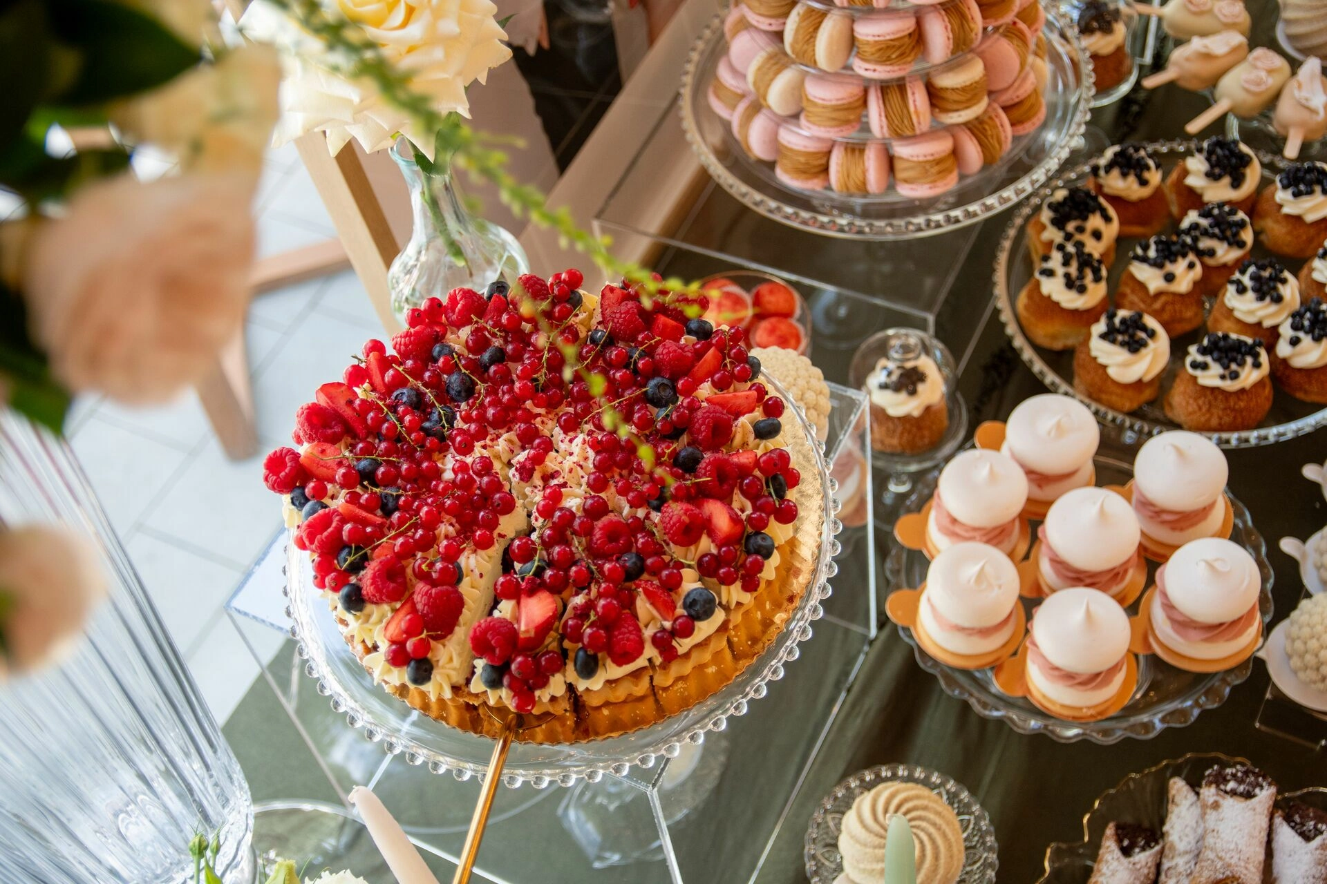 Z myślą o gościach szukających orzeźwienia przygotowaliśmy ice popsy pistacjowo-malinowe, a dla tych, którzy kochają klasykę – cake popsy cytrynowo-wiśniowe oraz cannoli z ricottą i skórką pomarańczową, prosto z sycylijskiej tradycji. Całość dopełniały trufle prosecco z truskawką, sernik pistacjowy i tarta z białą czekoladą i owocami – słodkie akcenty zamykające całą kompozycję z włoską gracją.